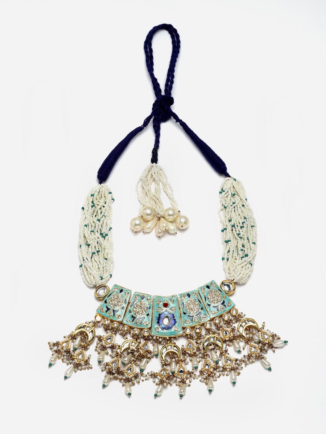 Firoza Meenkari With Pearl Droplets And Kundan Work With Handmade Dori ; Category Of Jewellery Is Necklace; Sub Category Is Haar; Ideal For Women; Color Is Blue, Cream, Gold, White; Gemstones Used - Kundan, Pearls, Natural Stones; Plating Is Gold-Plated; Base Metal Is Alloy; Other Material Used - Adjustable Dori; Size Is Freesize; Adjustable - Yes; Weight Is 139 Gms; Mesaurements - Length Of Necklace =50 Cm; Width Of Necklace = 9.4 Cm; Adjustable - Yes; Content 1 Necklace