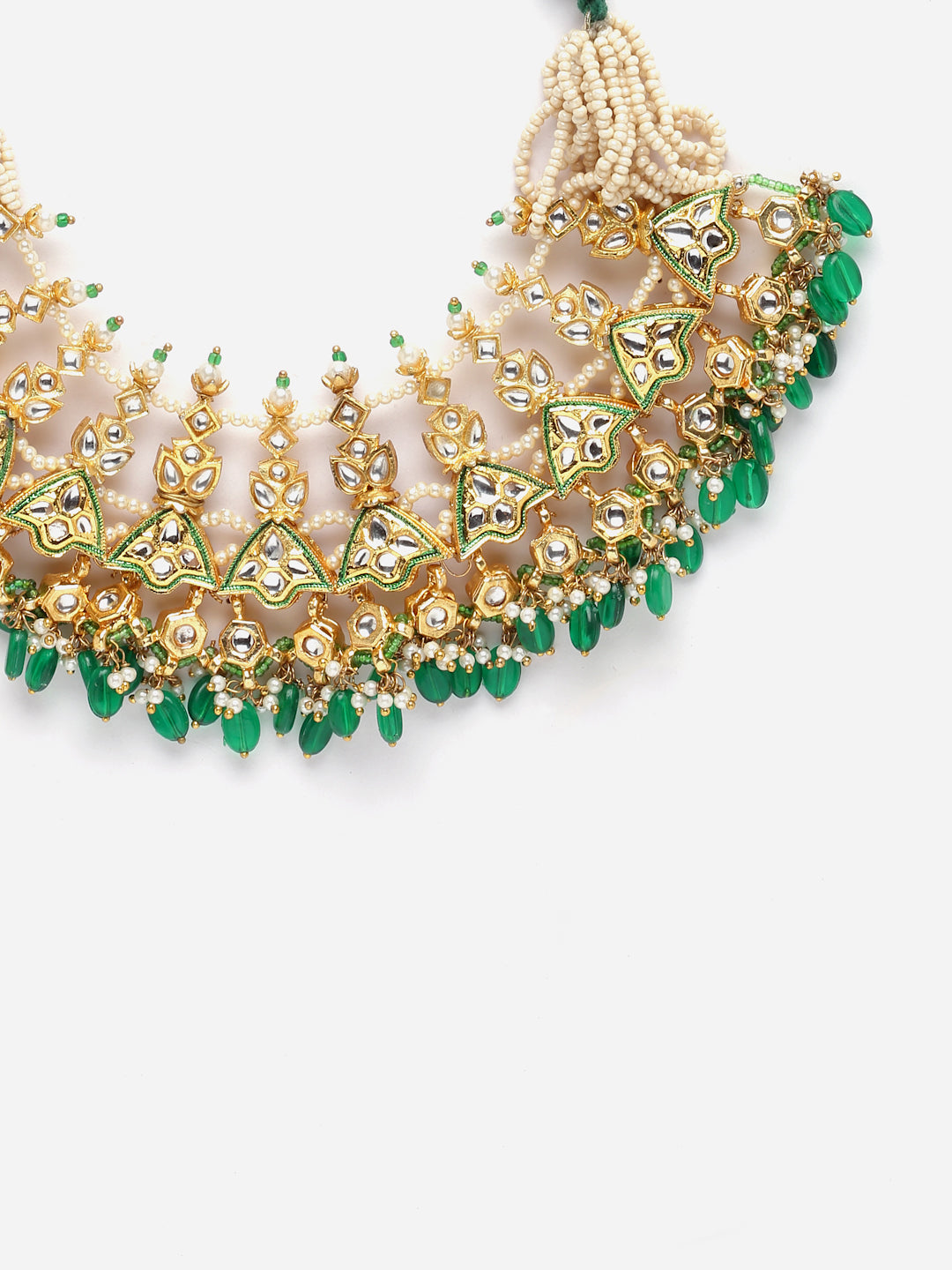 Andcrafted Kundan And Tinch Of Pearl And Green Makes This Pc Unique And Stylish; Category Of Jewellery Is Necklace; Sub Category Is Haar; Ideal For Women; Color Is Green, Gold, Cream, White; Gemstones Used - Kundan, Pearls, Natural Stones, Faux Emerald; Plating Is Gold-Plated; Base Metal Is Alloy; Other Material Used - Adjustable Dori; Size Is Freesize; Adjustable - Yes; Weight Is 118 Gms; Mesaurements - Length Of Necklace =40 Cm; Width Of Necklace = 6 Cm; Adjustable - Yes; Content 1 Necklace