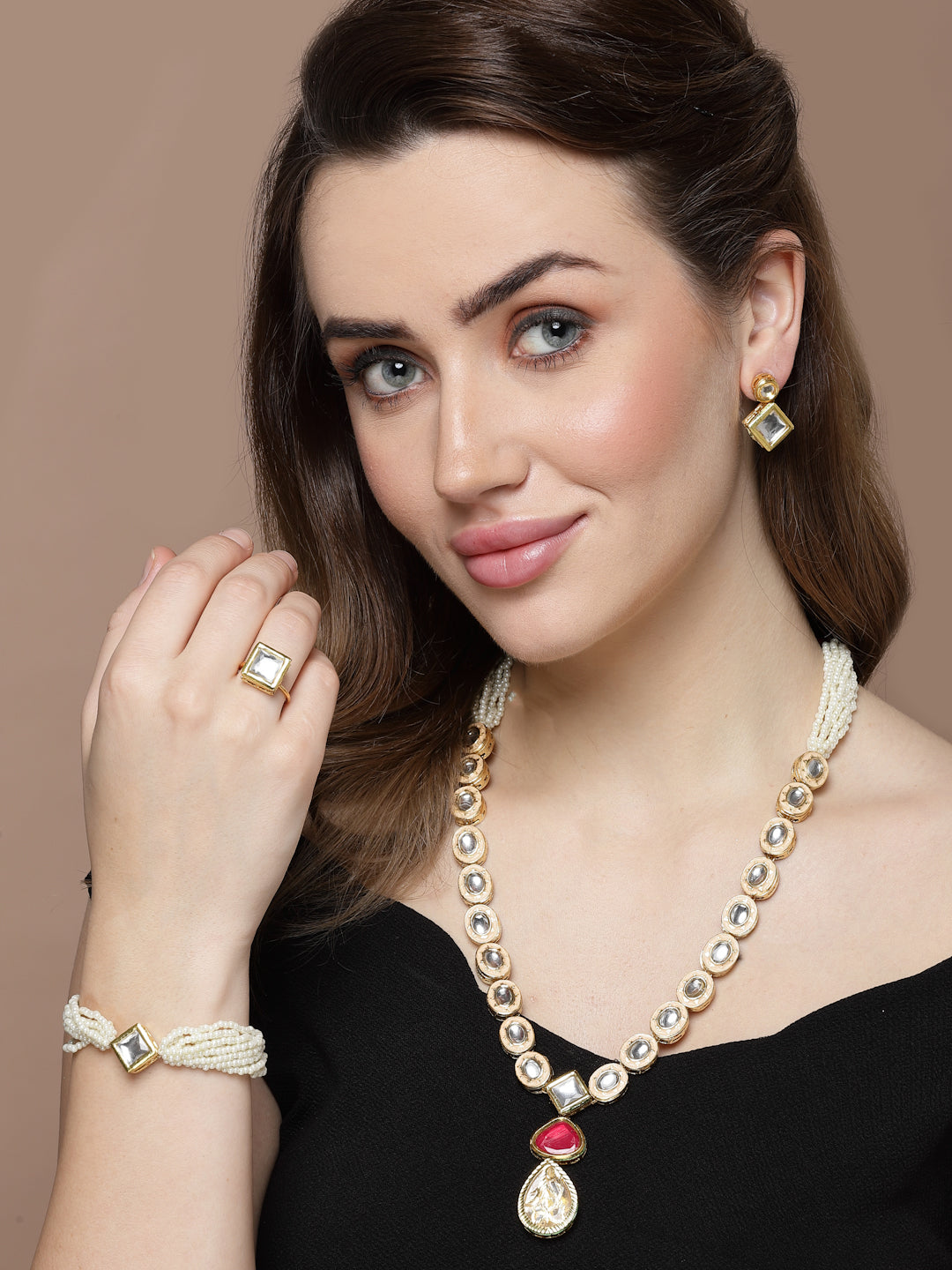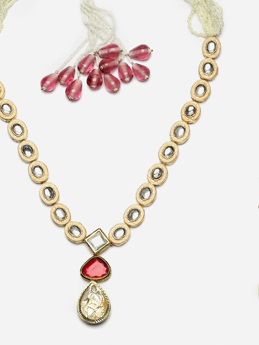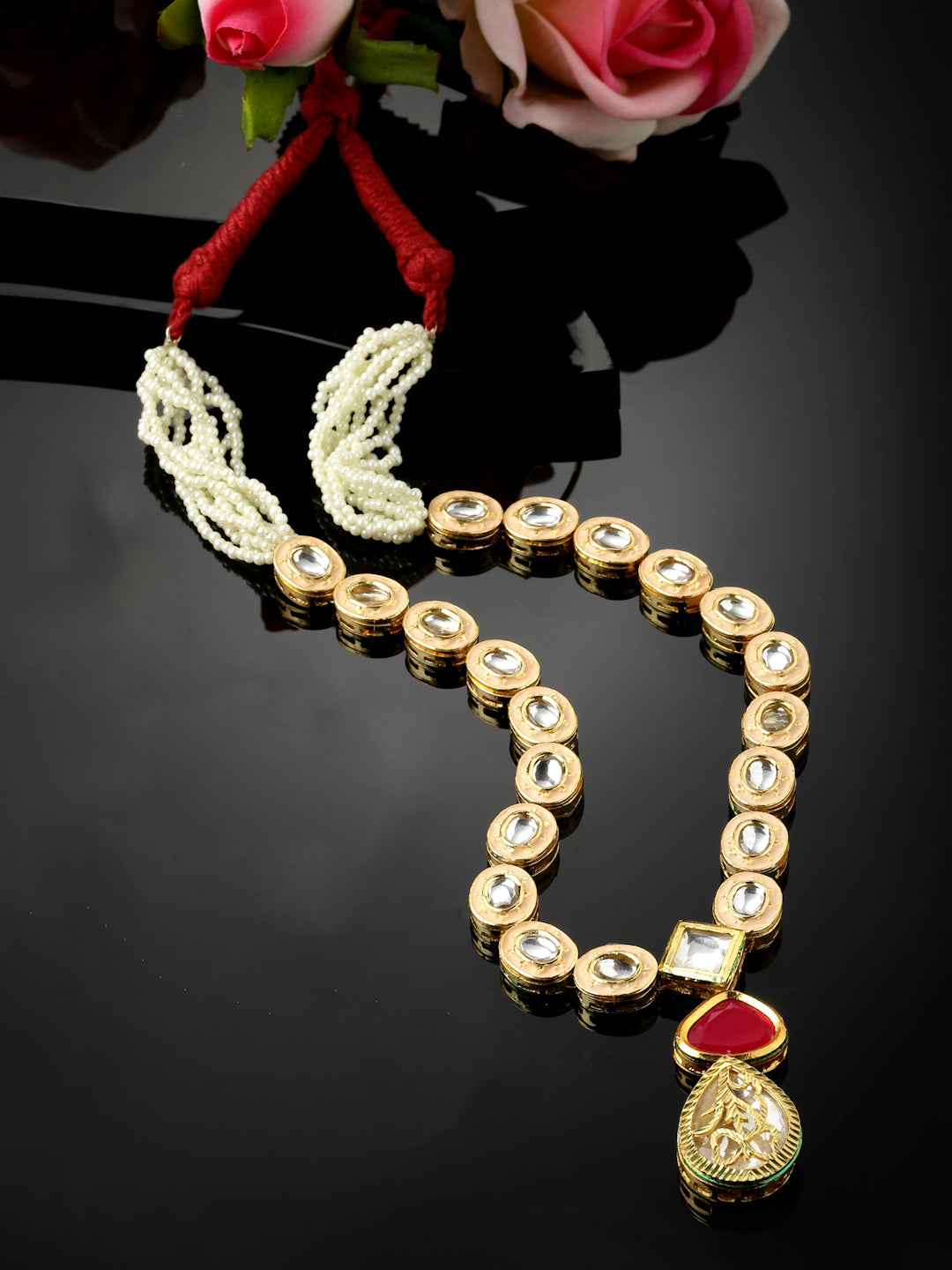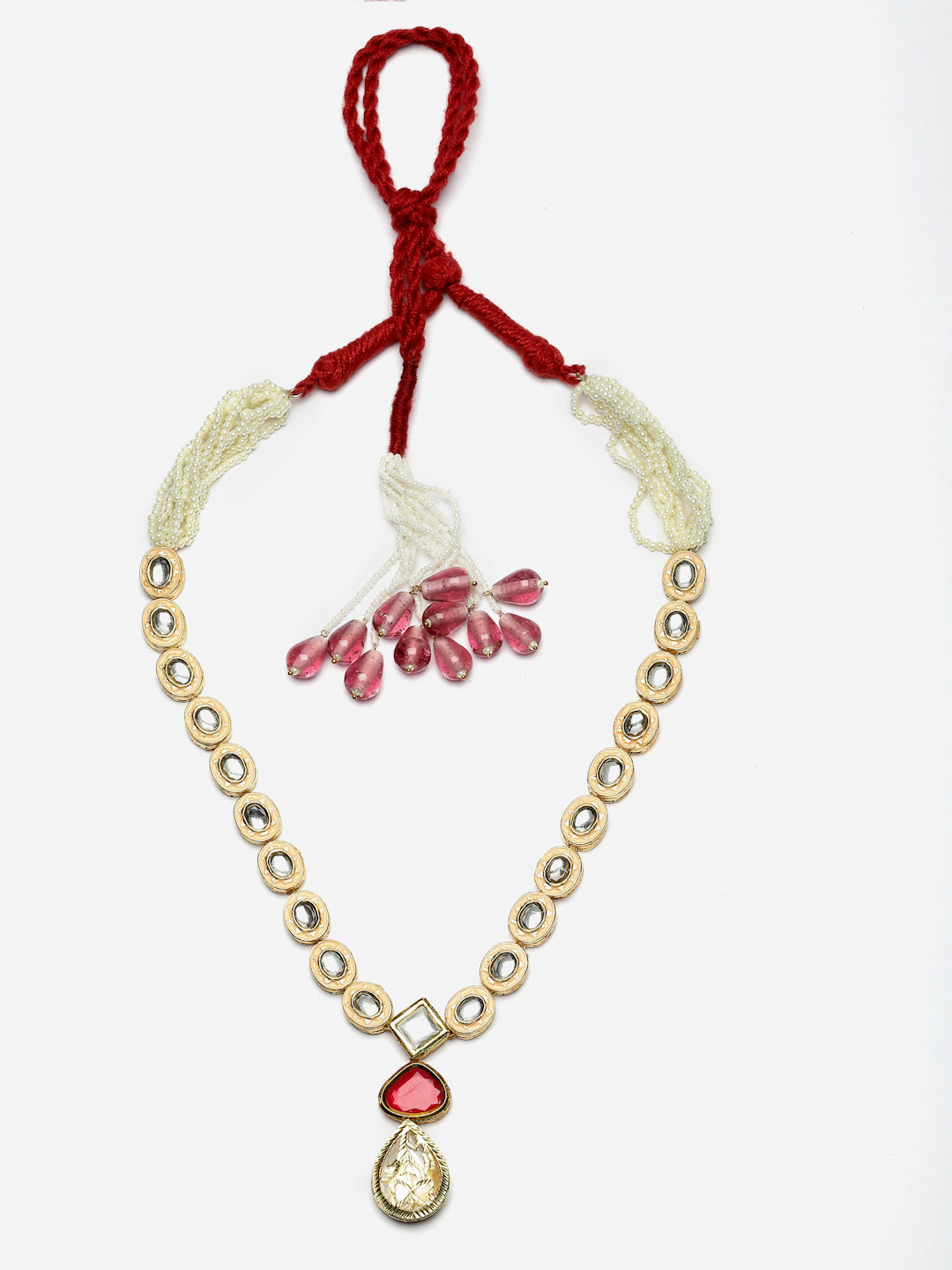 Sabya Inspired Neck Pc With Unique Handcrafted Kundan And Classy Effect; Category Of Jewellery Is Necklace; Sub Category Is Haar; Ideal For Women; Color Is Red, Pink, Cream, Gold, White; Gemstones Used - Kundan, Pearls, Natural Stones; Plating Is Gold-Plated; Base Metal Is Alloy; Other Material Used - Adjustable Dori; Size Is Freesize; Adjustable - Yes; Weight Is 92 Gms; Mesaurements - Length Of Necklace =74 Cm; Width Of Necklace = 2.4 Cm; Adjustable - Yes; Content 1 Necklace
