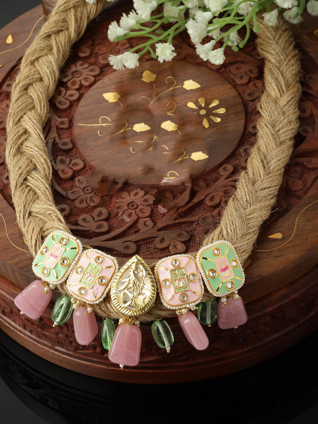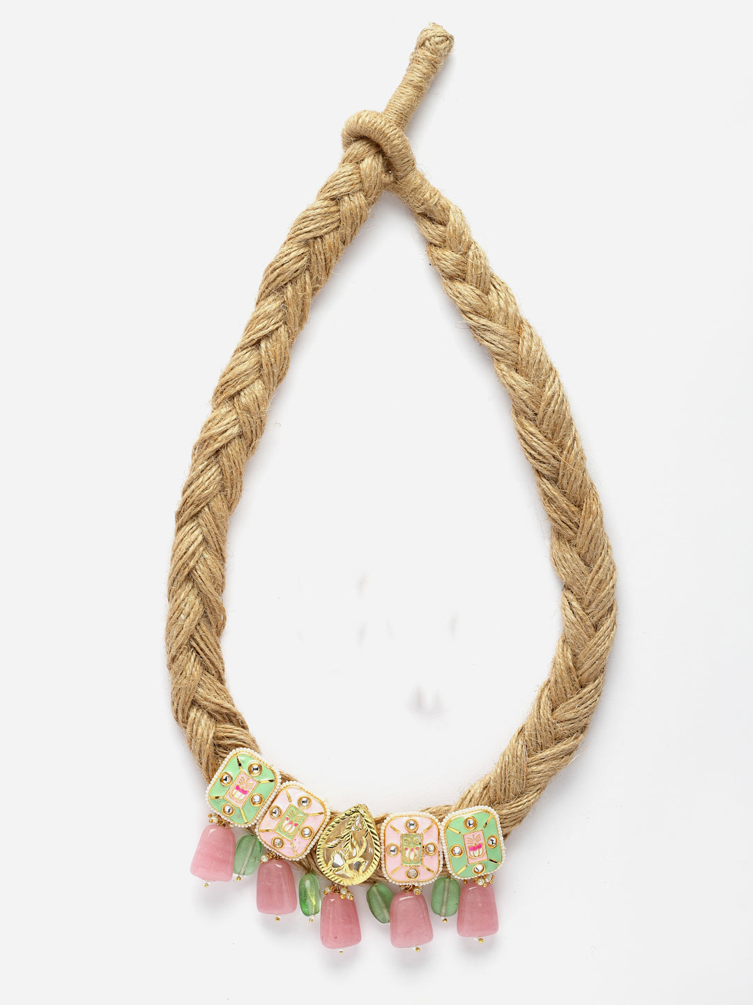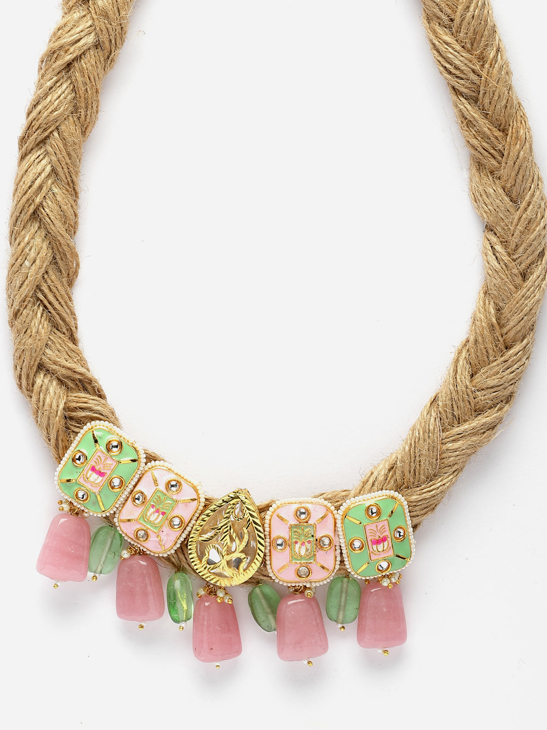 Colors Of Season And Jute In The Chique Pc Of Jewellery; Category Of Jewellery Is Necklace; Sub Category Is Haar; Ideal For Women; Color Is Green, Pink, Brown, Gold, White; Gemstones Used - Kundan, Pearls, Natural Stones; Plating Is Gold-Plated; Base Metal Is Alloy; Other Material Used - None; Size Is Freesize; Adjustable - No; Weight Is 60 Gms; Mesaurements - Length Of Necklace =60 Cm; Width Of Necklace = 2.3 Cm; Adjustable - No; Content 1 Necklace