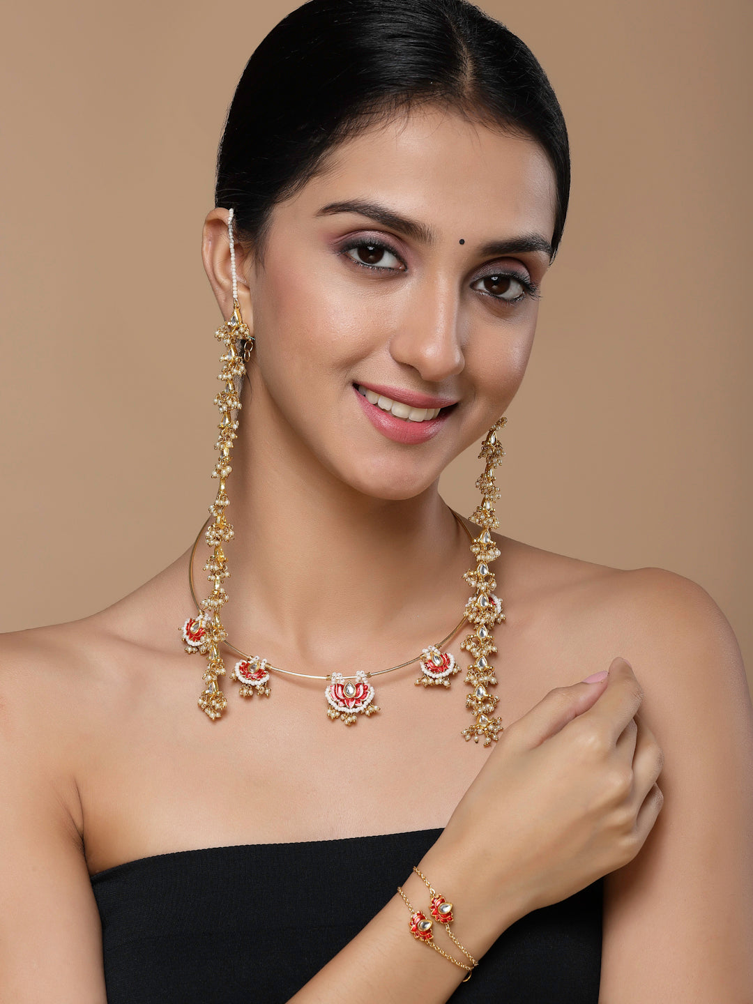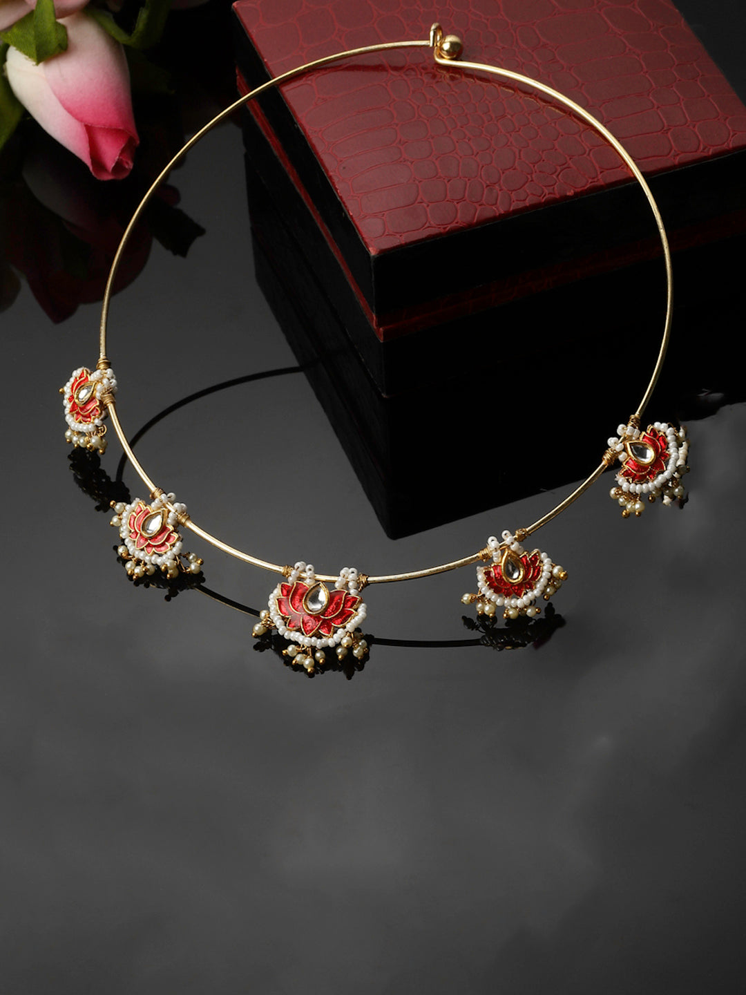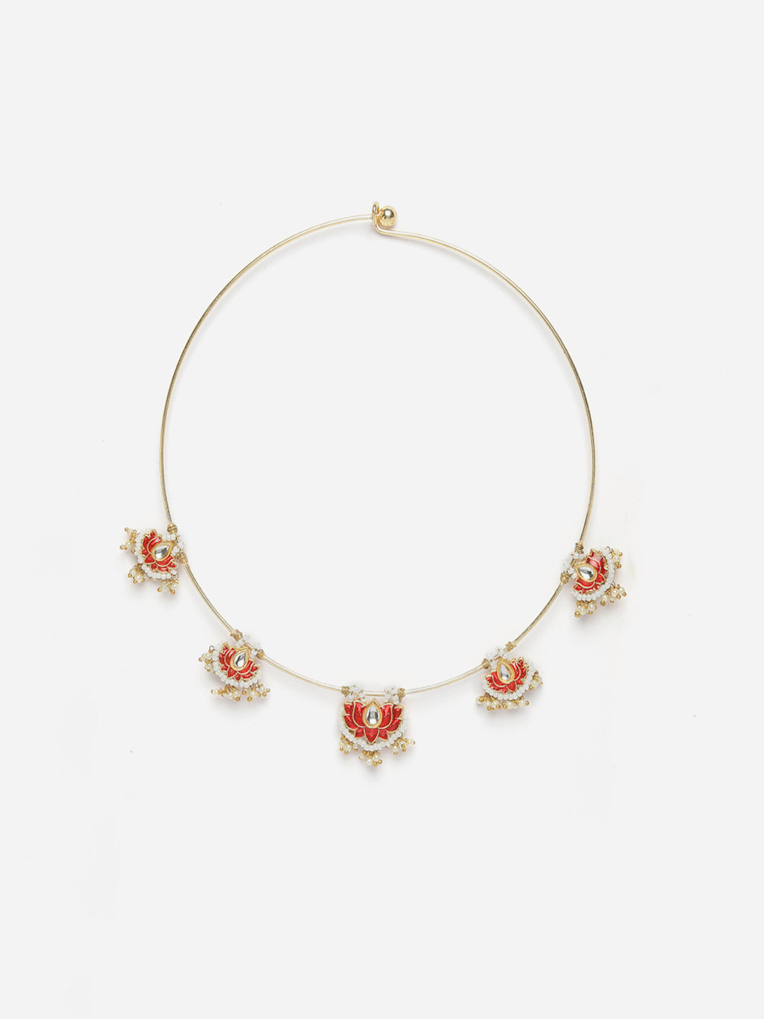 Red Meenakari Lotus Pc In Kantha Gold Polish And Highlighted With Pearls Gives Elegant And Classic Pc For Todays Generation; Category Of Jewellery Is Necklace; Sub Category Is Haar; Ideal For Women; Color Is Red, Gold, White; Gemstones Used - Kundan, Pearls, Natural Stones; Plating Is Gold-Plated; Base Metal Is Alloy; Other Material Used - None; Size Is Freesize; Adjustable - No; Weight Is 19 Gms; Mesaurements - Length Of Necklace =38 Cm; Width Of Necklace = 18 Cm; Adjustable - No; Content 1 Necklace