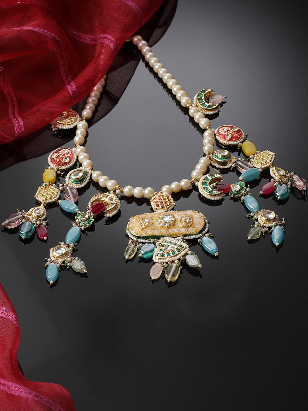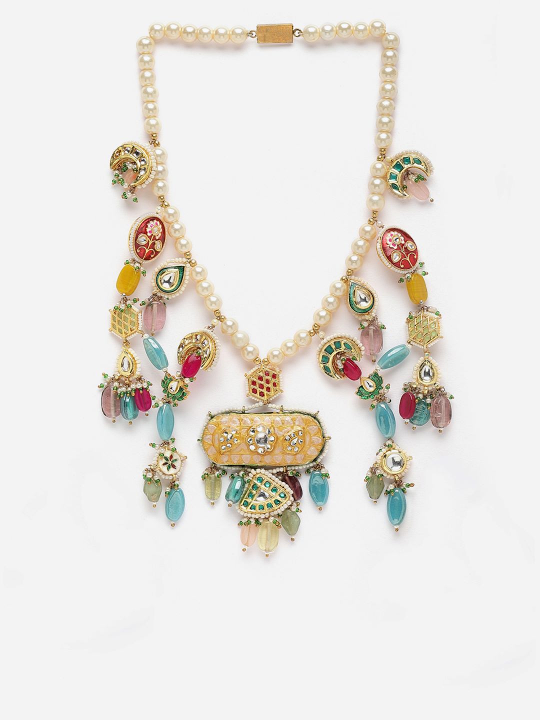 Multi Color Neck Pc And Multi Color And Styled Pearl Neck Pc; Category Of Jewellery Is Necklace; Sub Category Is Haar; Ideal For Women; Color Is Peach, Red, Green, Yellow, Pink, Blue, Cream, Purple, Brown, Gold, White; Gemstones Used - Kundan, Pearls, Natural Stones; Plating Is Gold-Plated; Base Metal Is Alloy; Other Material Used - None; Size Is Freesize; Adjustable - No; Weight Is 126 Gms; Mesaurements - Length Of Necklace =54 Cm; Width Of Necklace = 10 Cm; Adjustable - No; Content 1 Necklace