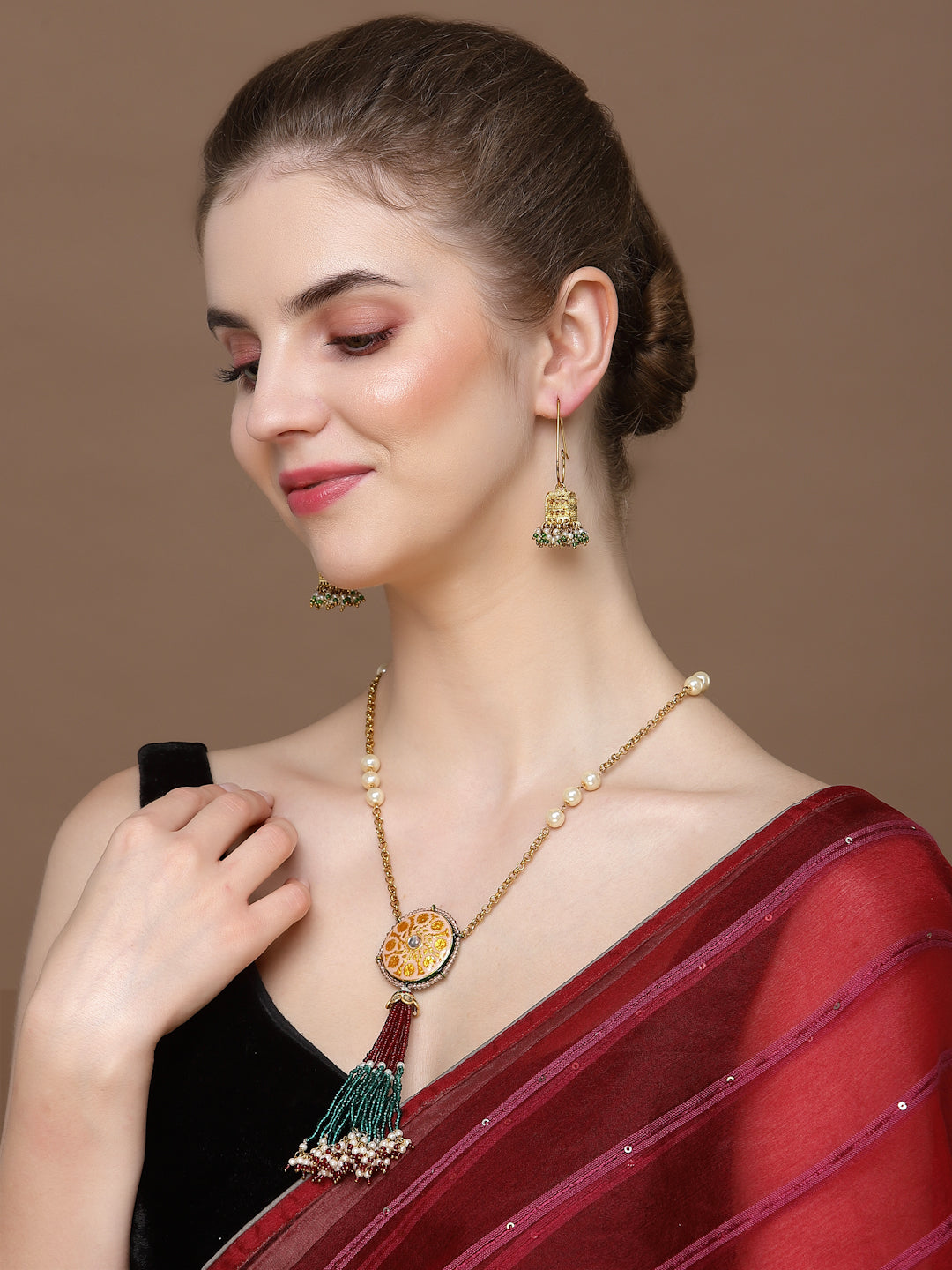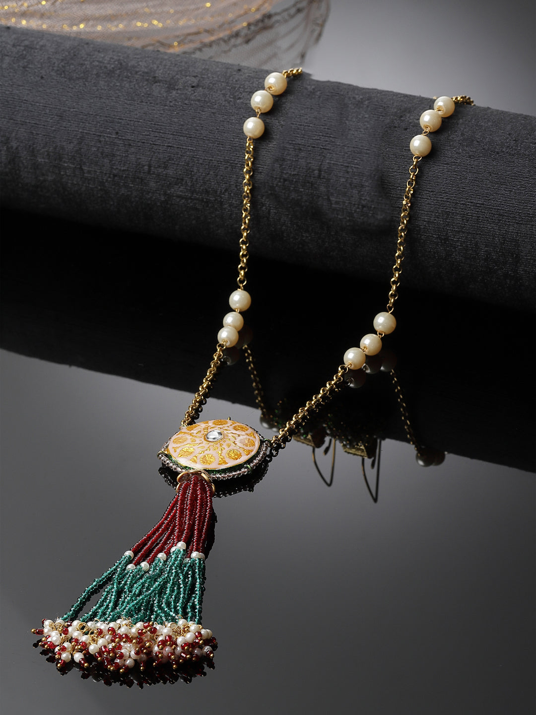 Meenakari And Pearl Droplets In Chain Neck Pc; Category Of Jewellery Is Necklace; Sub Category Is Haar; Ideal For Women; Color Is Red, Green, Blue, Yelow, Purple, Peach, Brown, Gold, Silver, White; Gemstones Used - Kundan, Pearls, Natural Stones; Plating Is Gold-Plated; Base Metal Is Alloy; Other Material Used - Long Chain; Size Is Freesize; Adjustable - No; Weight Is 64 Gms; Mesaurements - Length Of Necklace =80 Cm; Width Of Necklace = 5 Cm; Adjustable - No; Content 1 Necklace