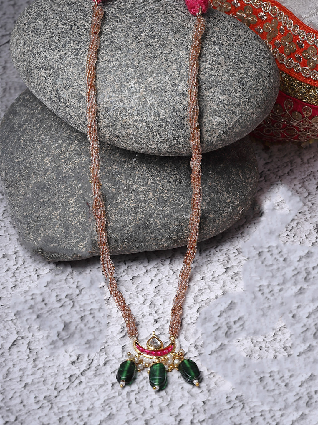 Chand Neck Pc; Category Of Jewellery Is Necklace; Sub Category Is Haar; Ideal For Women; Color Is Pink, Green, Brown, Gold, Cream, White; Gemstones Used - Kundan, Pearls, Natural Stones, Faux Emerald; Plating Is Gold-Plated; Base Metal Is Alloy; Other Material Used - Adjustable Dori; Size Is Freesize; Adjustable - Yes ; Weight Is 22 Gms; Mesaurements - Length Of Necklace =61 Cm; Width Of Necklace = 1.9 Cm; Adjustable - Yes ; Content 1 Necklace