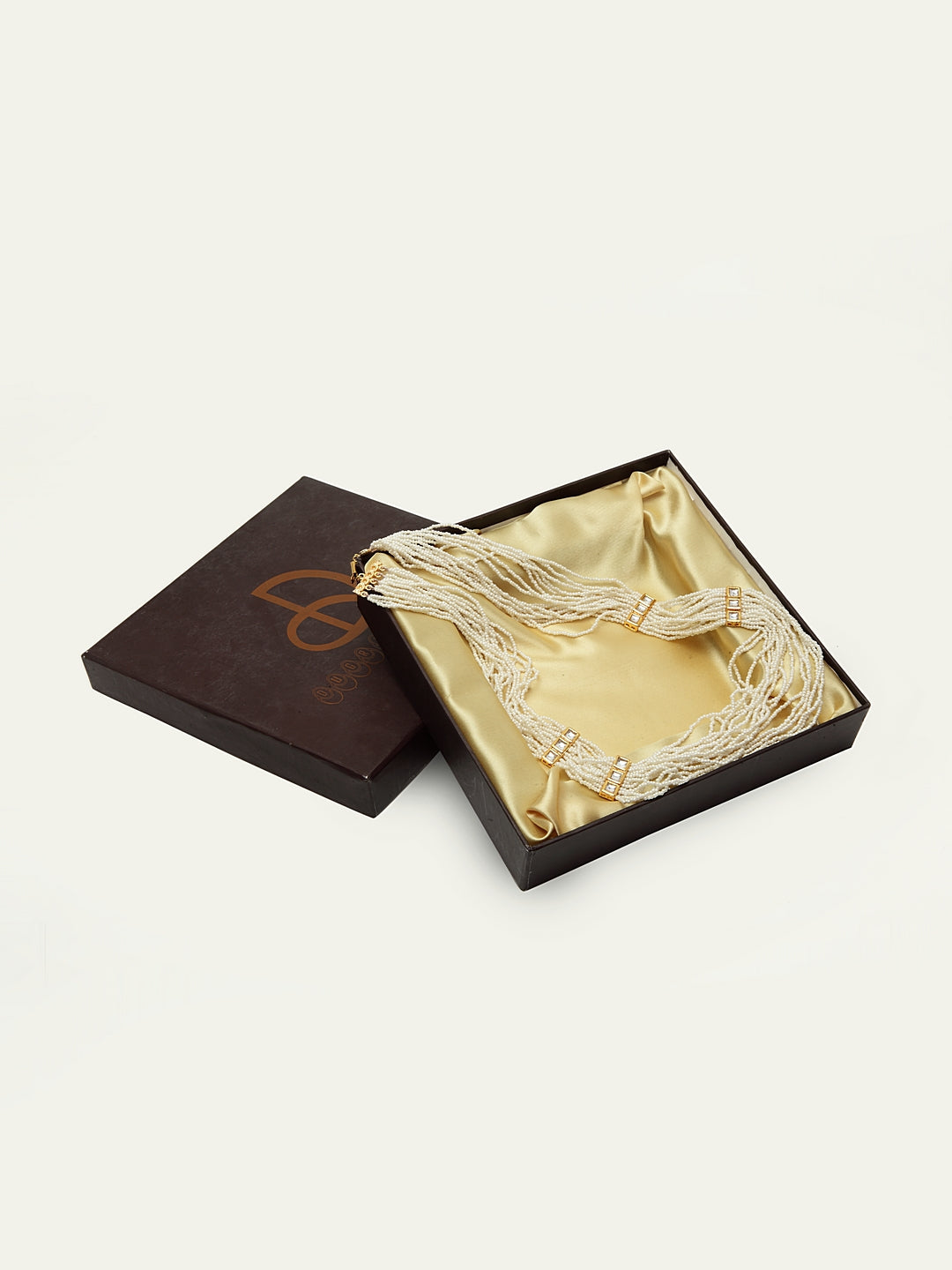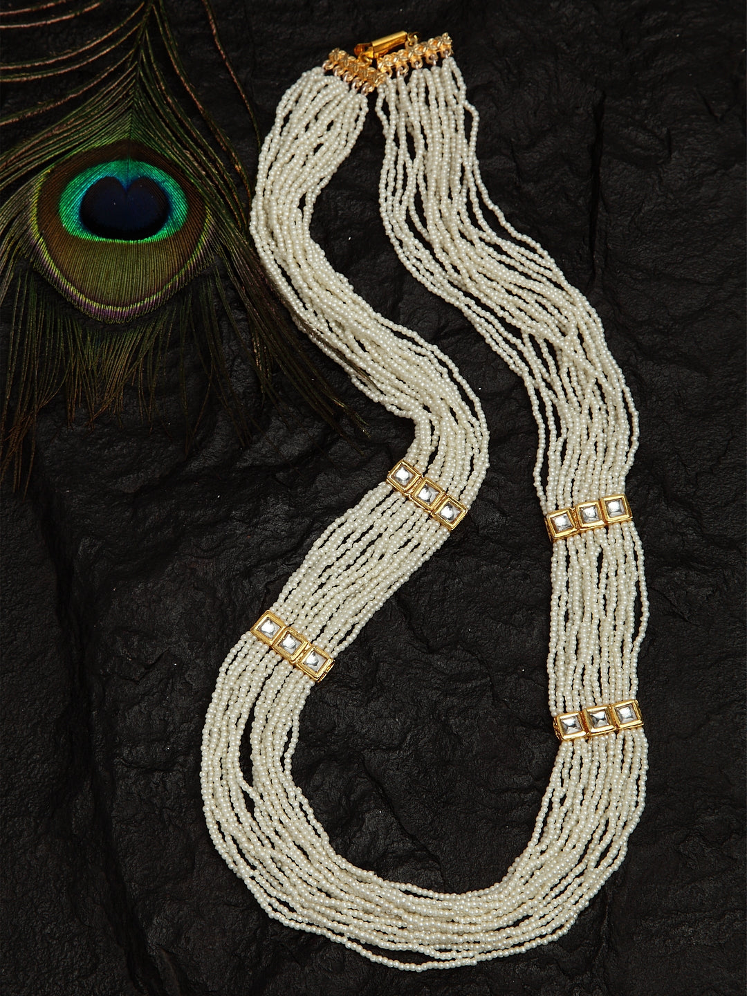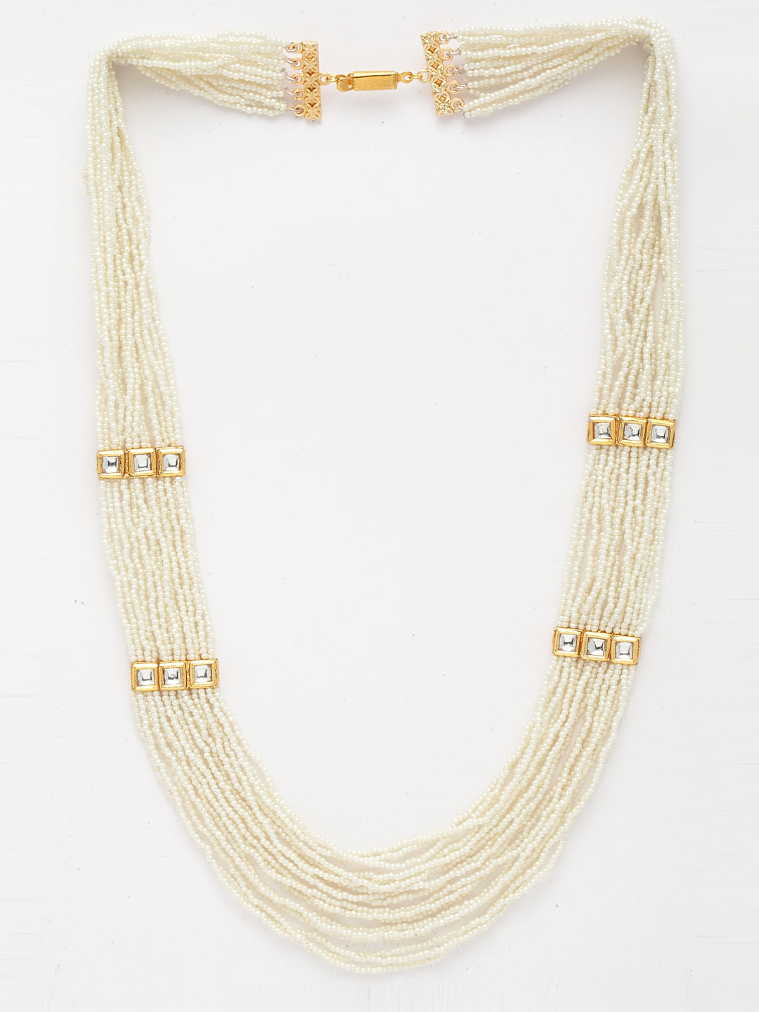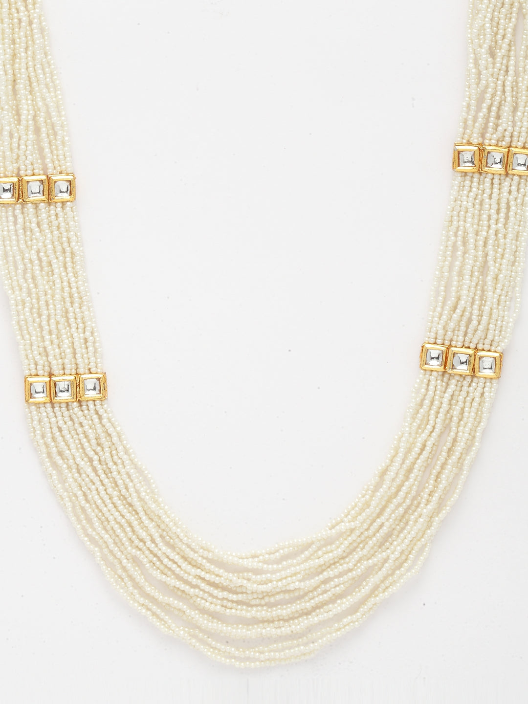 White & Layered Necklace With Kundan & Pearls; Category Of Jewellery Is Necklace; Sub Category Is Layered; Ideal For Women; Base Color Is White; Gemstones Used - Kundan, Pearls, Natural Stones, Semi- Precious Stones; Plating Is Gold-Plated; Base Metal Is Alloy; Other Material Used - Copper Box Clasp Lock; Size Is Freesize; Adjustable - No; Weight Is Gms; Mesaurements - Length Of Necklace =86.3 Cm; Width Of Necklace = 5 Cm; Content 1 Necklace