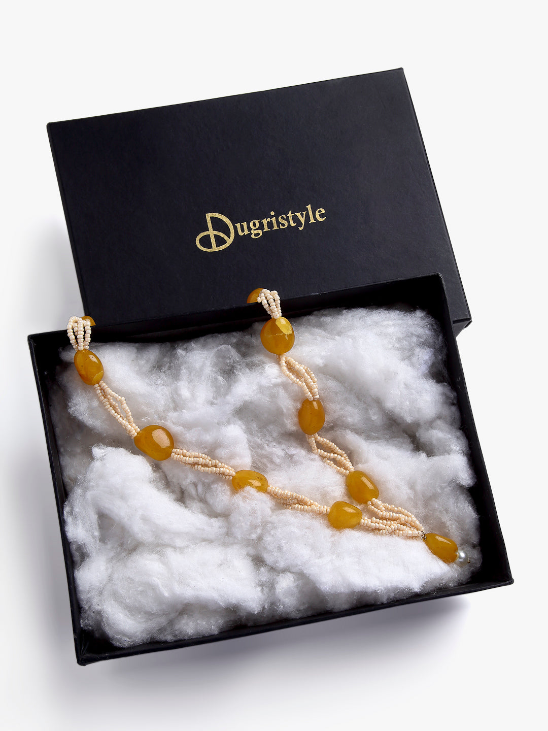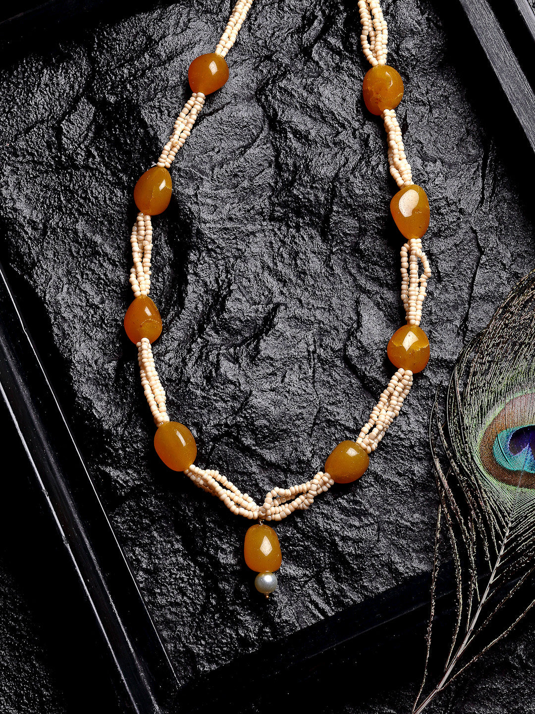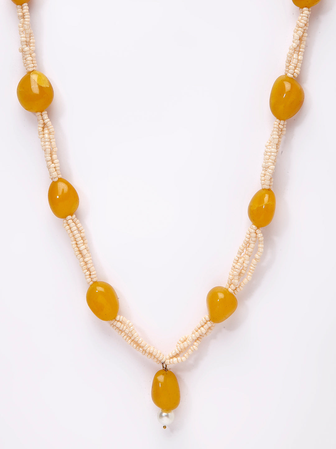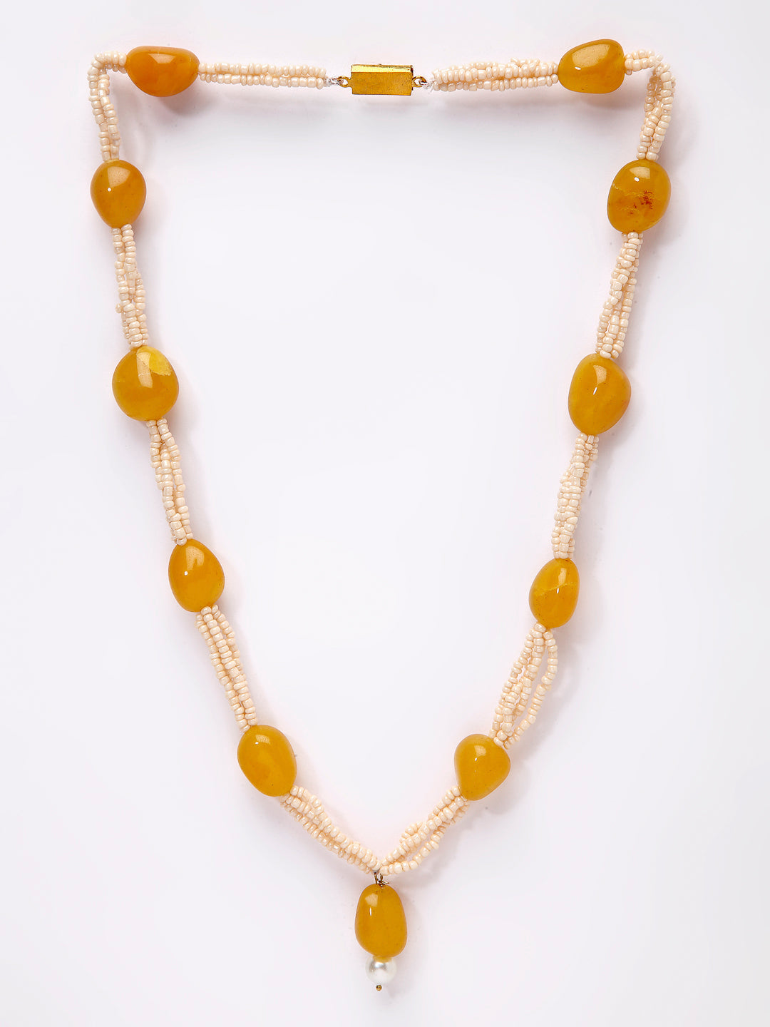 Yellow & White Layered Necklace With Pearls & Natural Stones; Category Of Jewellery Is Necklace; Sub Category Is Layered; Ideal For Women; Color Is Yellow, White, Gold; Gemstones Used - Pearls, Natural Stones, Yelllow Sapphire; Plating Is Gold-Plated; Base Metal Is Alloy; Other Material Used - None; Size Is Freesize; Adjustable - No; Weight Is 70 Gms; Mesaurements - Length Of Necklace =56 Cm; Width Of Necklace = 1.5 Cm; Adjustable - No; Content 1 Necklace
