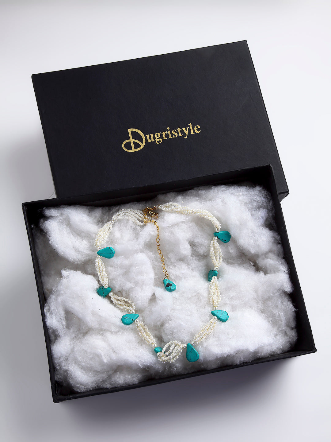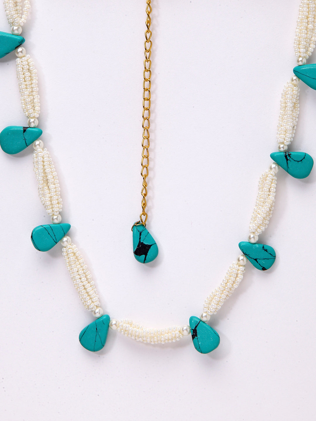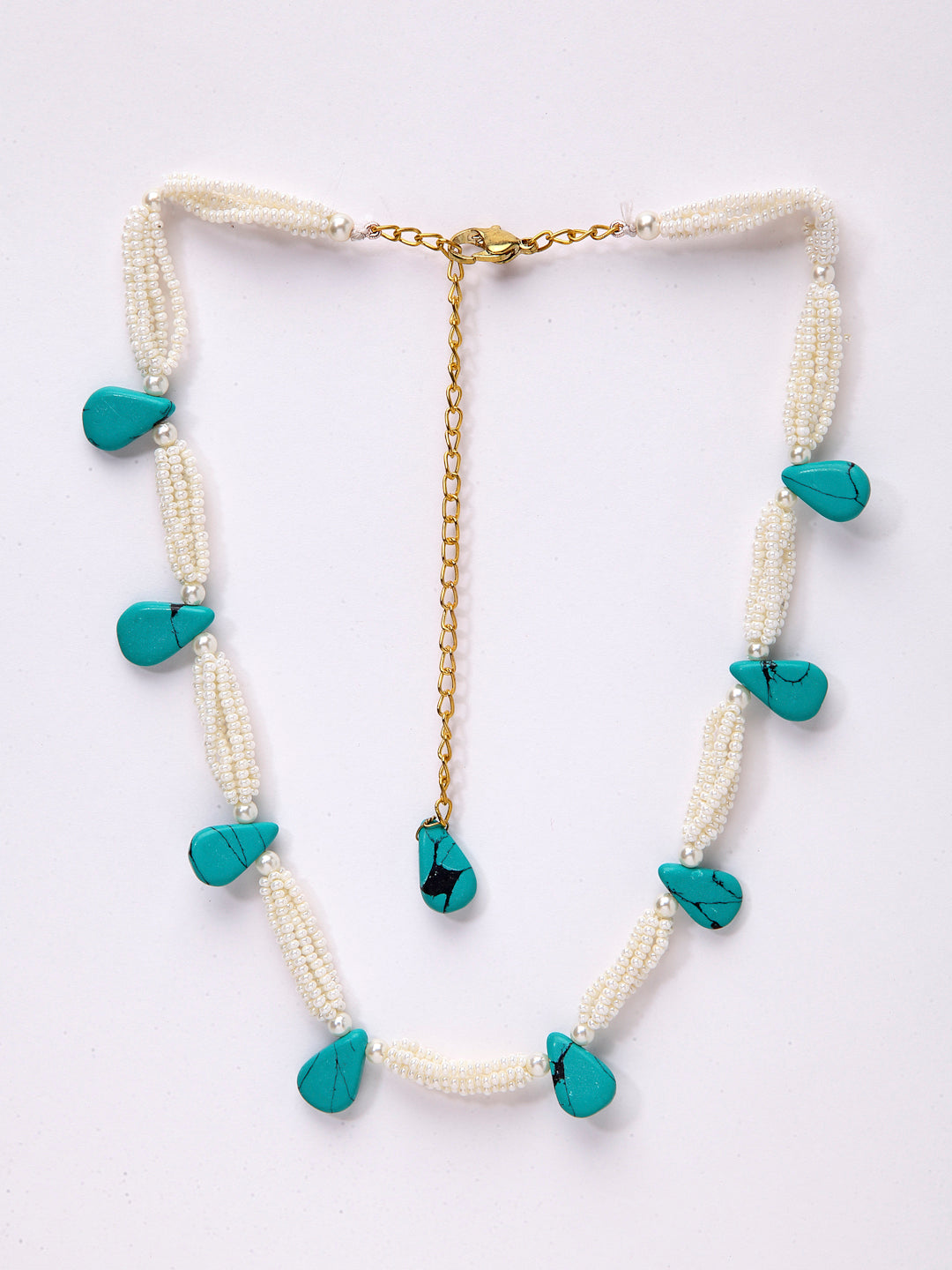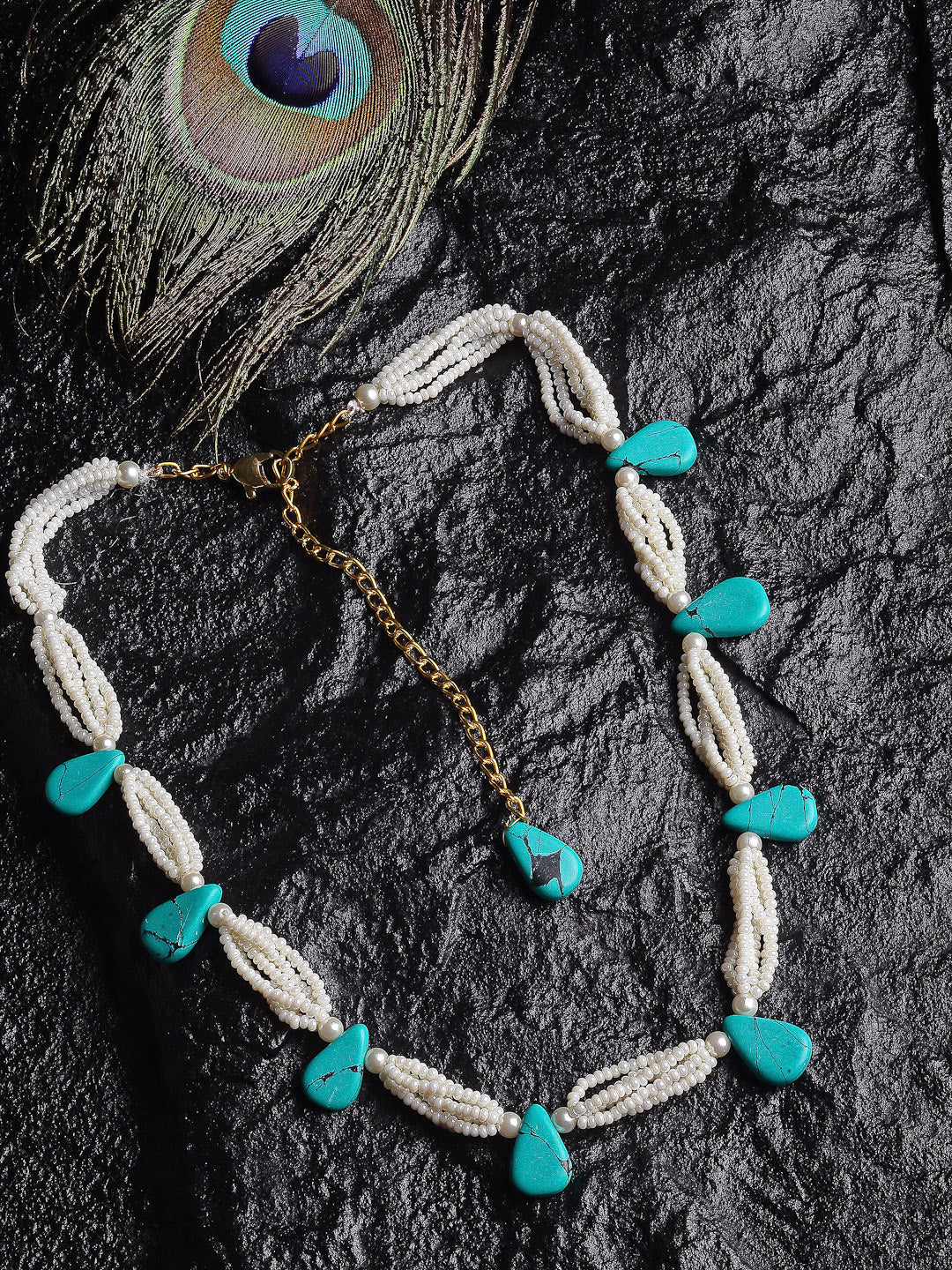 White Layered Necklace With Pearls & Natural Stones; Category Of Jewellery Is Necklace; Sub Category Is Layered; Ideal For Women; Color Is Blue, White, Gold; Gemstones Used - Pearls, Natural Stones; Plating Is Gold-Plated; Base Metal Is Alloy; Other Material Used - Adjustable Chain; Size Is Freesize; Adjustable - Yes; Weight Is 18 Gms; Mesaurements - Length Of Necklace =38 Cm; Width Of Necklace = 2 Cm; Adjustable - Yes; Content 1 Necklace