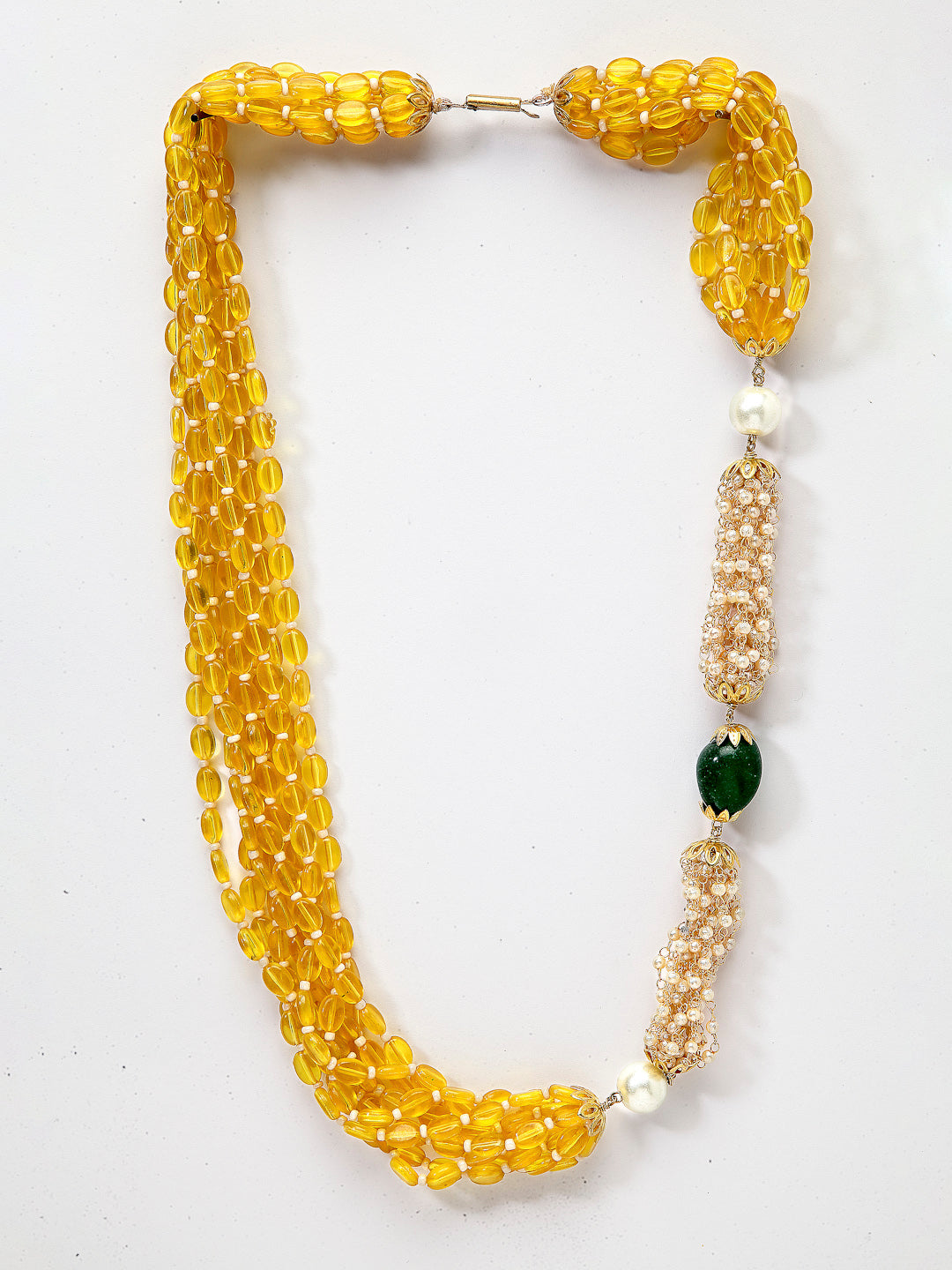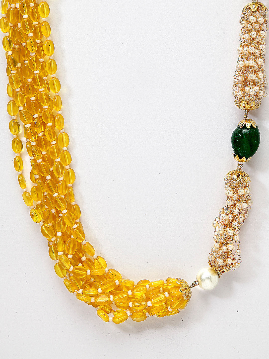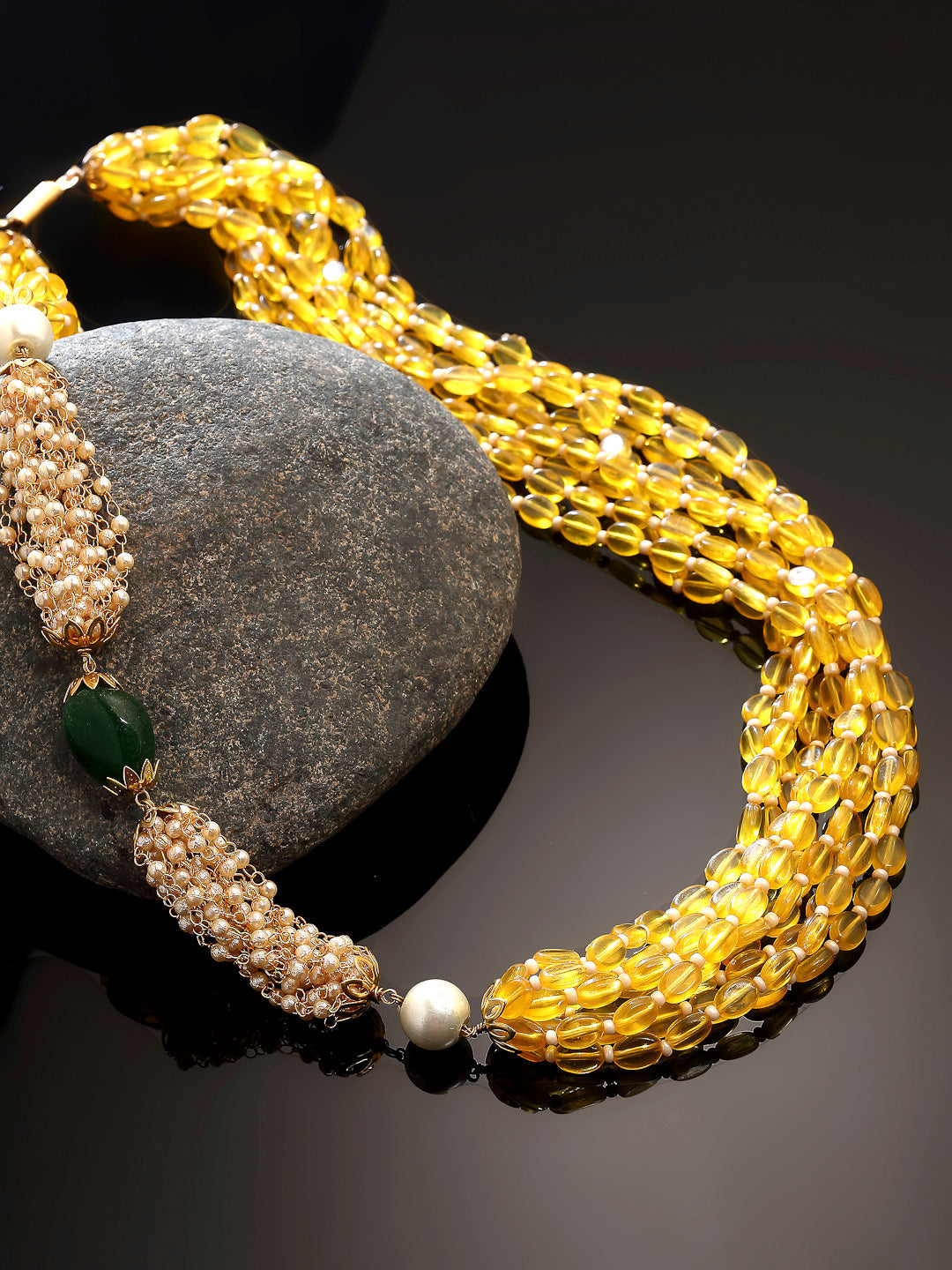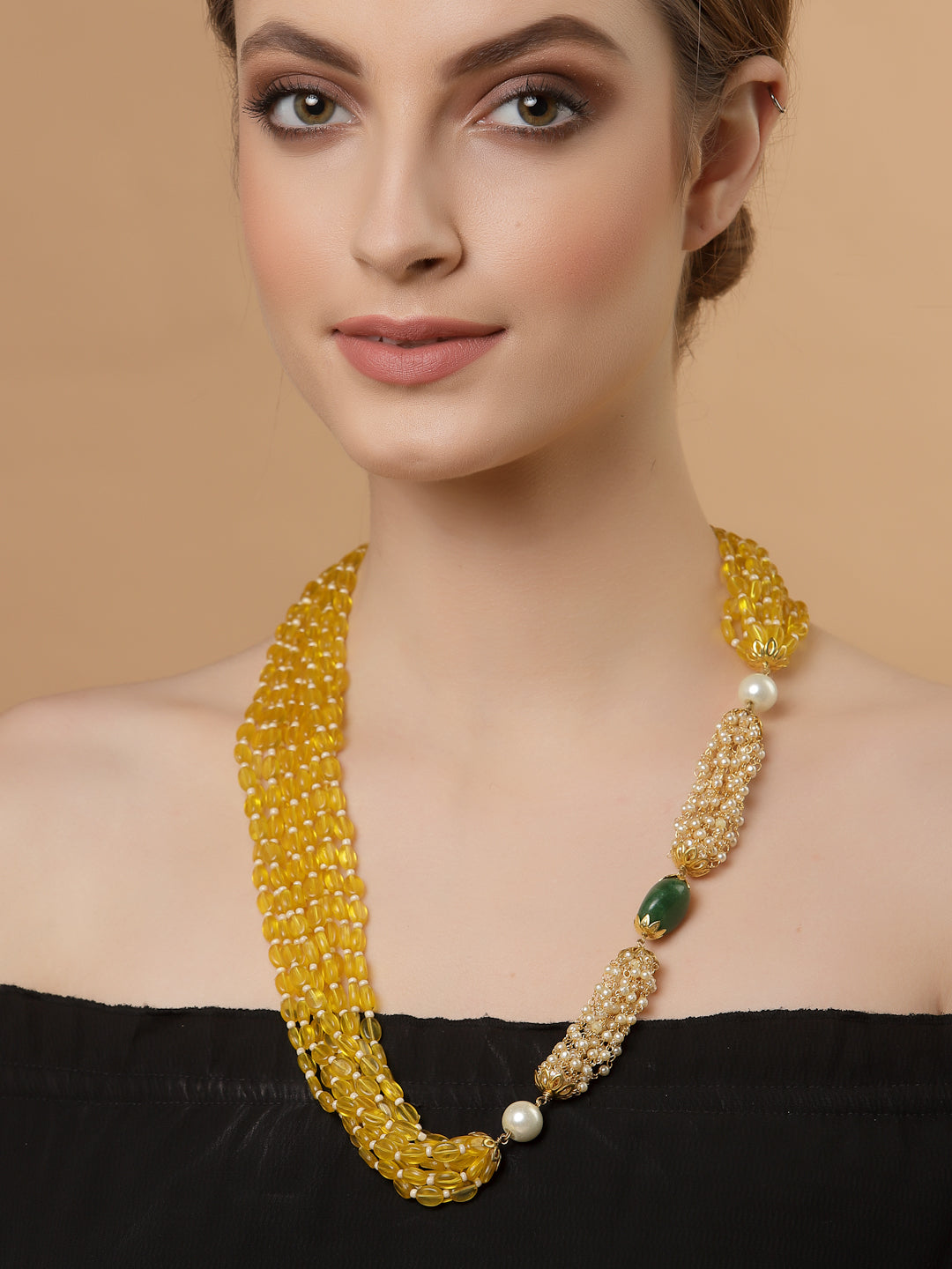 Yellow And Green Handmade Necklace To Style U And Get U Ready For Any Event Of Life With The Best Of Your Smile Forward Today And Always.; Category Of Jewellery Is Necklace; Sub Category Is Layered; Ideal For Women; Color Is Yellow, Green, White, Gold; Gemstones Used - Pearls, Natural Stones, Faux Emerald; Plating Is Gold-Plated; Base Metal Is Alloy; Other Material Used - None; Size Is Freesize; Adjustable - No; Weight Is 70 Gms; Mesaurements - Length Of Necklace =65 Cm; Width Of Necklace = 2.54 Cm; Adjustable - No; Content 1 Necklace