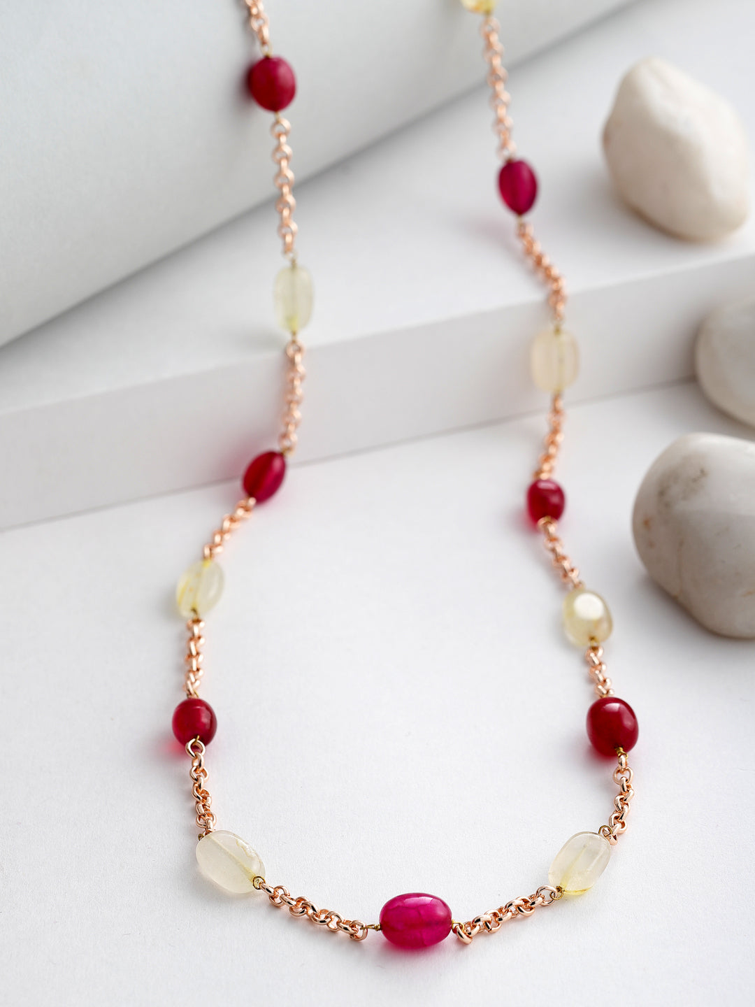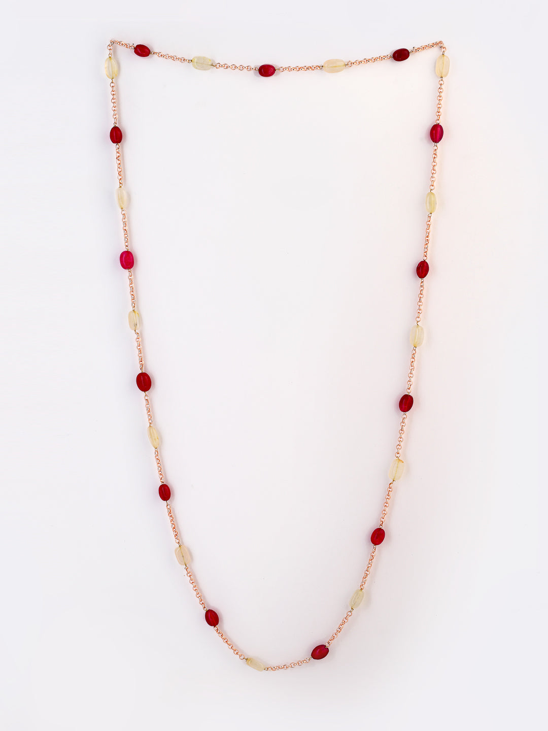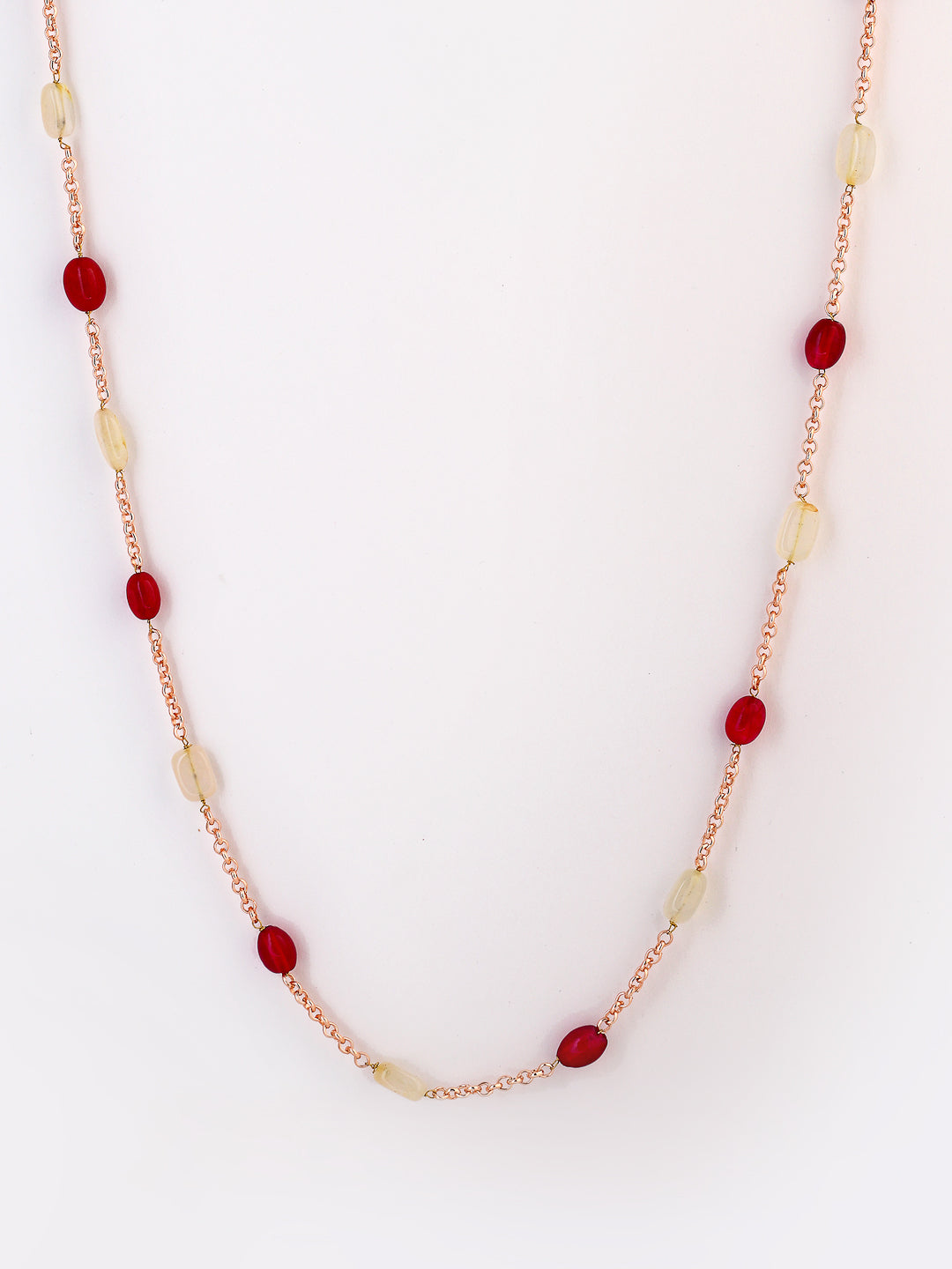 A Elegant Chain Necklace Highlighted Wth Semi Precious Stones Is Super Light Which Helps To Uplift Any Of Your Outfit Today And Forever; Category Of Jewellery Is Necklace; Sub Category Is Layered; Ideal For Women; Color Is Red, Rose Gold; Gemstones Used - Natural Stones, Faux Ruby; Plating Is Rose Gold Plated; Base Metal Is Alloy; Other Material Used - None; Size Is Freesize; Adjustable - No; Weight Is 40 Gms; Mesaurements - Length Of Necklace =86 Cm; Width Of Necklace = 1 Cm; Adjustable - Yes; Content 1 Necklace