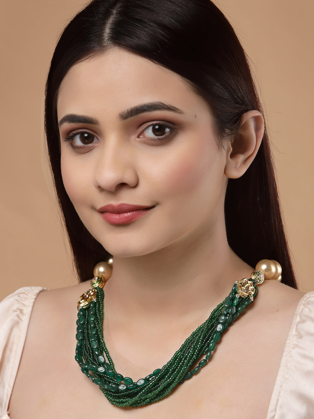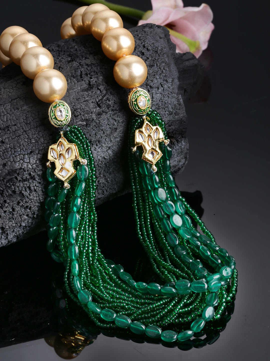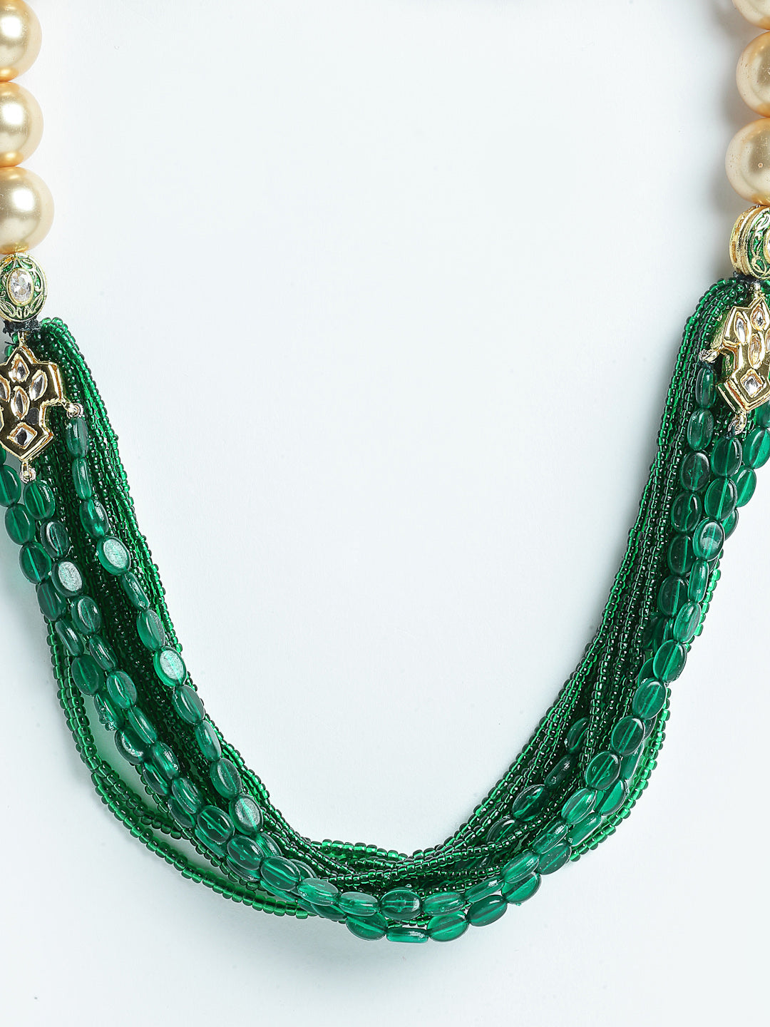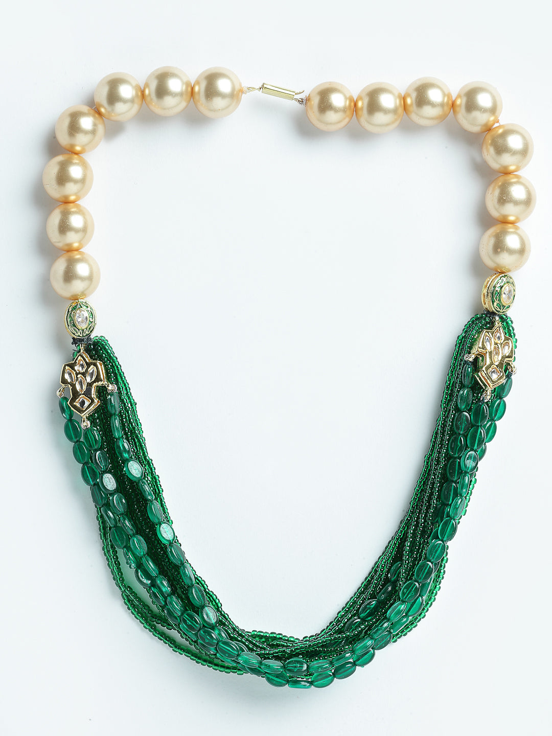 Classy Emerlad Pearl String Is What Makes It Unique Is The Color And Attitude It Helps In Building To The Person Wearing Same.; Category Of Jewellery Is Necklace; Sub Category Is Layered; Ideal For Women; Color Is Green, White, Gold; Gemstones Used - Kundan, Pearls, Natural Stones, Faux Emerald; Plating Is Gold-Plated; Base Metal Is Alloy; Other Material Used - None; Size Is Freesize; Adjustable - No; Weight Is 158 Gms; Mesaurements - Length Of Necklace =60 Cm; Width Of Necklace = 3 Cm; Adjustable - No; Content 1 Necklace
