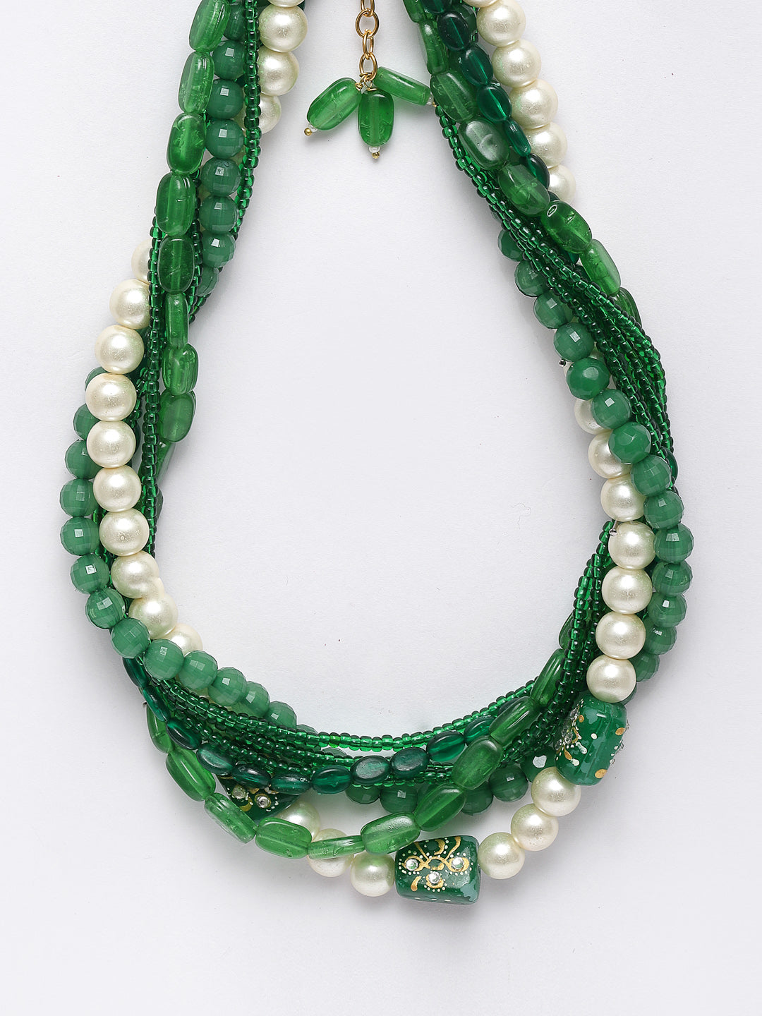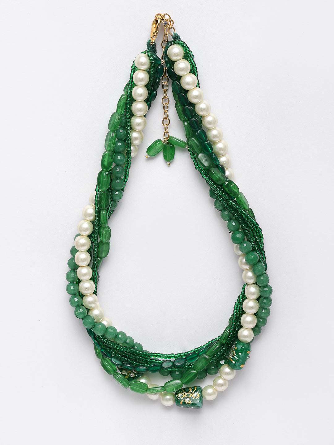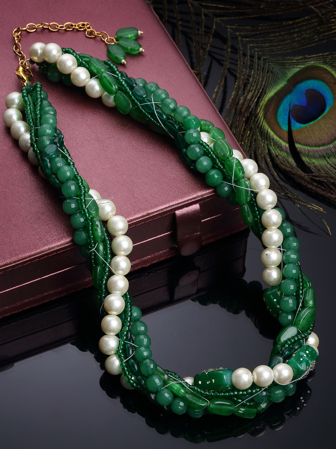Handcrafted Amalgamation Of Various Stones And Colors To Give U Classy Effect Of Life In One Neck Pc; Category Of Jewellery Is Necklace; Sub Category Is Layered; Ideal For Women; Color Is Green, Gold, White; Gemstones Used - Kundan, Pearls, Natural Stones, Faux Emerald; Plating Is Gold-Plated; Base Metal Is Alloy; Other Material Used - Adjustable Chain; Size Is Freesize; Adjustable - Yes; Weight Is 156 Gms; Mesaurements - Length Of Necklace =61 Cm; Width Of Necklace = 3.8 Cm; Adjustable - Yes; Content 1 Necklace