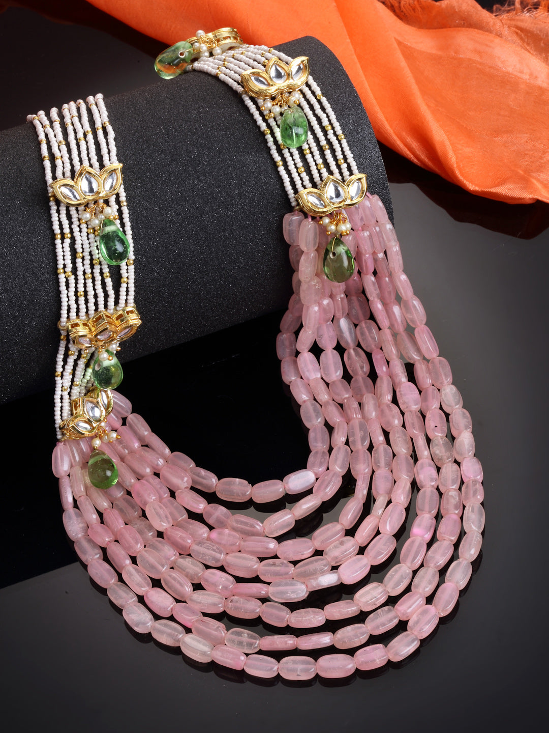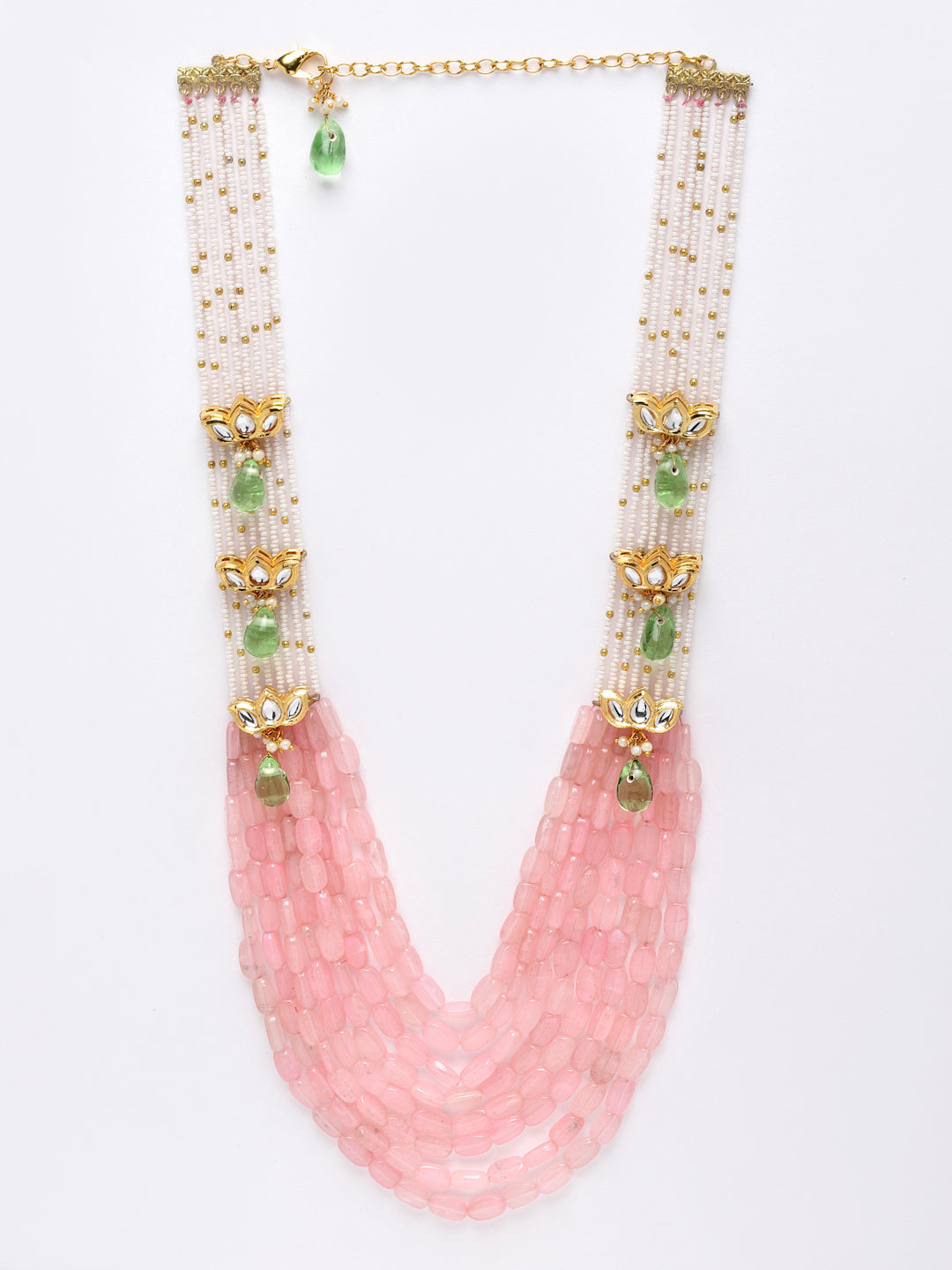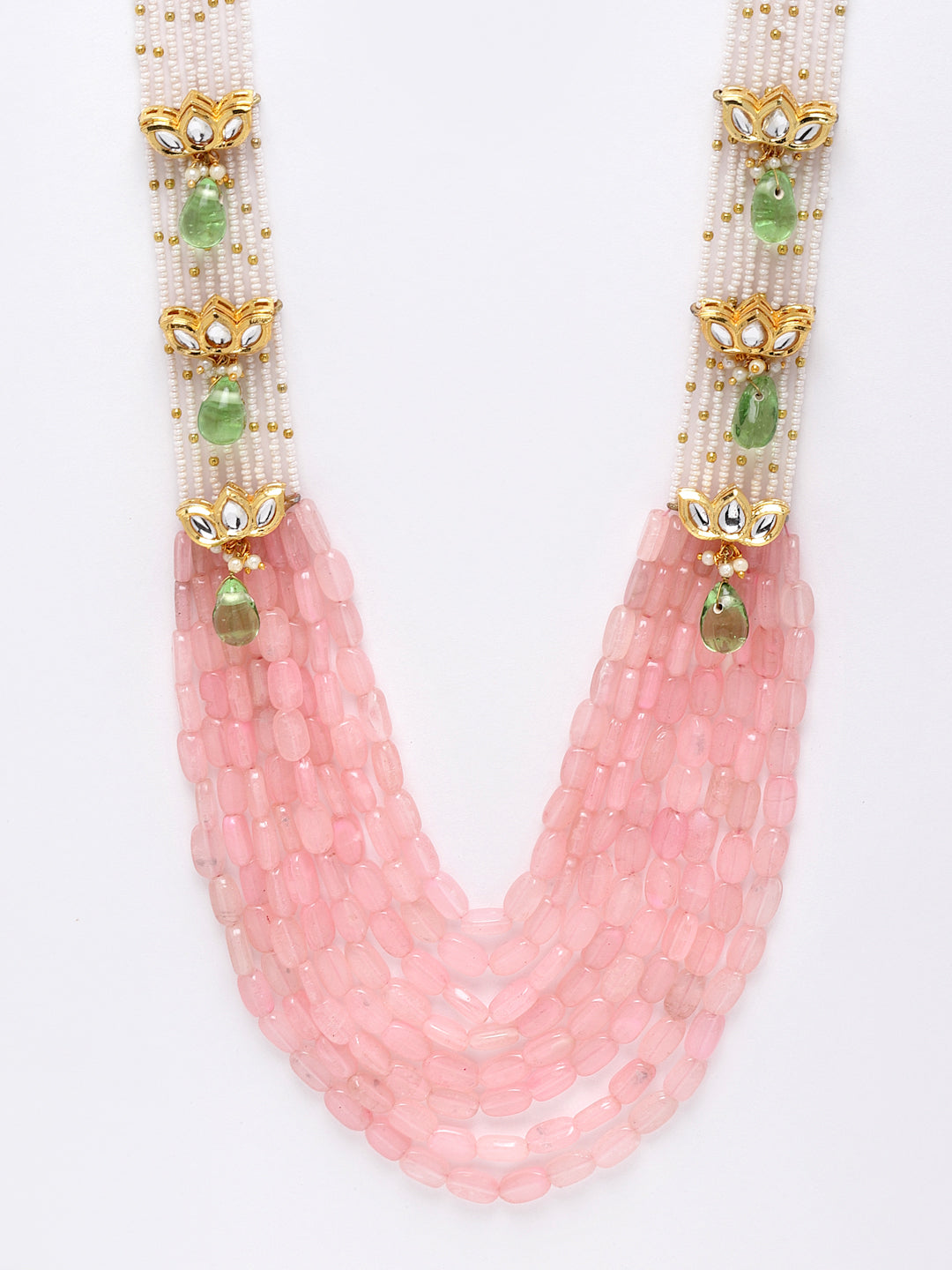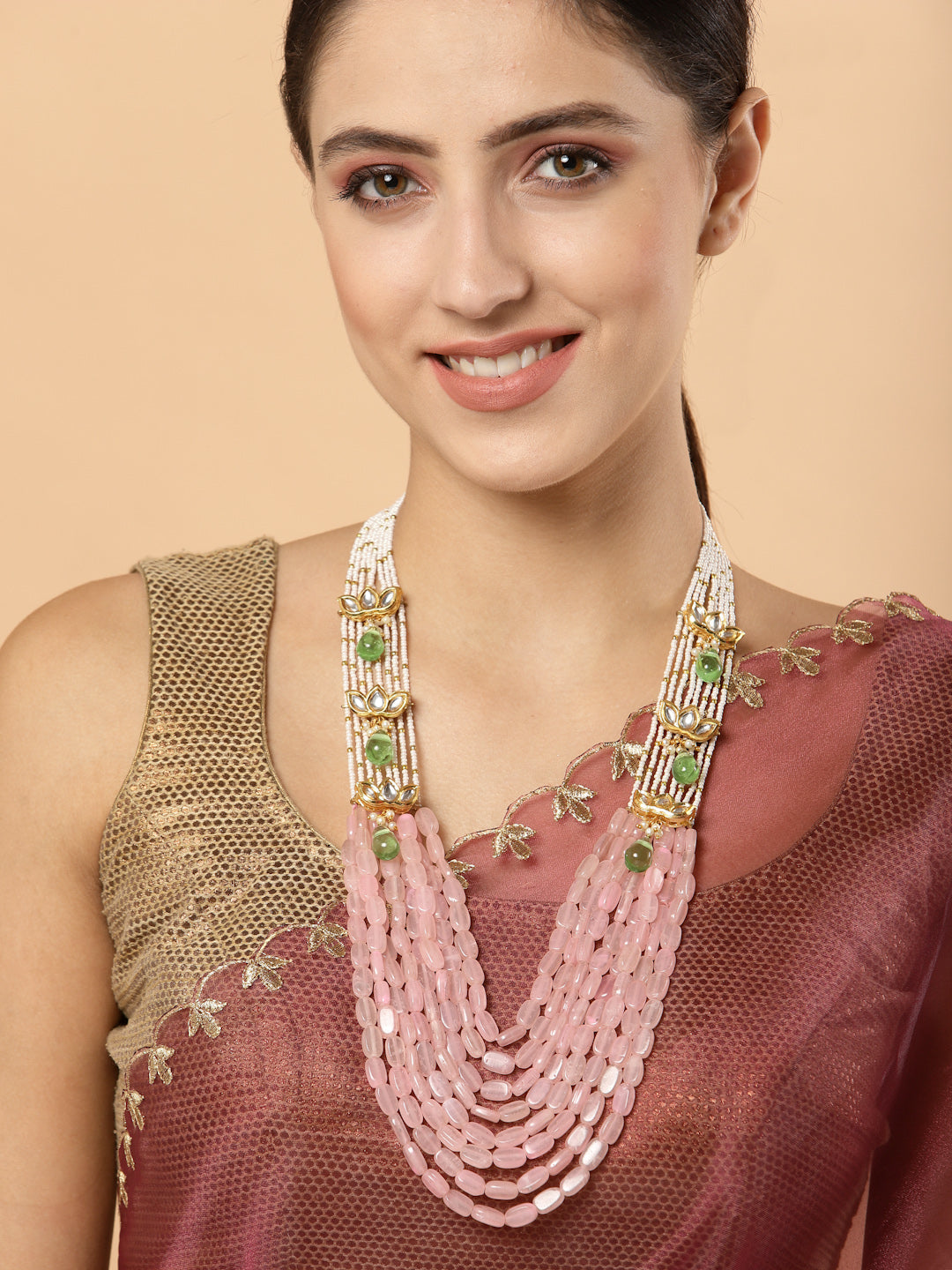 Lotus Of Wisdom With Pearls And Tinch Of Neon Green And Pink Sapphire (Semi Precious ) Mala; Category Of Jewellery Is Necklace; Sub Category Is Layered; Ideal For Women; Color Is Pink, Green, White, Gold; Gemstones Used - Kundan, Pearls, Natural Stones; Plating Is Gold-Plated; Base Metal Is Alloy; Other Material Used - Adjustable Chain; Size Is Freesize; Adjustable - Yes; Weight Is 179 Gms; Mesaurements - Length Of Necklace =80 Cm; Width Of Necklace = 6 Cm; Adjustable - Yes; Content 1 Necklace