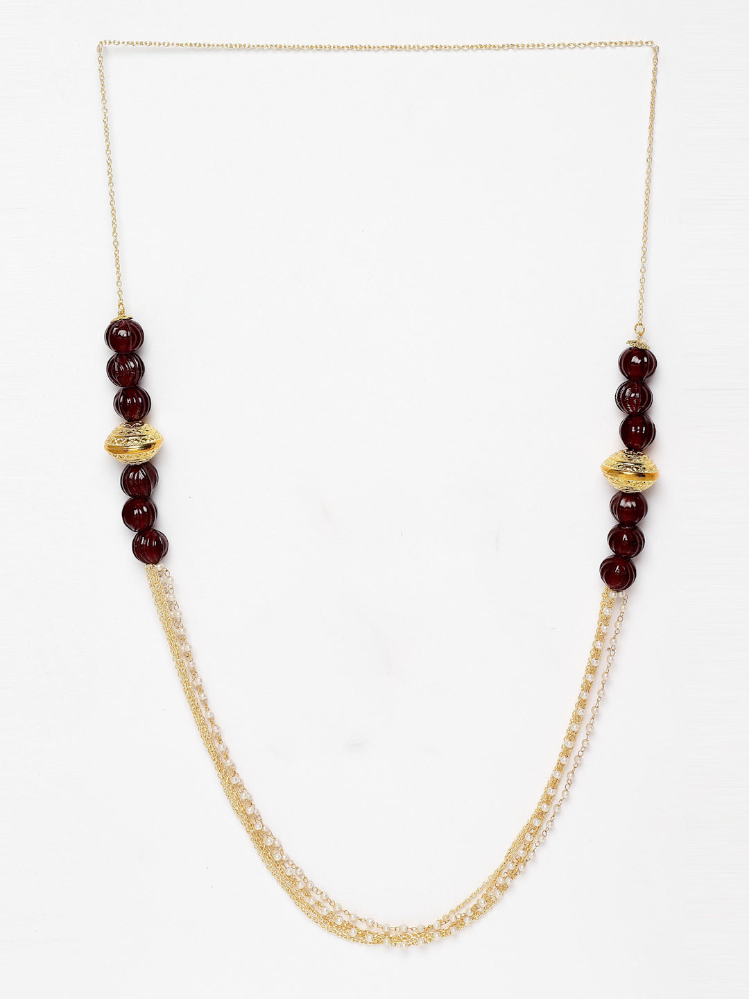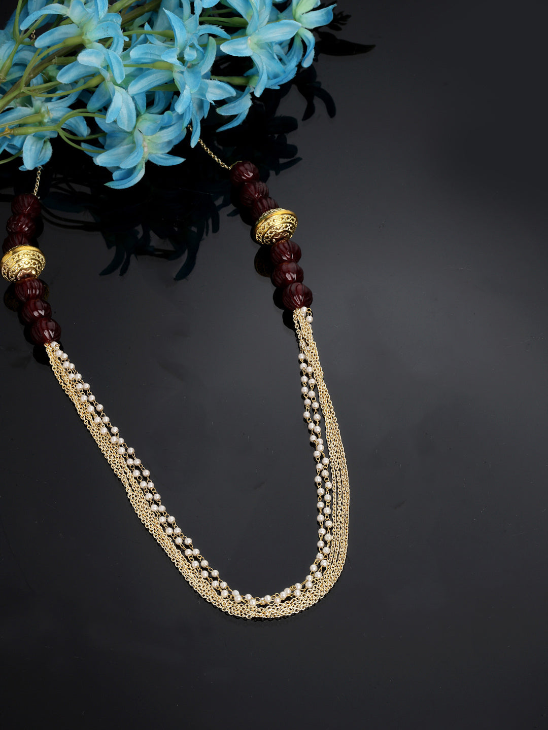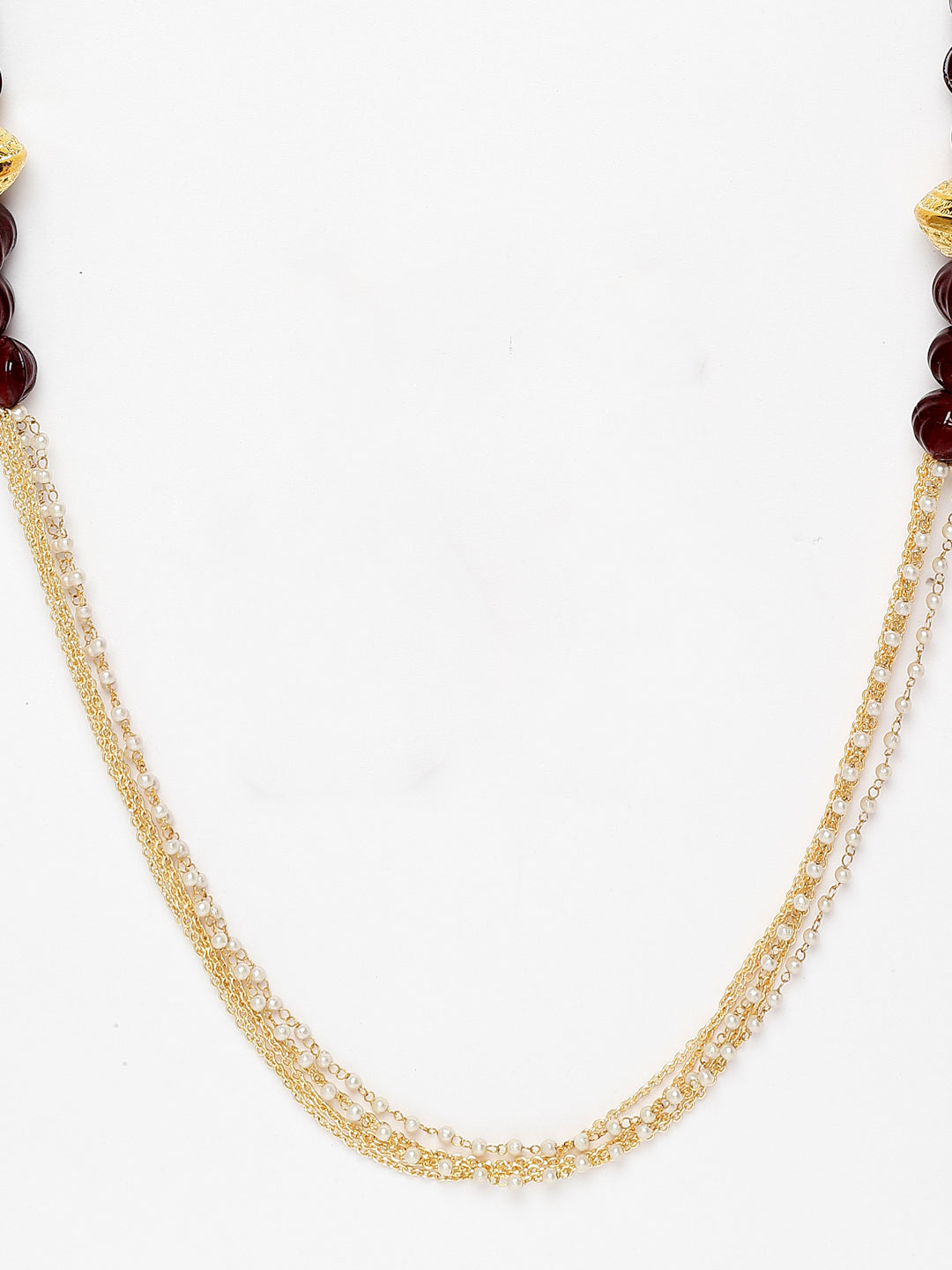 Quick Solution Of Getting Ready And Stylish With Good To Go Chain And Mehroon Stone With Gold Neck Pc.; Category Of Jewellery Is Necklace; Sub Category Is Layered; Ideal For Women; Color Is Red, Gold, White, Cream; Gemstones Used - Pearls, Natural Stones; Plating Is Gold-Plated; Base Metal Is Alloy; Other Material Used - None; Size Is Freesize; Adjustable - No; Weight Is 56 Gms; Mesaurements - Length Of Necklace =85 Cm; Width Of Necklace = 2.1 Cm; Adjustable - No; Content 1 Necklace