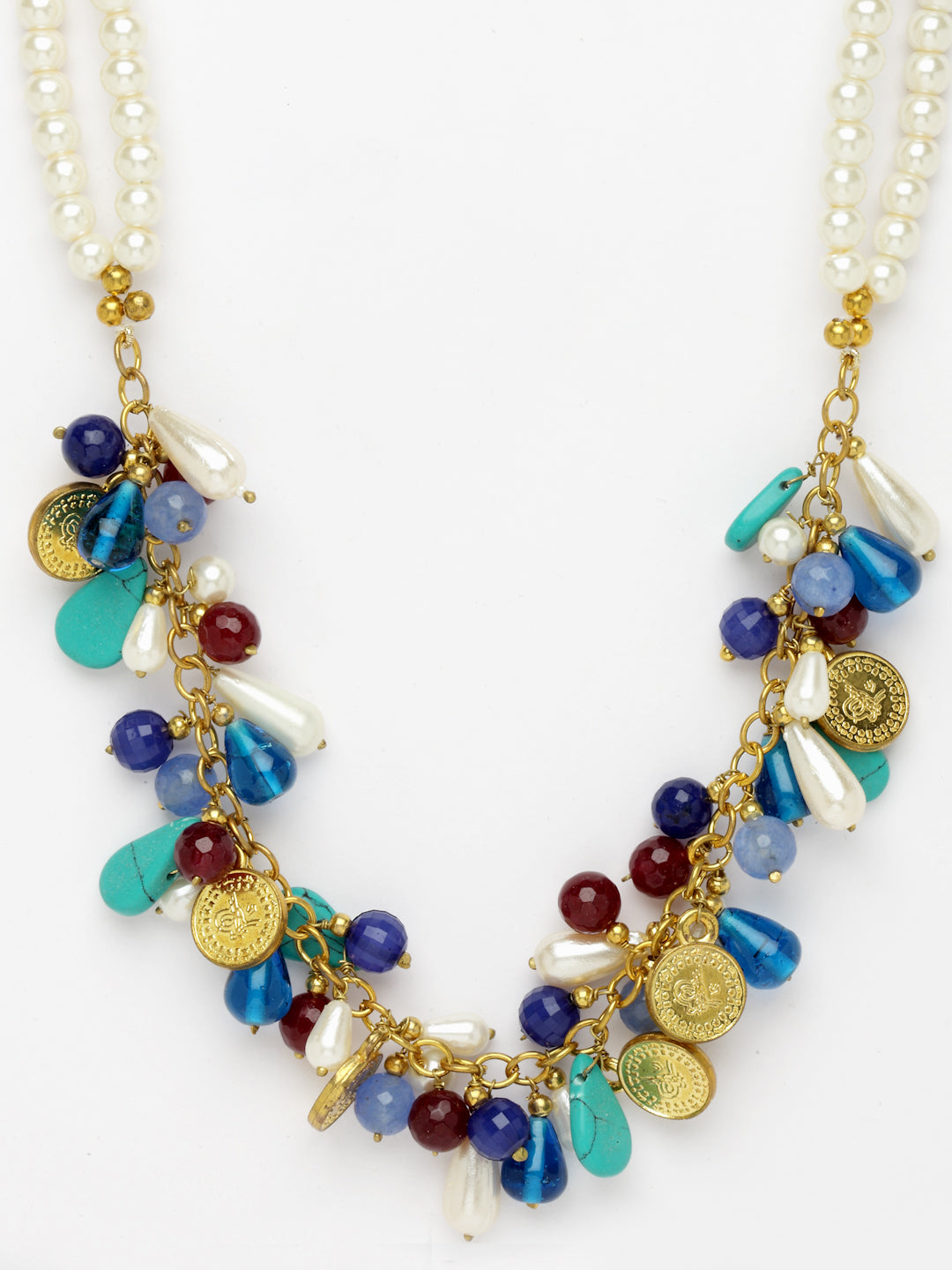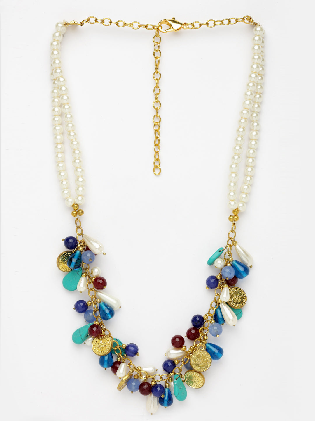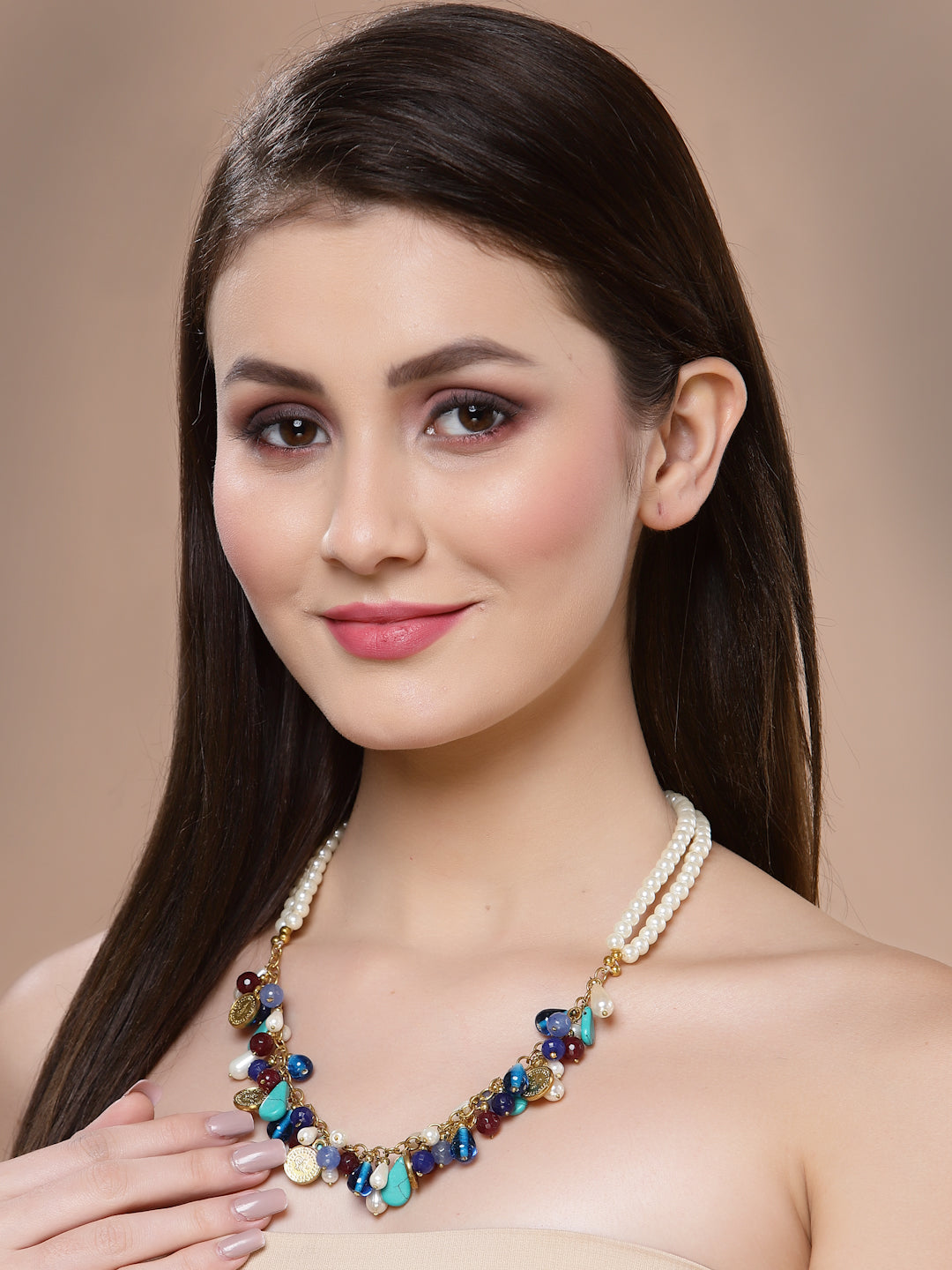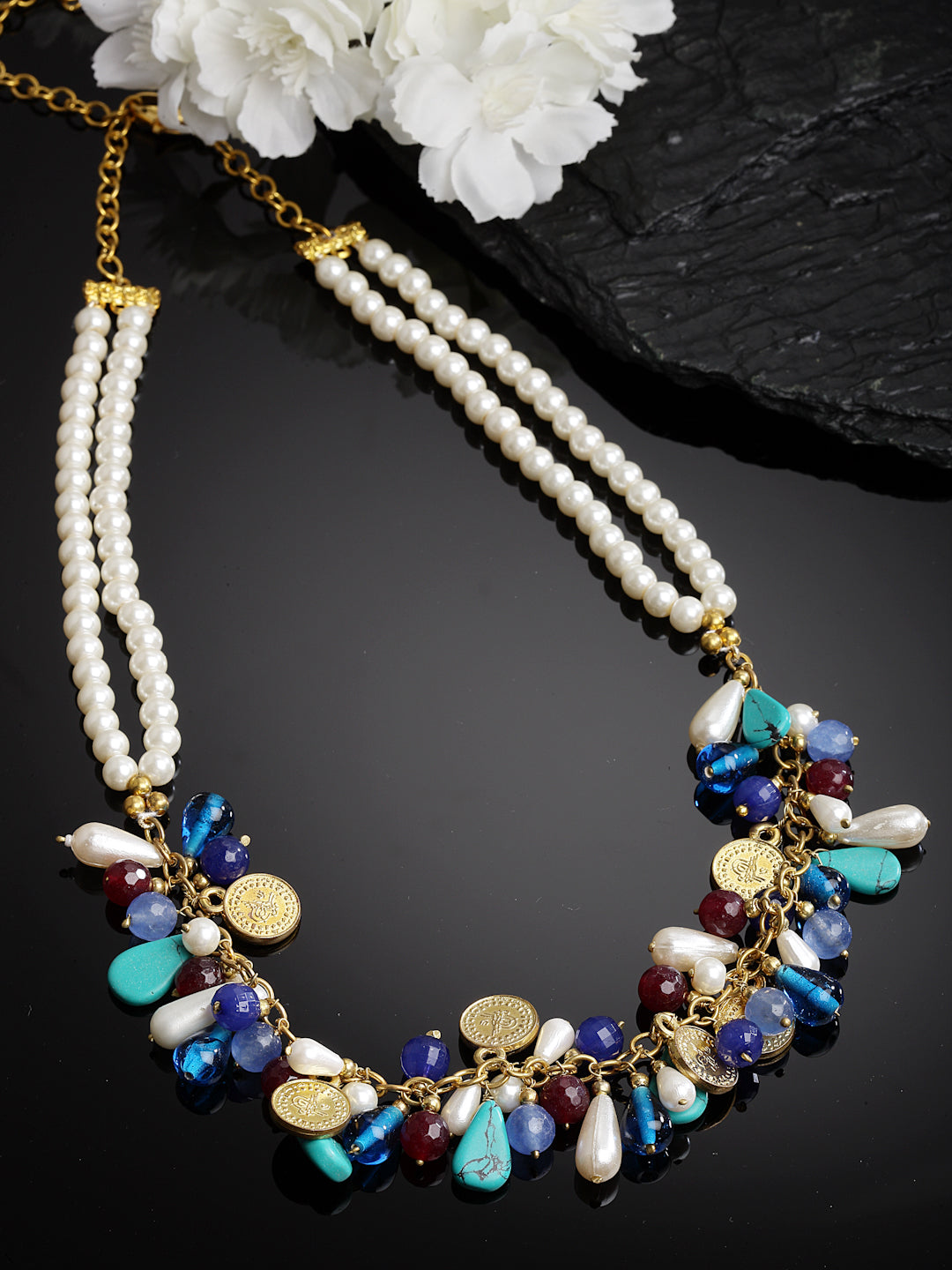 Western Style Of Multi Hooped Neck Pc With Pearls Work Is What Makes This Pc Stylish; Category Of Jewellery Is Necklace; Sub Category Is Layered; Ideal For Women; Color Is Blue, Maroon, White, Gold; Gemstones Used - Pearls, Natural Stones; Plating Is Gold-Plated; Base Metal Is Alloy; Other Material Used - Adjustable Chain; Size Is Freesize; Adjustable - Yes; Weight Is 70 Gms; Mesaurements - Length Of Necklace =49 Cm; Width Of Necklace = 2.6 Cm; Adjustable - Yes; Content 1 Necklace