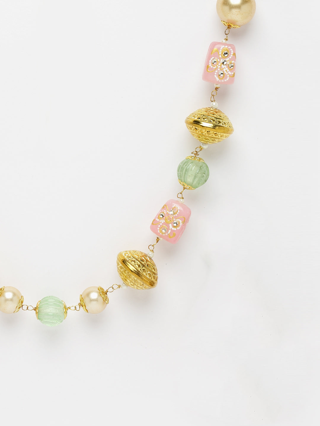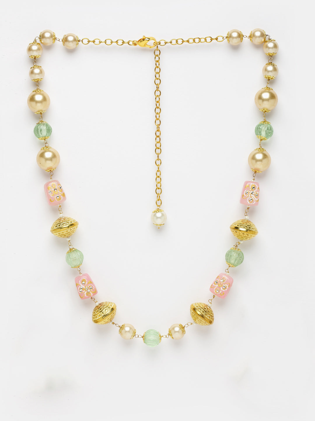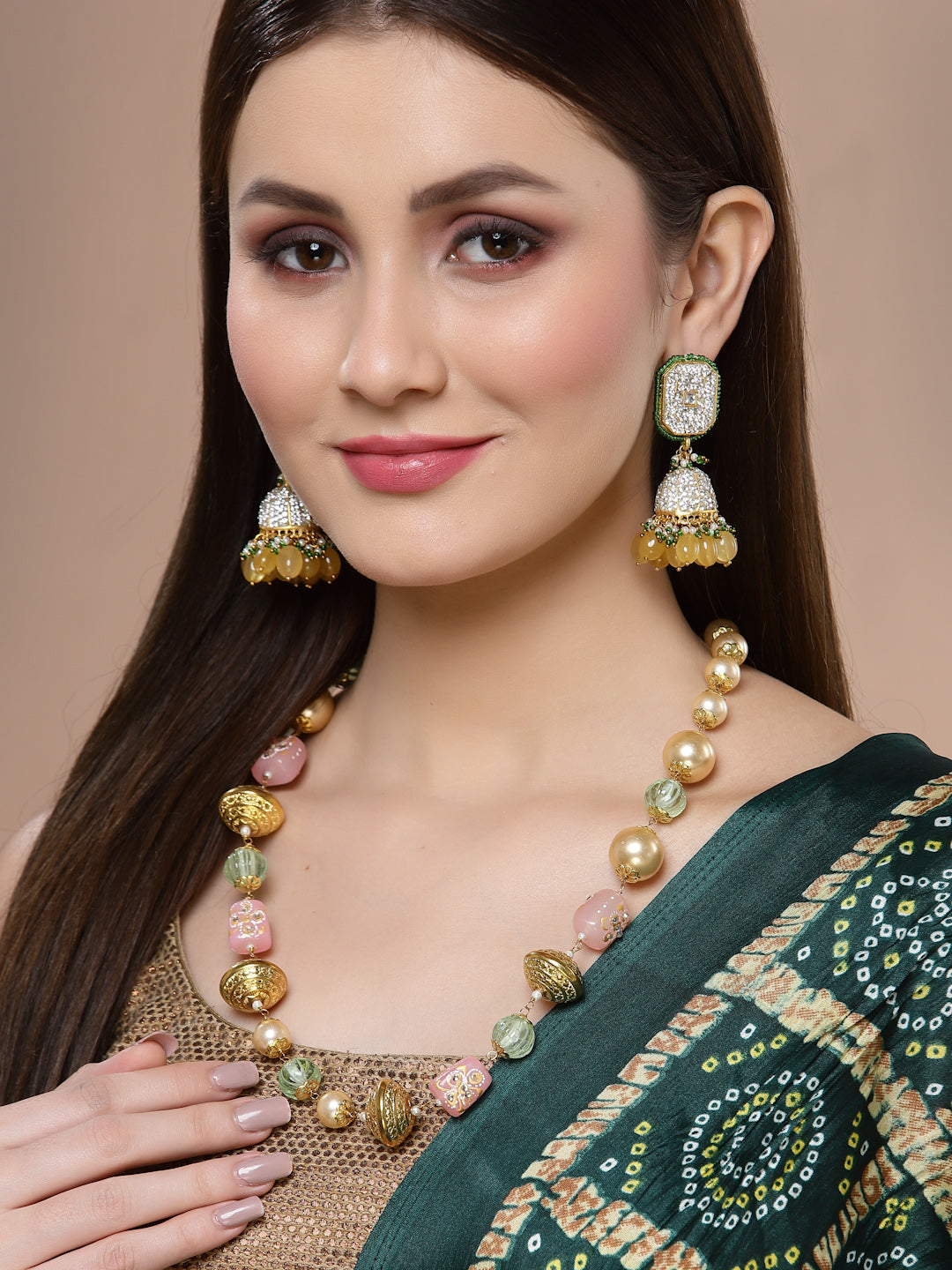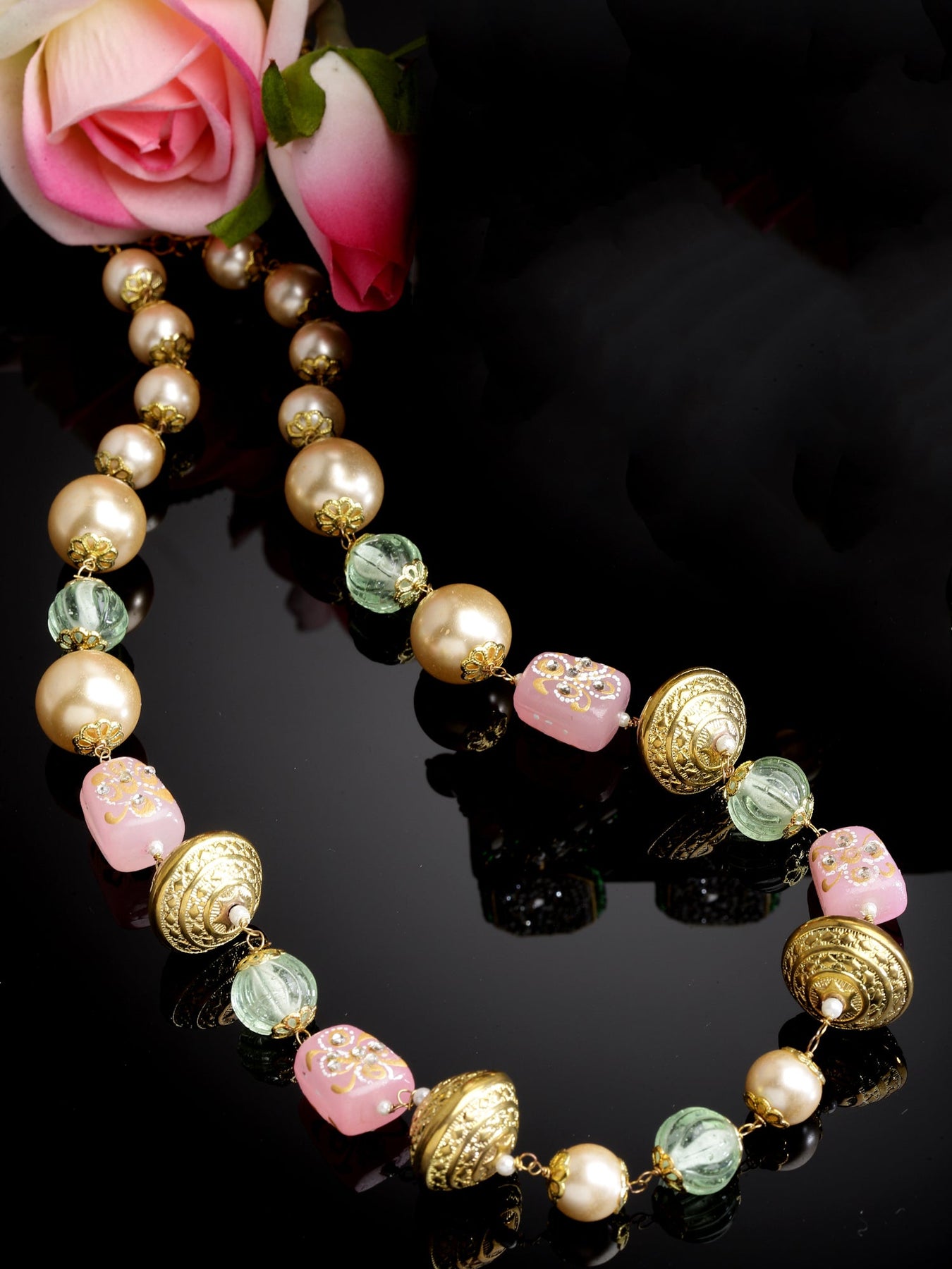 Gold Pink And Green Sapphire Handlooped Neck Pc; Category Of Jewellery Is Necklace; Sub Category Is Layered; Ideal For Women; Color Is Green, Pink, White, Gold; Gemstones Used - American Diamonds, Pearls, Natural Stones, Faux Emerald; Plating Is Gold-Plated; Base Metal Is Alloy; Other Material Used - Adjustable Chain; Size Is Freesize; Adjustable - Yes; Weight Is 110 Gms; Mesaurements - Length Of Necklace =60 Cm; Width Of Necklace = 1.5 Cm; Adjustable - Yes; Content 1 Necklace