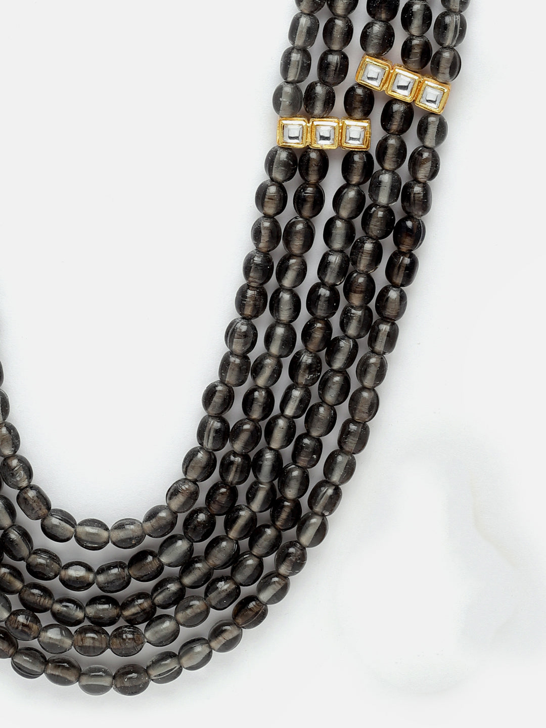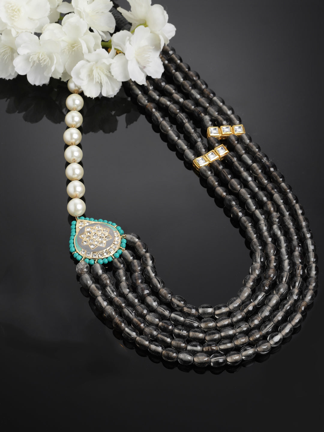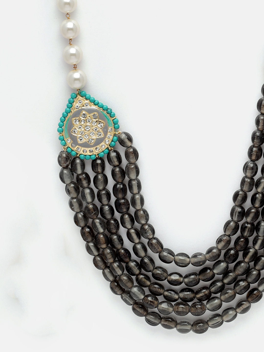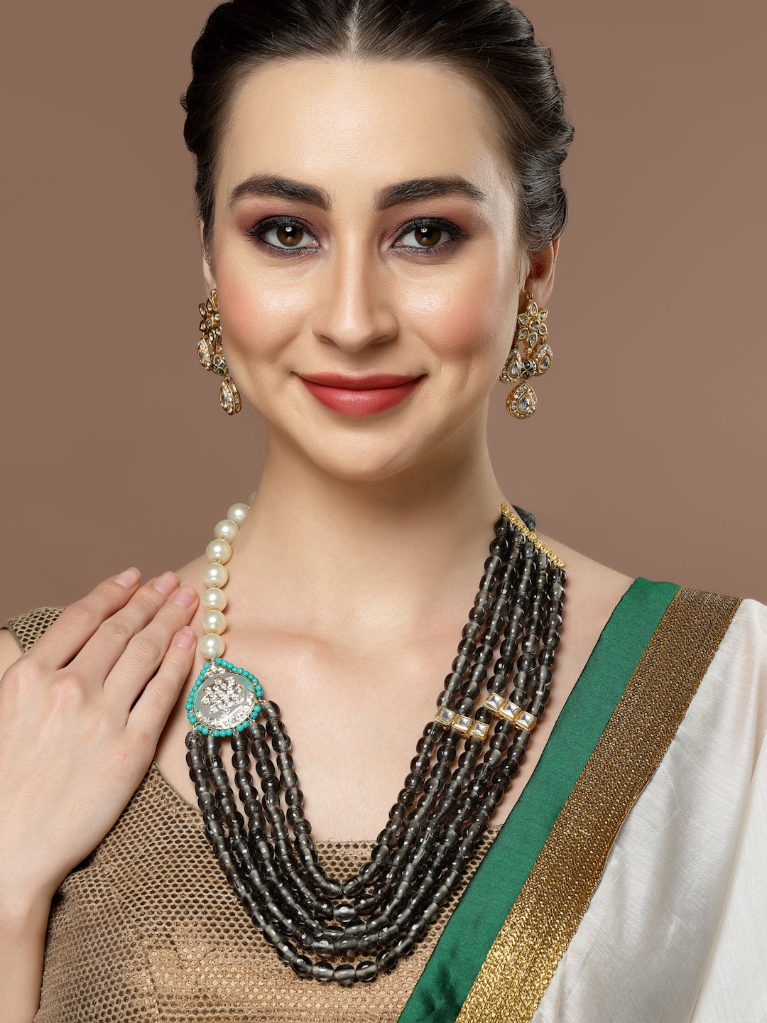 Meena Grey With Pearl And Drop Mani ; Category Of Jewellery Is Necklace; Sub Category Is Layered; Ideal For Women; Color Is Grey, Green, White, Gold ; Gemstones Used - Kundan, American Diamonds, Pearls, Natural Stones; Plating Is Gold-Plated; Base Metal Is Alloy; Other Material Used - Adjustable Dori; Size Is Freesize; Adjustable - Yes; Weight Is 220 Gms; Mesaurements - Length Of Necklace =73 Cm; Width Of Necklace = 13 Cm; Adjustable - Yes; Content 1 Necklace