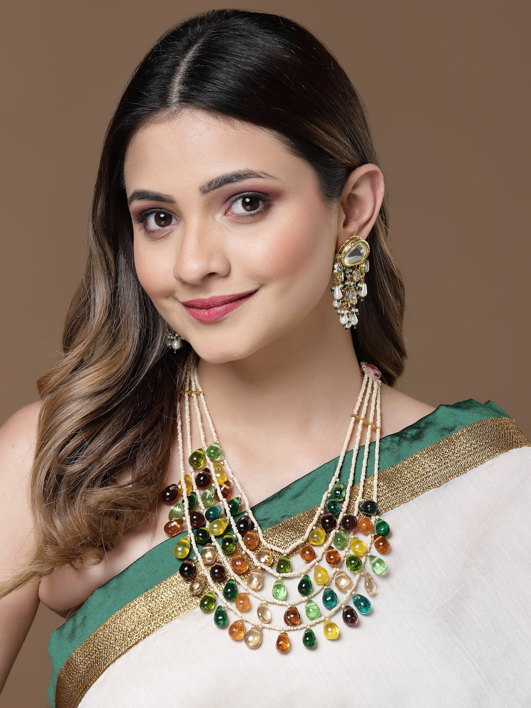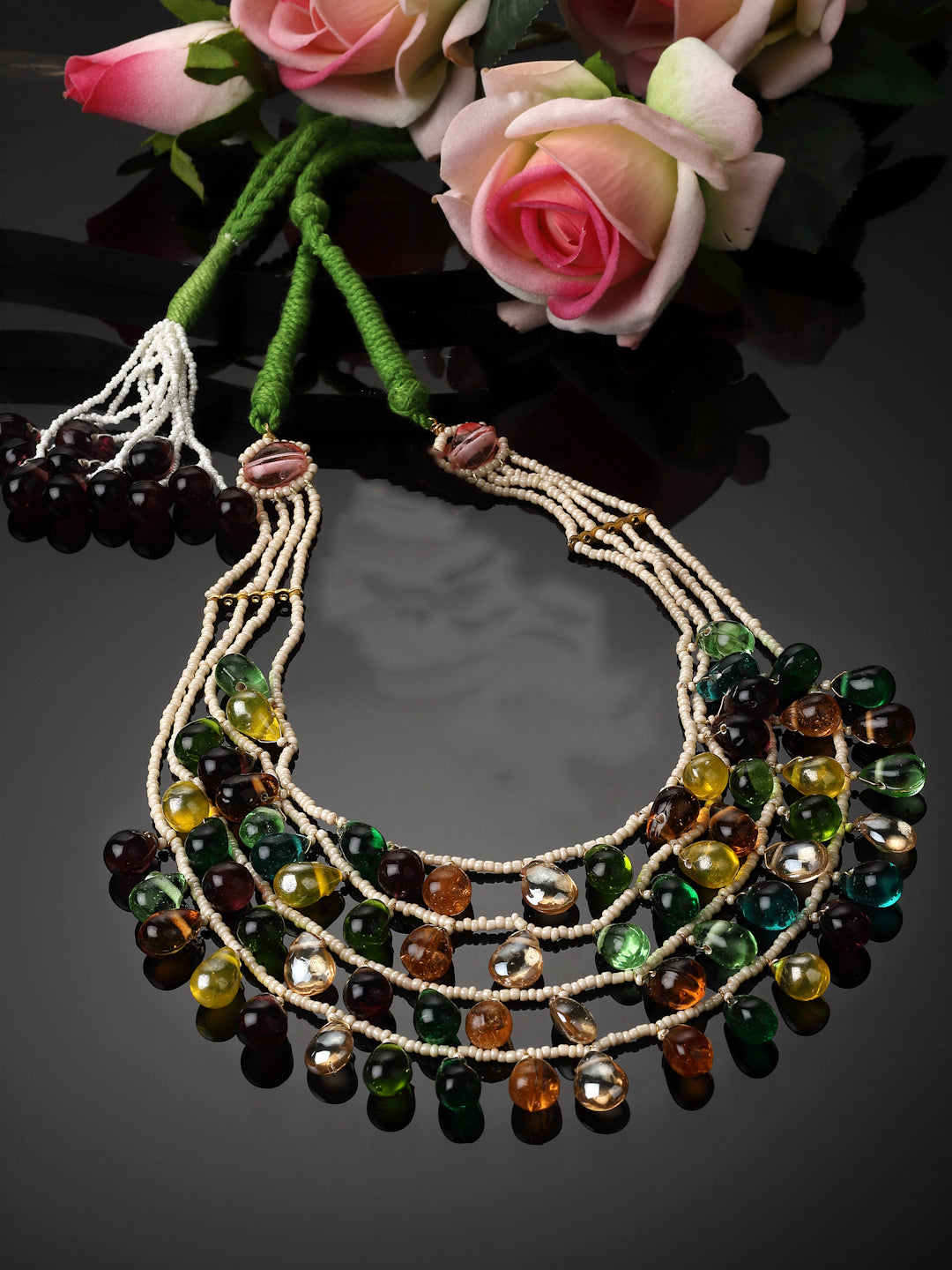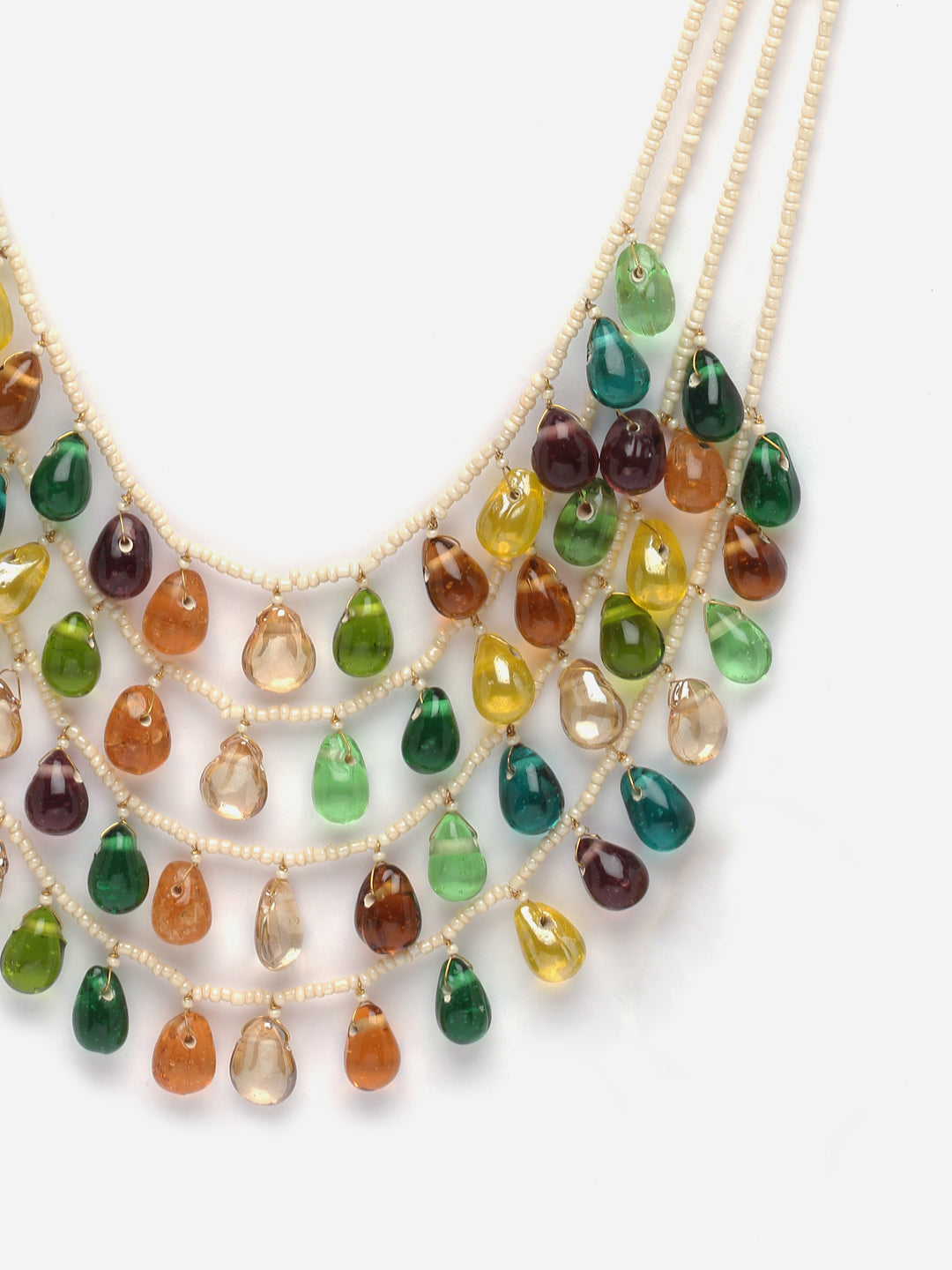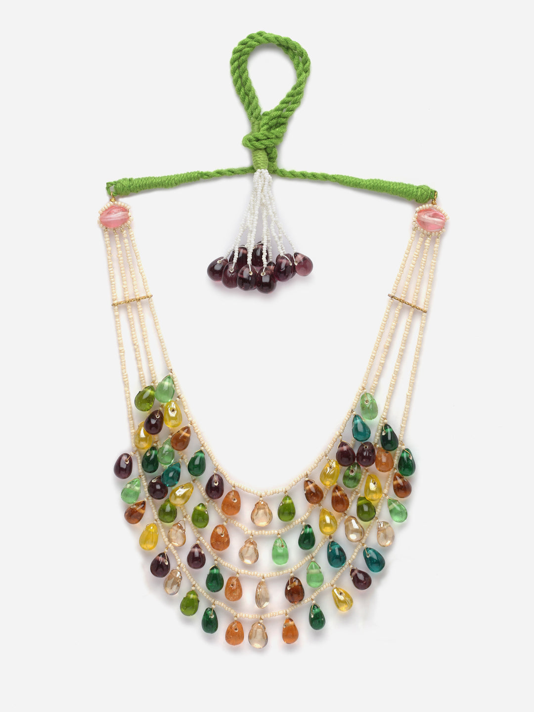 Multi Color Droplets And Green Handmade Dori With Layers Of Pearl Is The Classy Effect ; Category Of Jewellery Is Necklace; Sub Category Is Layered; Ideal For Women; Color Is Green, Orange, Purple, Yellow, Cream, Gold; Gemstones Used - Pearls, Natural Stones; Plating Is Gold-Plated; Base Metal Is Alloy; Other Material Used - Adjustable Dori; Size Is Freesize; Adjustable - Yes; Weight Is 169 Gms; Mesaurements - Length Of Necklace =56 Cm; Width Of Necklace = 13 Cm; Adjustable - Yes; Content 1 Necklace