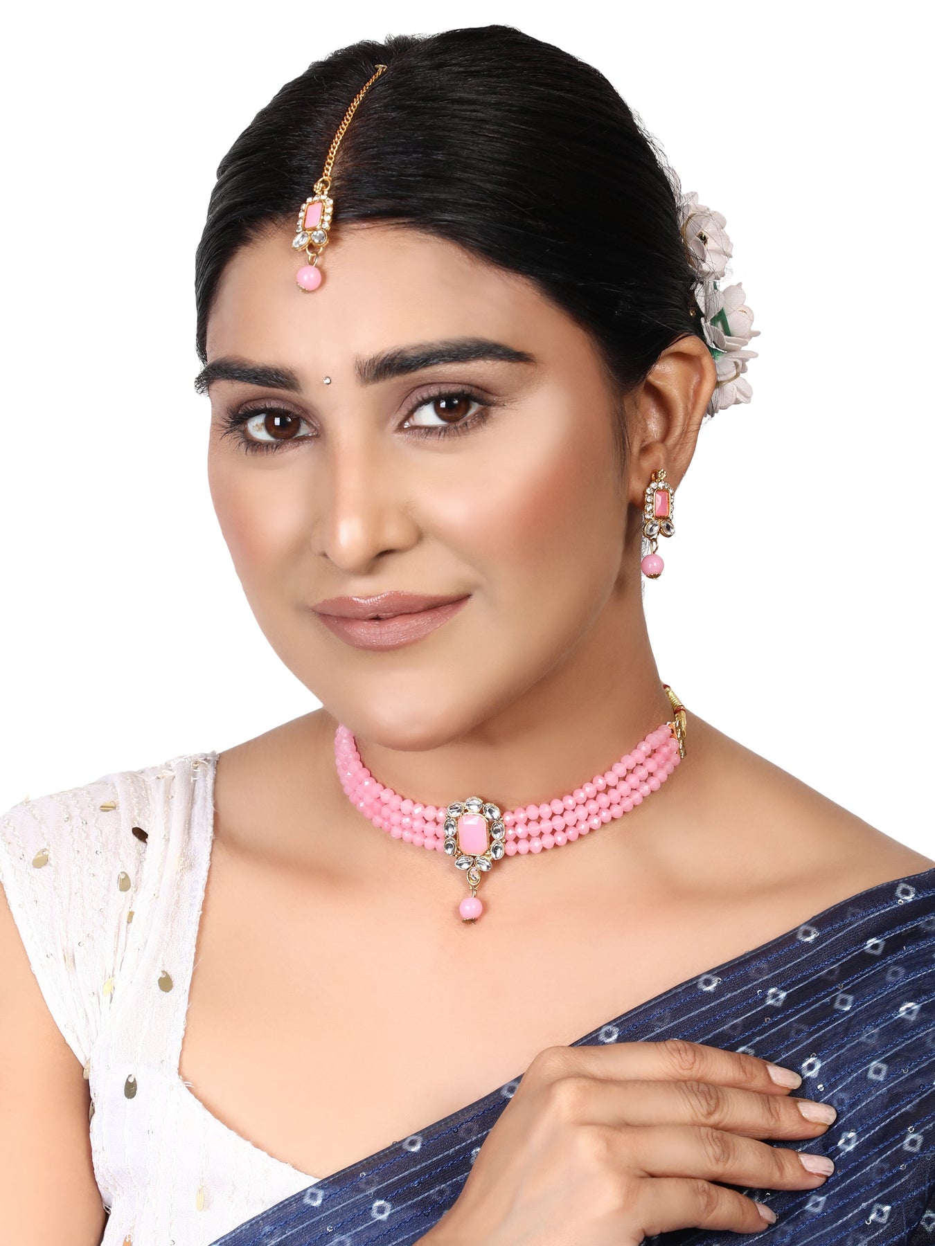 Women's Pink Crystal Kundan Beautiful Choker Jewellery Set - Evy