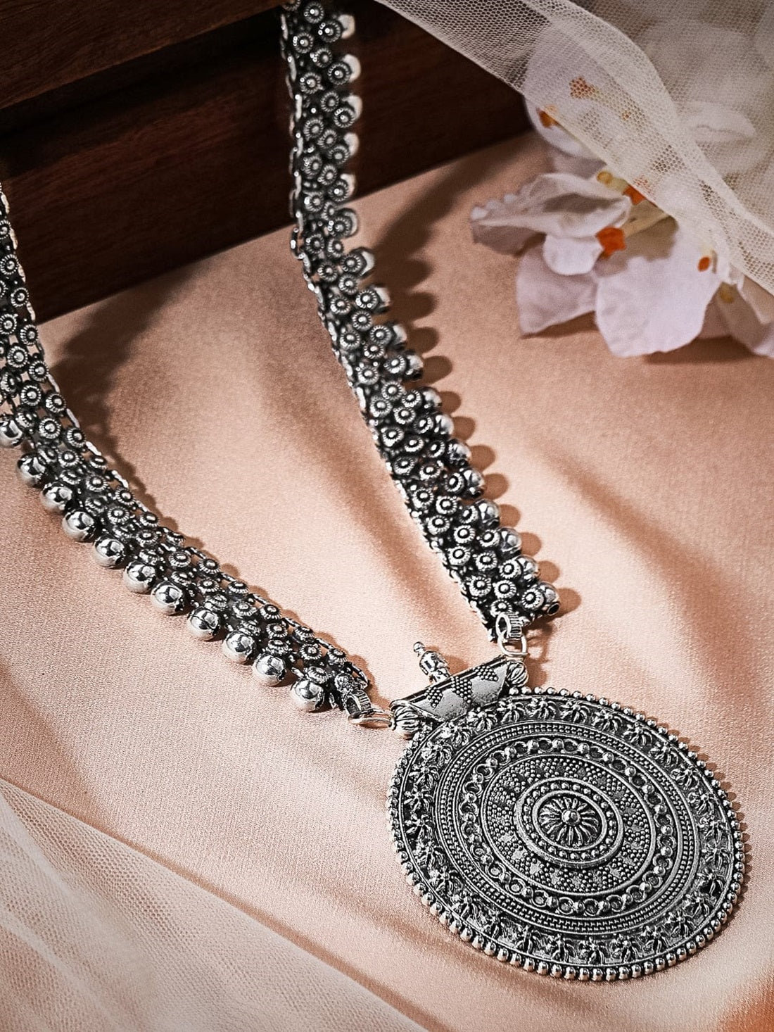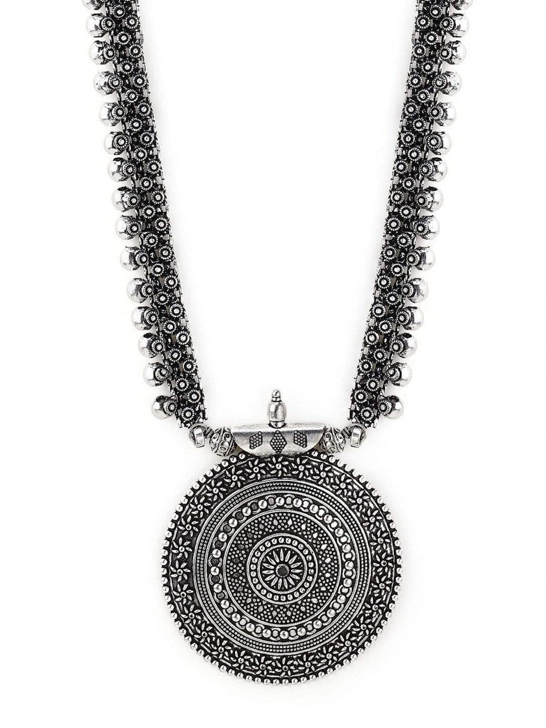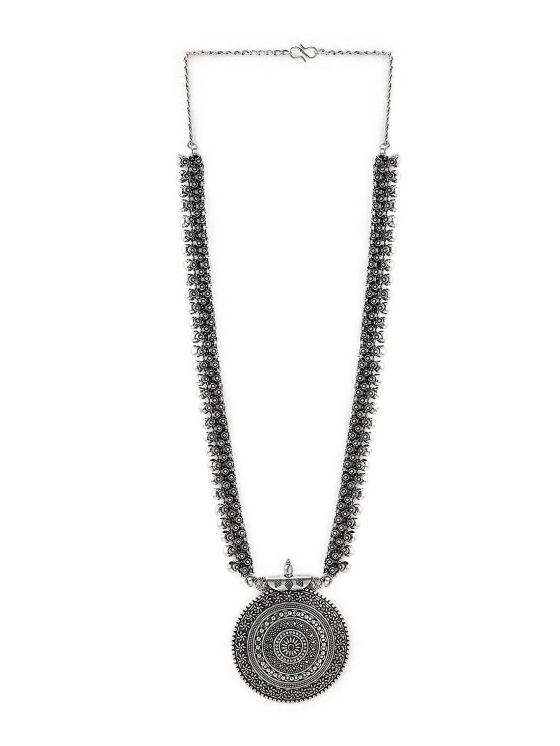 Channel Your Inner Queen With This Oxidised Silver-Plated Stone-Studded Necklace By Vastrabhushan. Designed To Exude Regal Elegance, This Necklace Features Intricately Placed Stones And Beads, Making It A Statement Piece That Elevates Any Outfit. Handcrafted With Precision, It’S Perfect For Adding A Touch Of Sophistication To Your Ensemble.