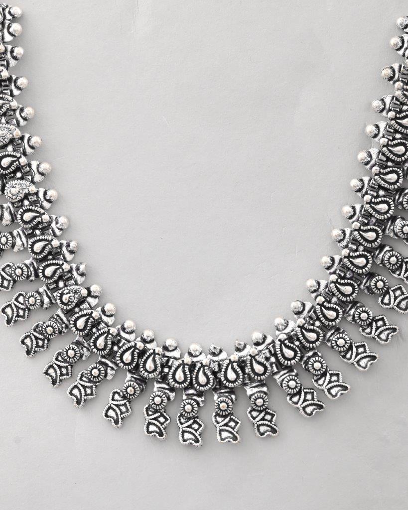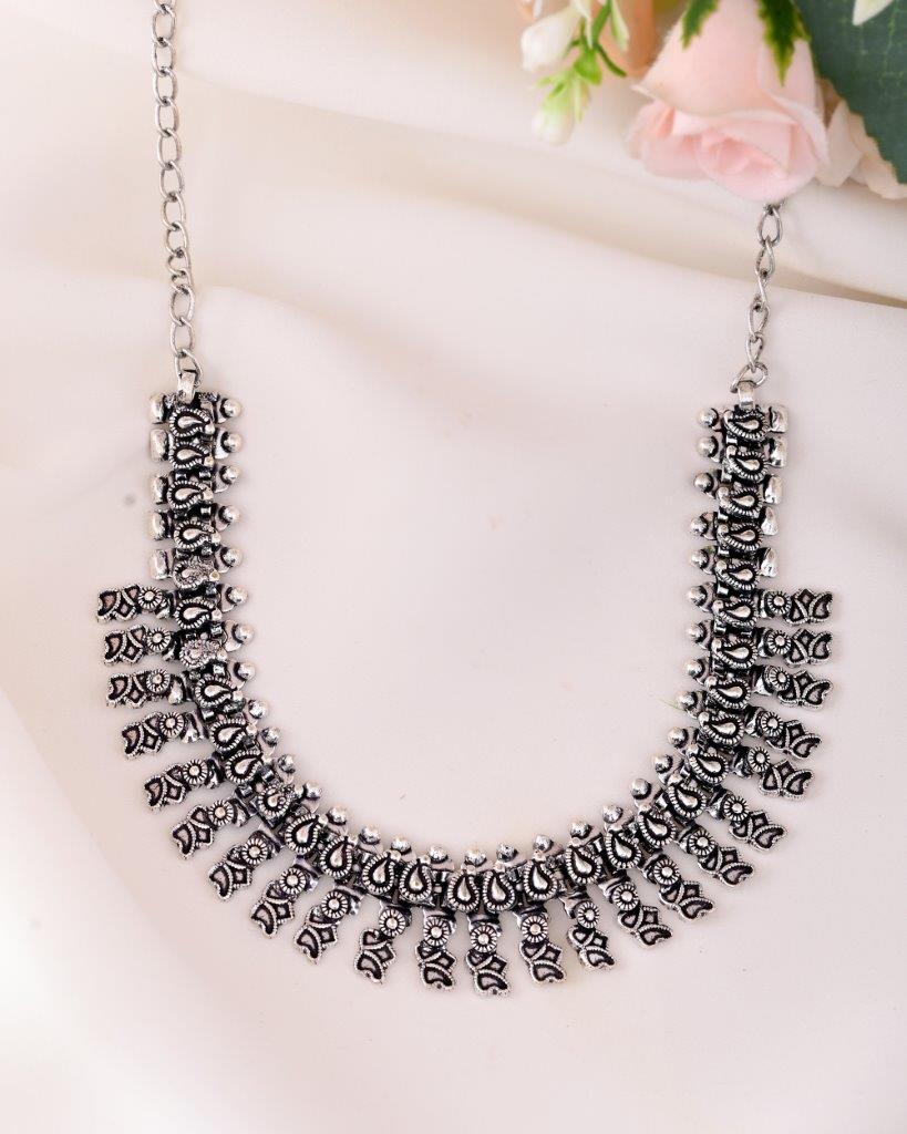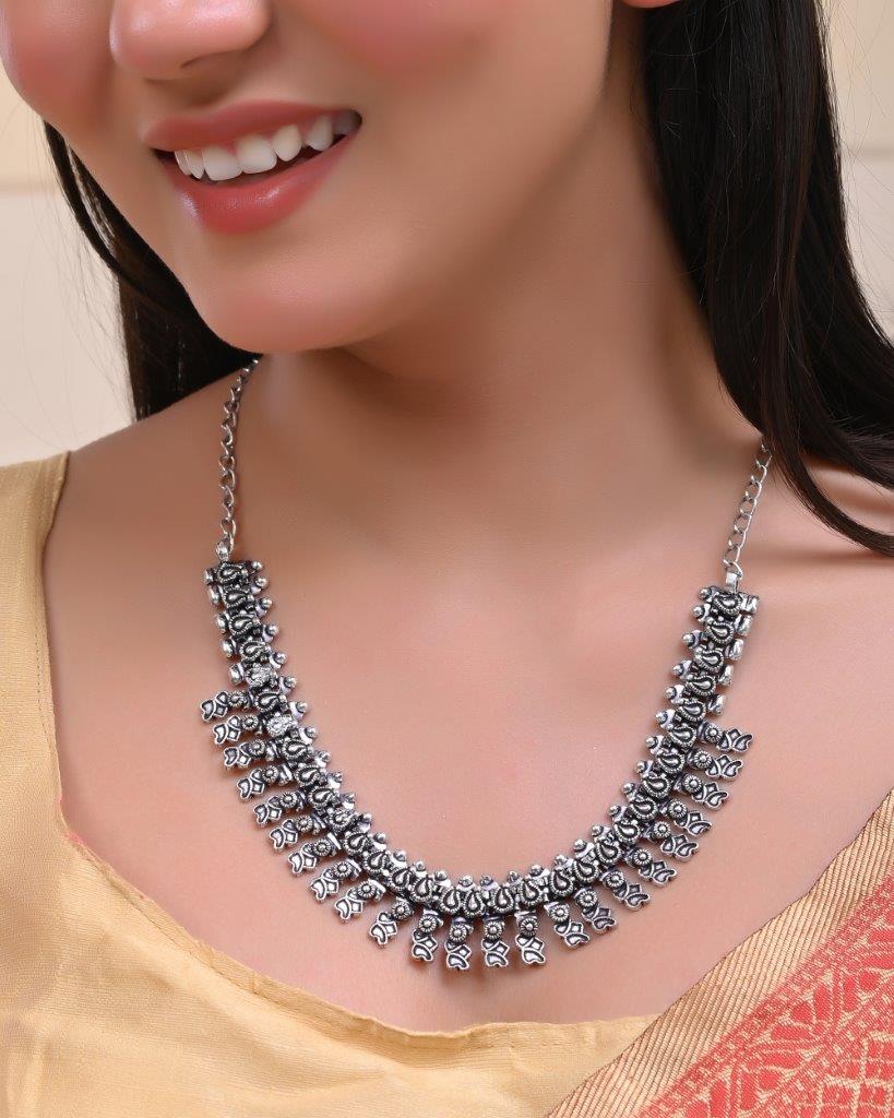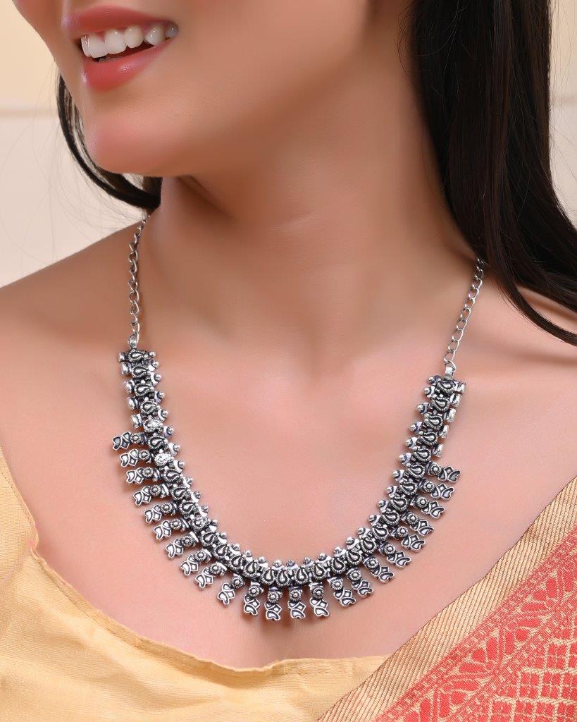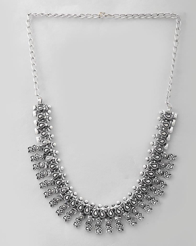 Introducing The Silver-Toned Silver-Plated Oxidized Necklace, A Stunning Accessory That Combines Modern Elegance With Vintage Charm. Crafted With High-Quality Silver Plating And Intricate Designs, This Lightweight Necklace Adds A Touch Of Sophistication To Any Outfit. Perfect For Everyday Wear Or Special Occasions, It’S An Ideal Gift For Loved Ones Or A Stylish Treat For Yourself.