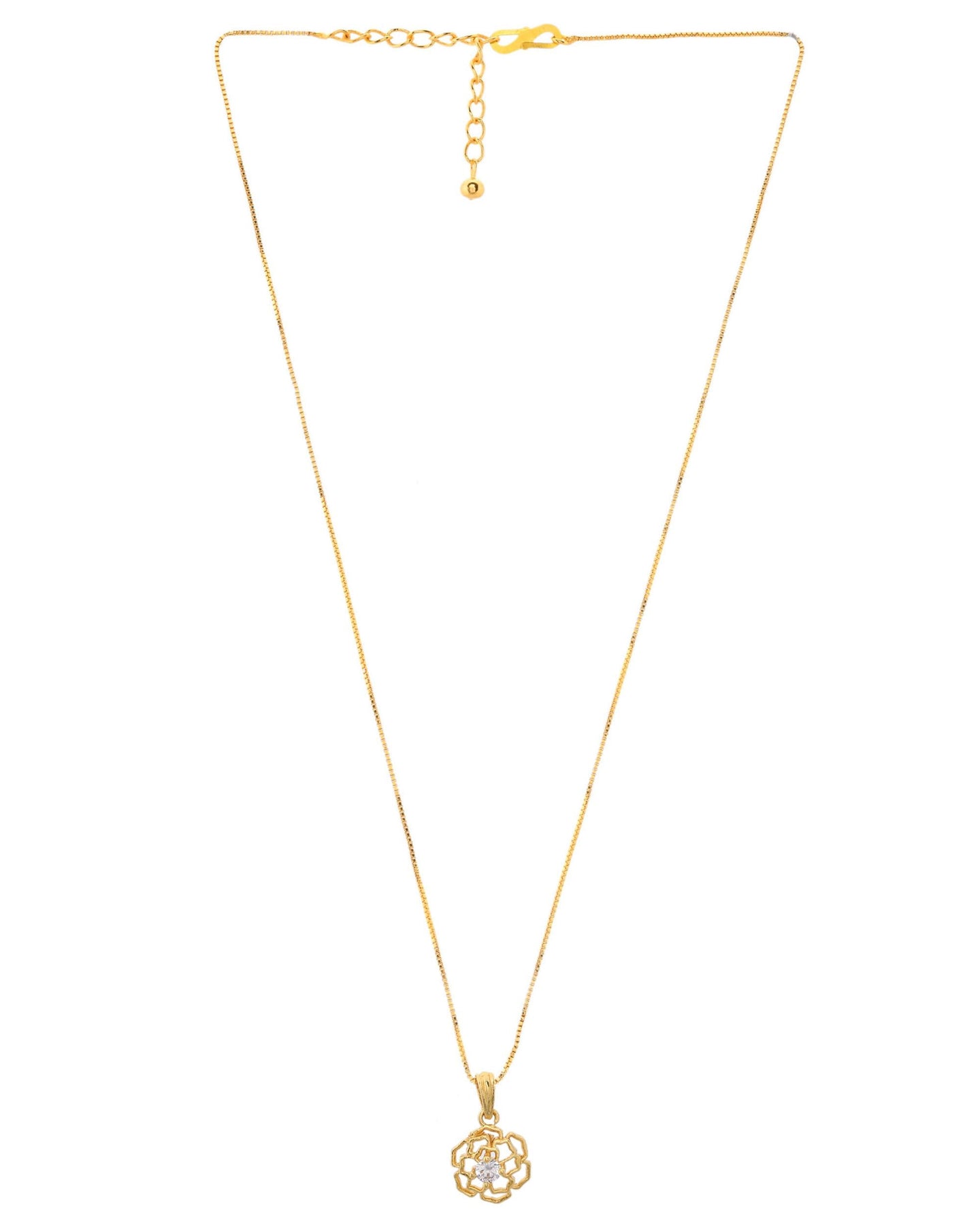 This Gold Plated Flower Shaped Ad Studded Pendant With Chain Combines Elegance And Sophistication. The Intricate Flower Design Is Adorned With Stunning Ad (American Diamond) Stones, Adding A Sparkling Touch To The Piece. The Gold Plating Ensures Durability, While The Delicate Chain Complements The Pendant Perfectly. Ideal For Adding A Chic And Luxurious Touch To Any Outfit.