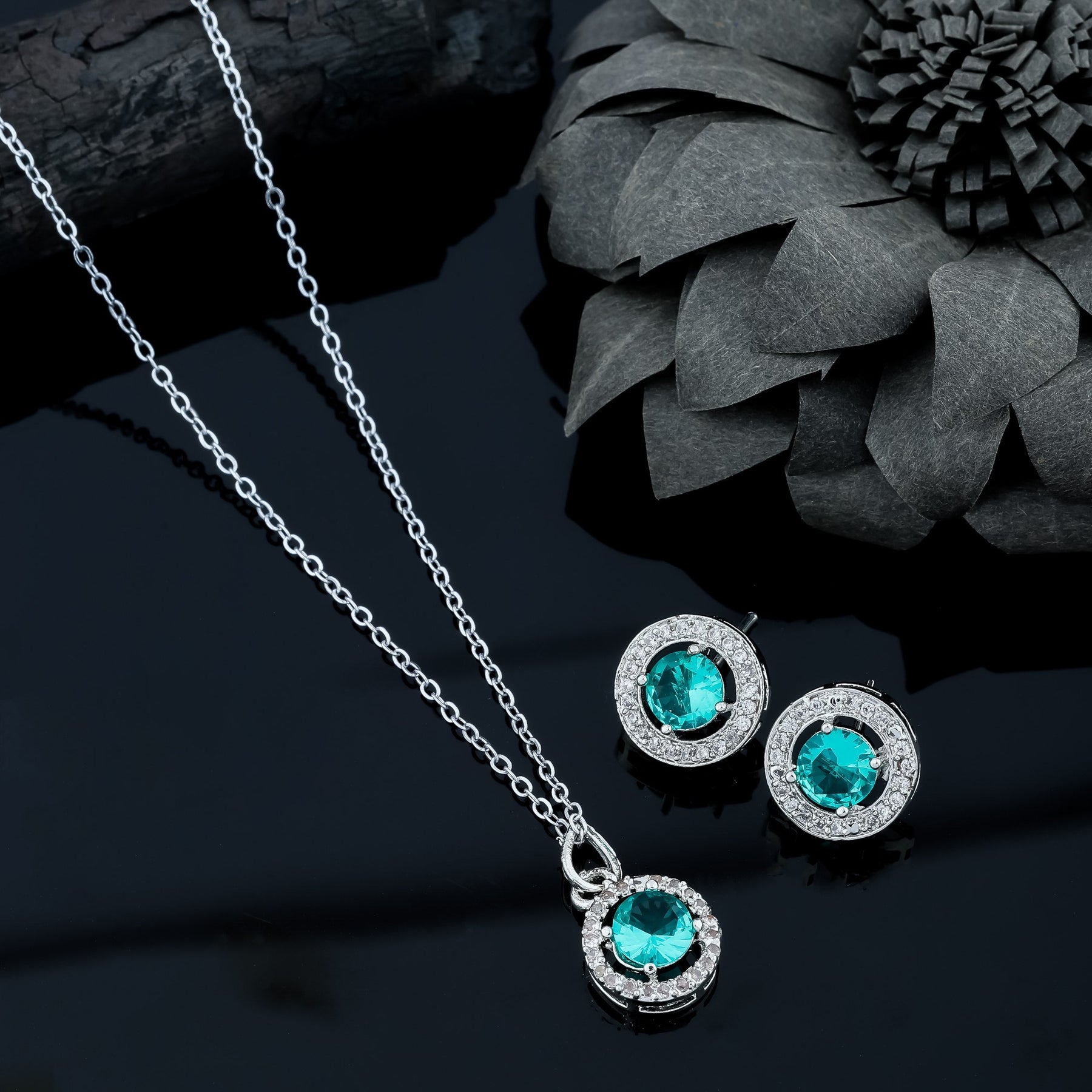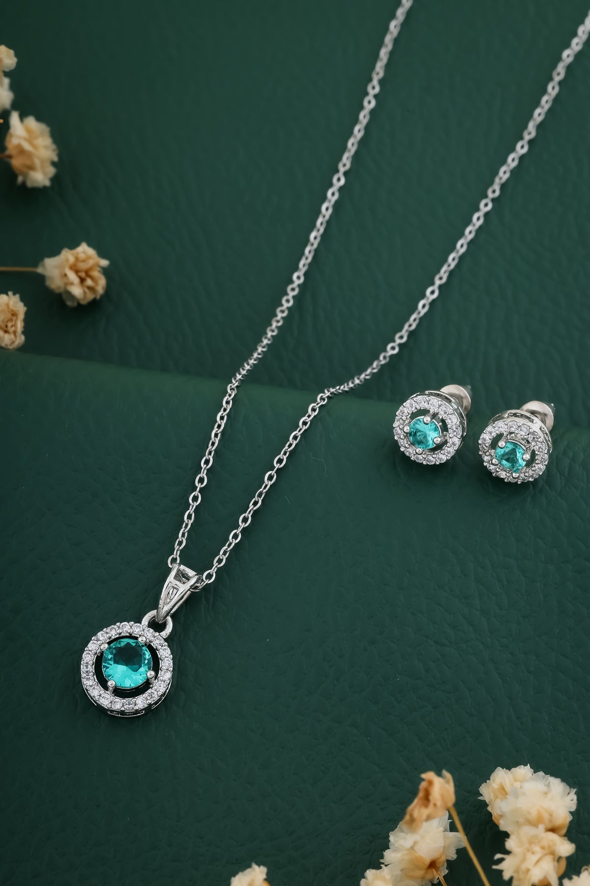 Rhodium Plated Pendant Chain, Has Sliver Toned Ad Sky Blue Stone-Studded Secured With A Hook Closure A Pair Of Matching Drop Earrings, Each Secured With A Post-And-Back