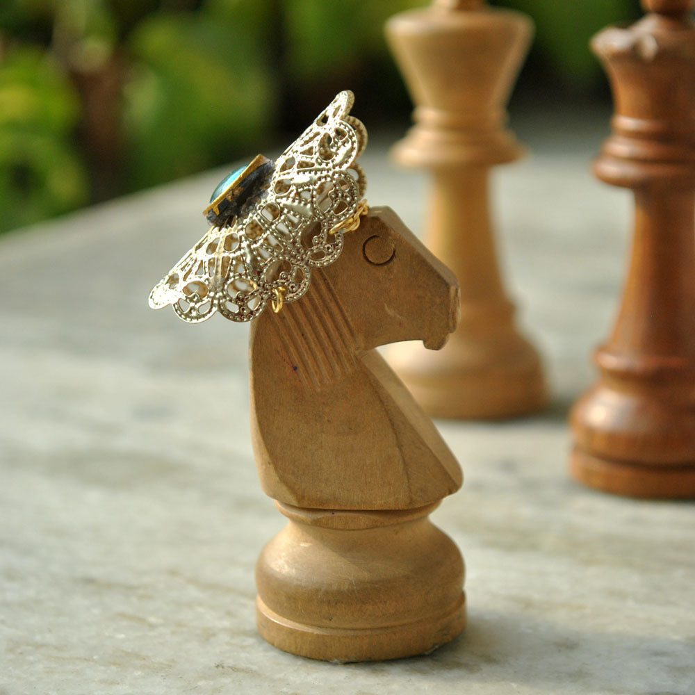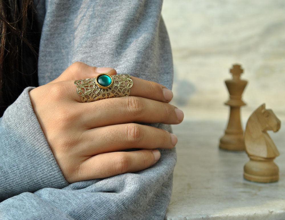 This Unique Ring Is Hand Crafted By Bending And Rolling A Lazer Cut Antique Flat Alloy Sheet, Keeping In Mind The Ergonomics So That It Is Comfortable To Wear. A Green Kundan Crystal On Top Adds An Unmatched Elegance To The Design.