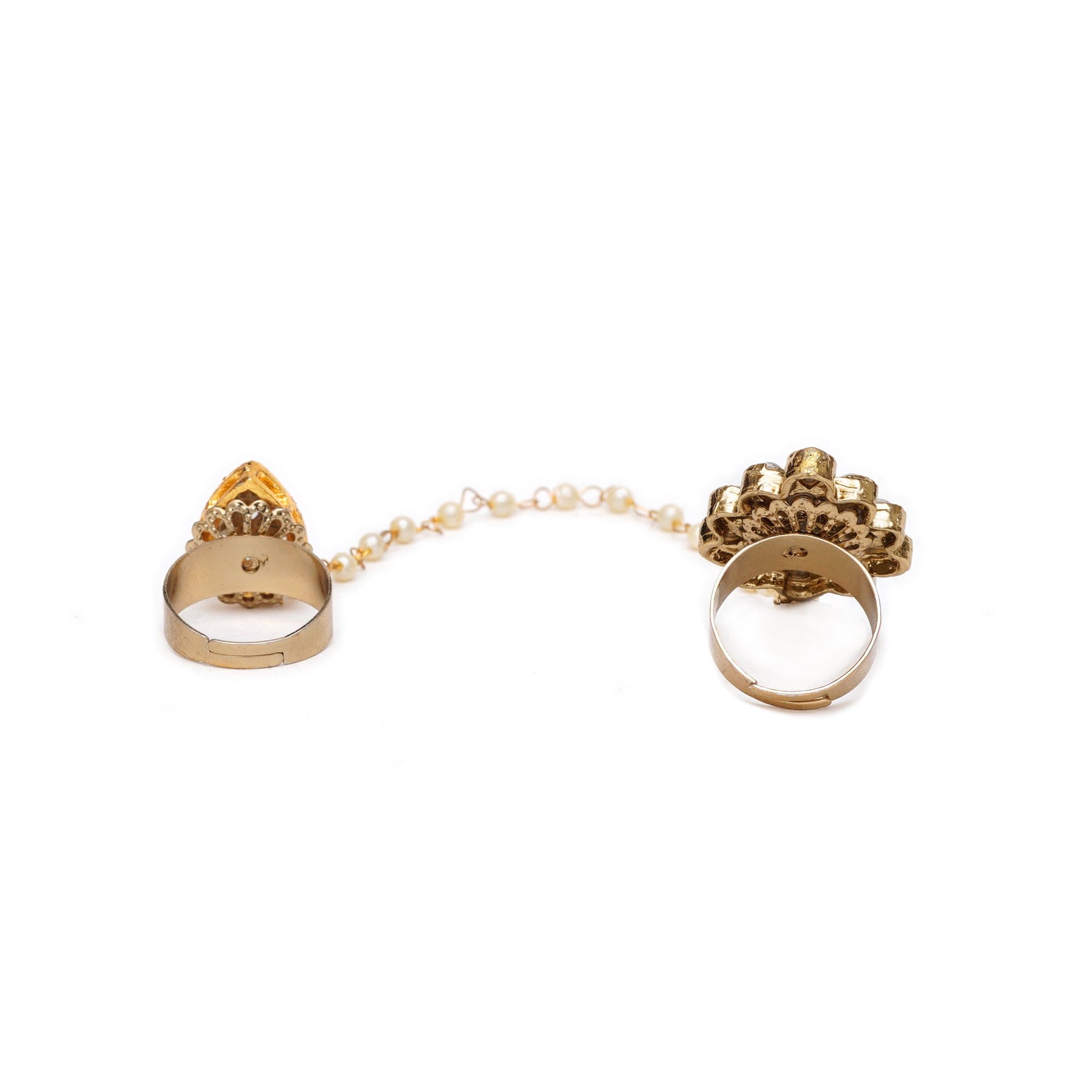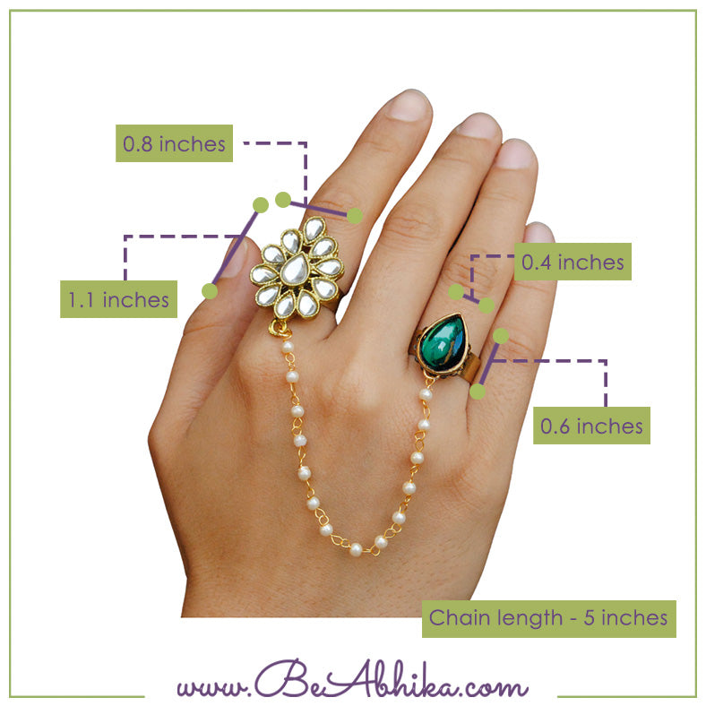 Own This Exclusive Two Finger Kundan Ring And Take Pride In Flaunting An Ethnic Design This Season. White Flower Kundan Ring And A Green Kundan Rings Are Connected By The Mesmerizing Green Cats Eye Beaded Chain