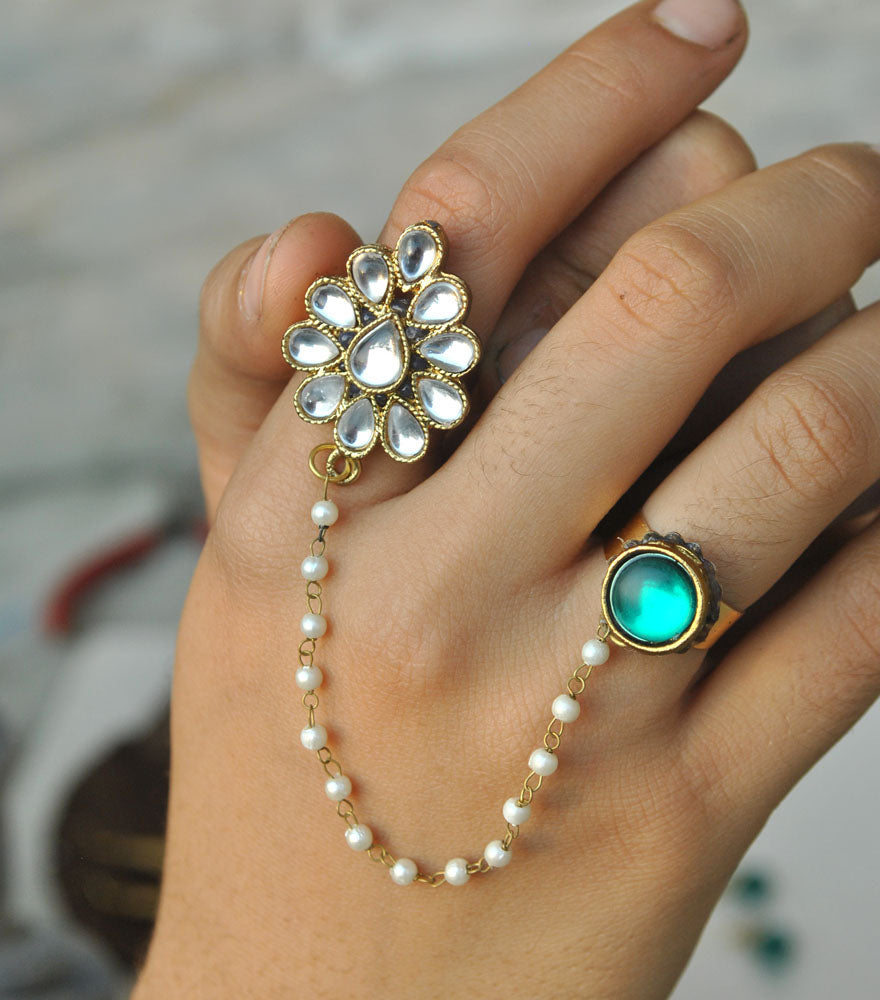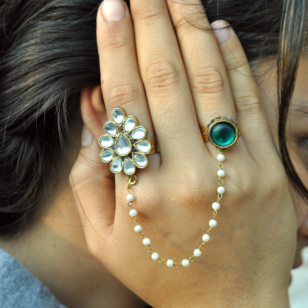 Own This Exclusive Two Finger Kundan Ring And Take Pride In Flaunting An Ethnic Design This Season. White Flower Kundan Ring And A Green Kundan Rings Are Connected By The Mesmerizing Green Cats Eye Beaded Chain