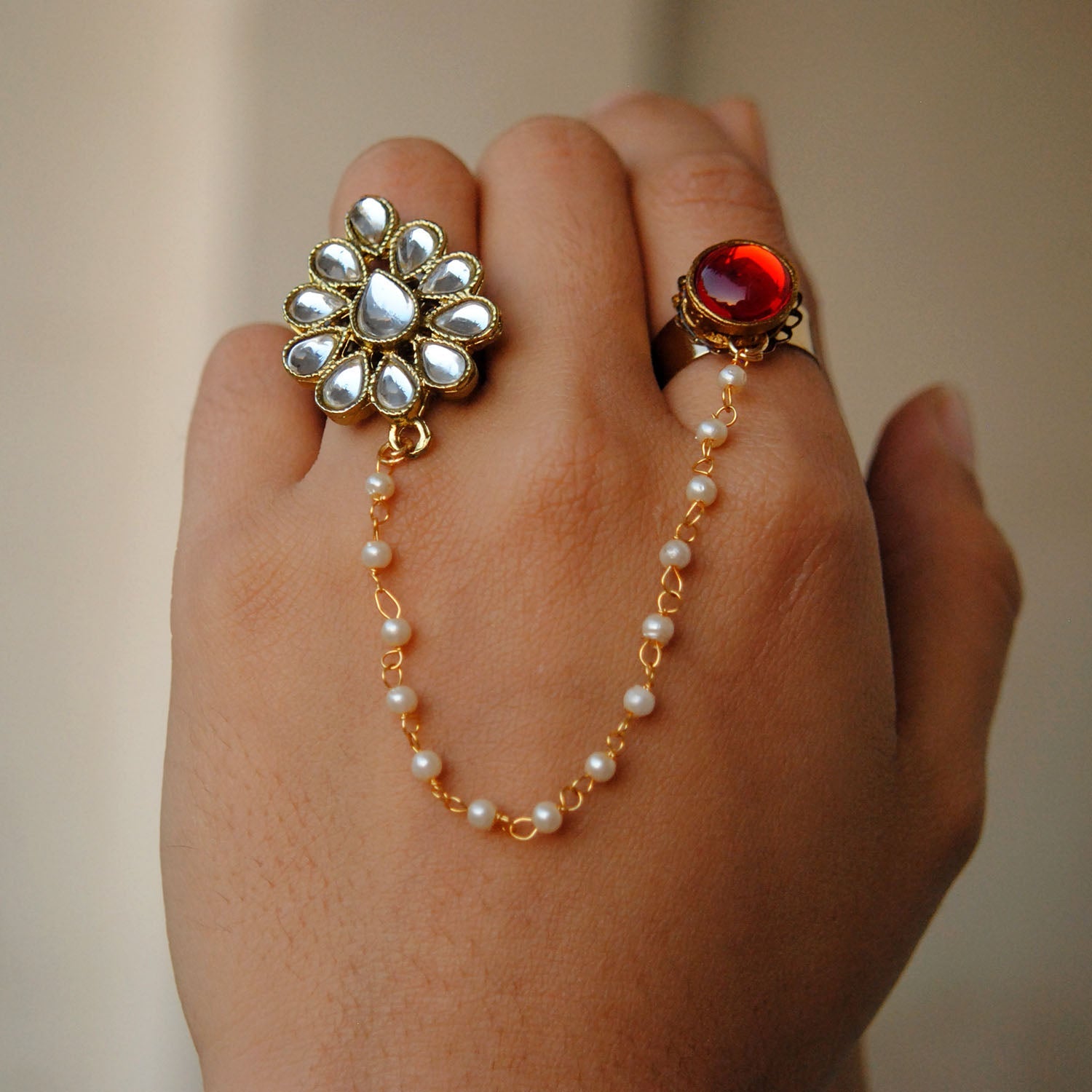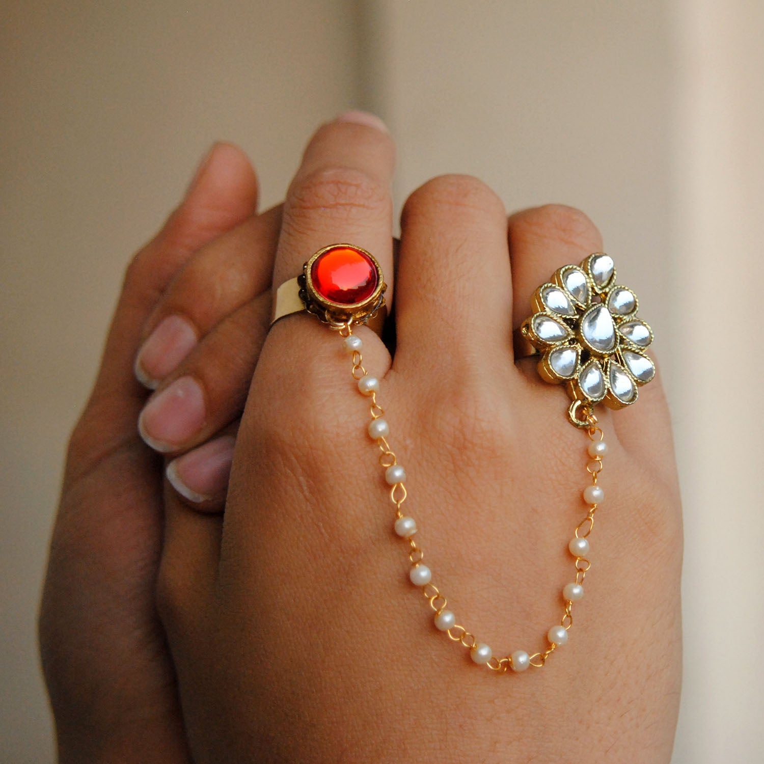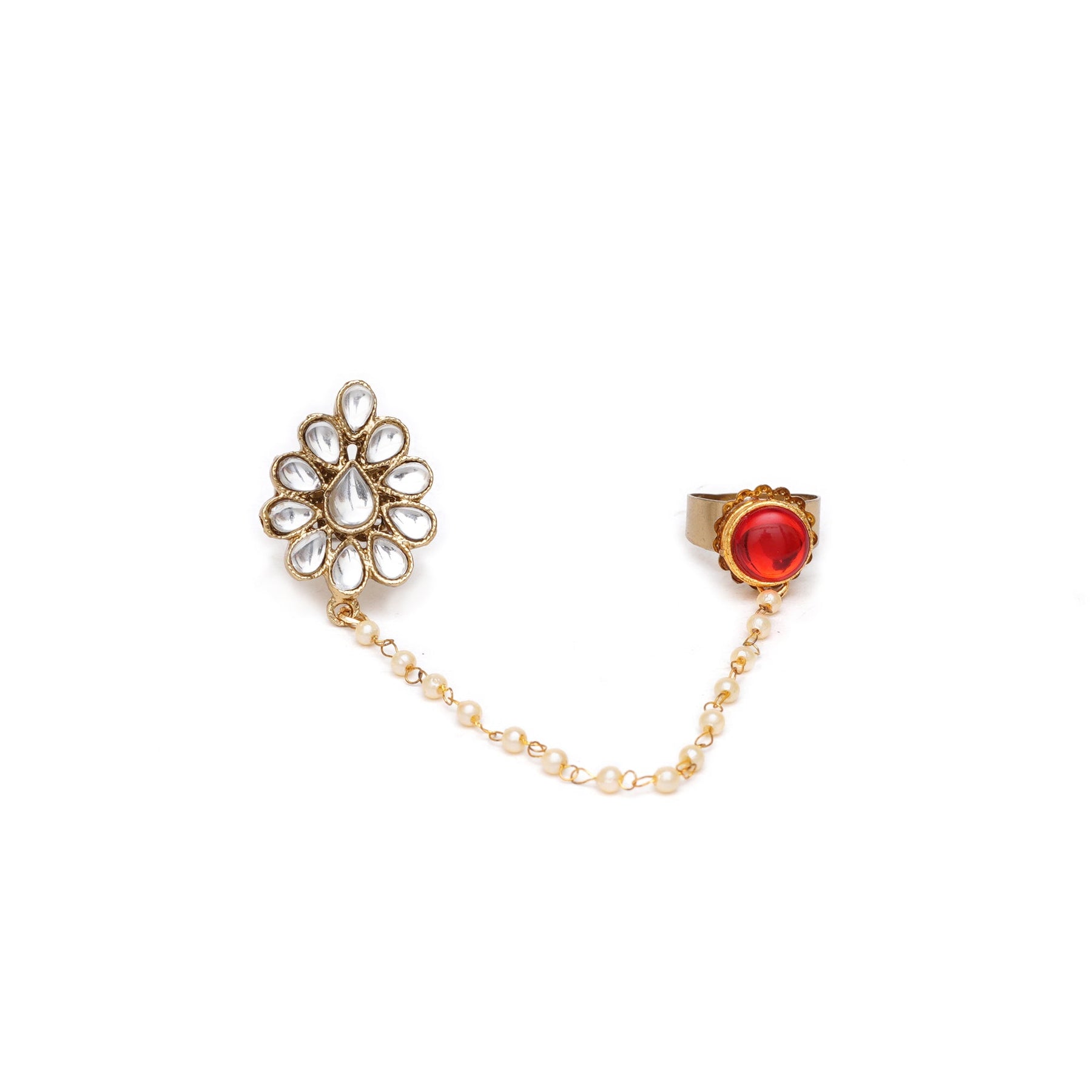 Own This Exclusive Two Finger Kundan Ring And Take Pride In Flaunting An Ethnic Design This Season. White Flower Kundan Ring And A Green Kundan Rings Are Connected By The Mesmerizing Green Cats Eye Beaded Chain