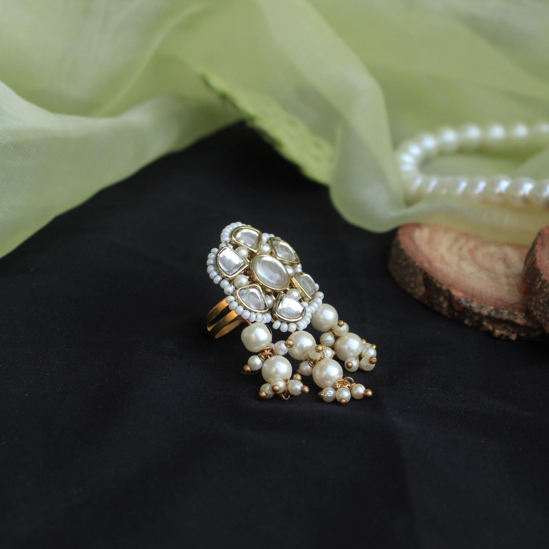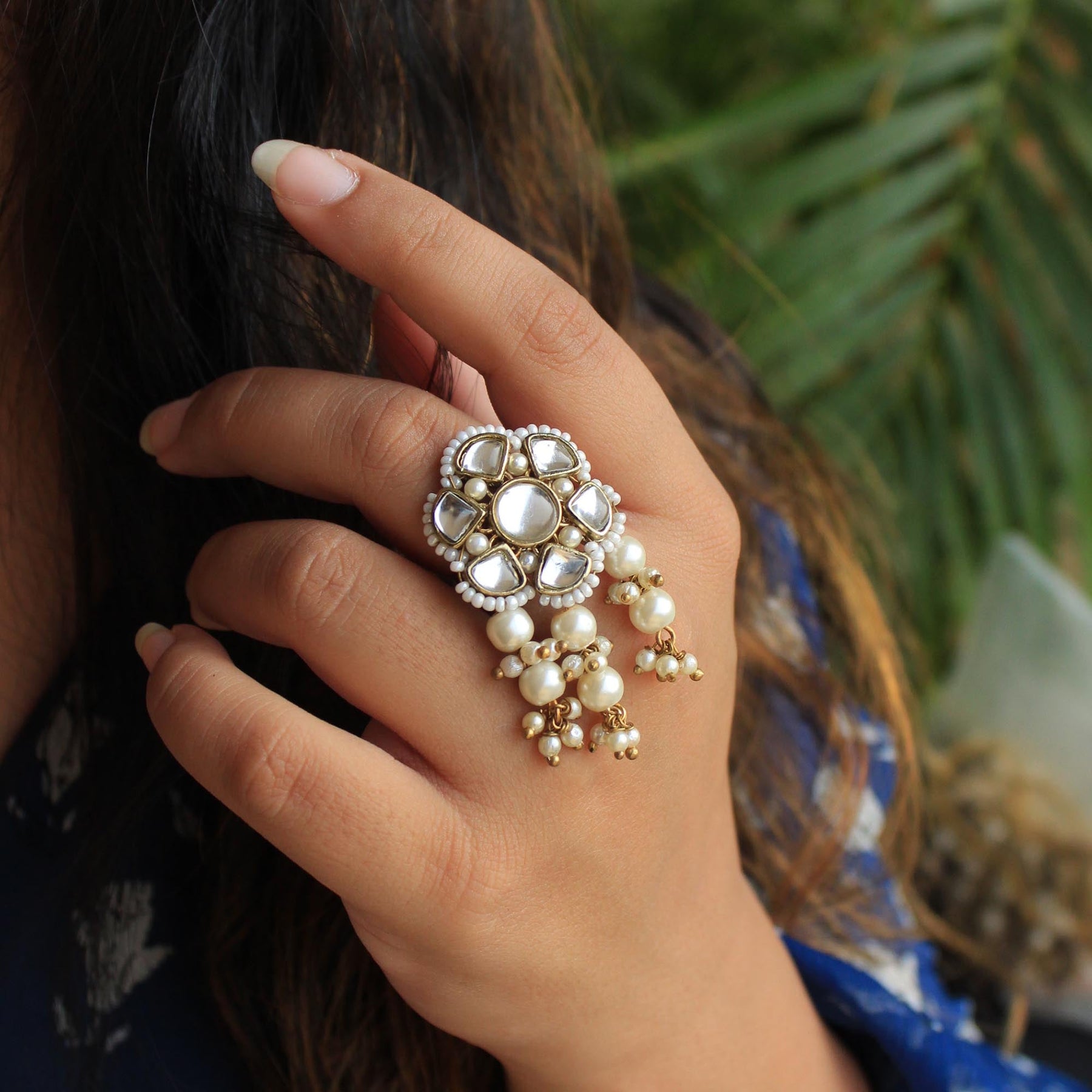 Statement Rings Are Hard To Miss Accessories And The Easiest To Adorn. This Ring Incorporates Stunning Kundan Flower, Enhanced By Baby Pearl Beads & Bunch Of Dangling Pearl Strings Elevating The Overall Look. An Adjustable Ring That Is A Must Have Design In Your Wardrobe.
