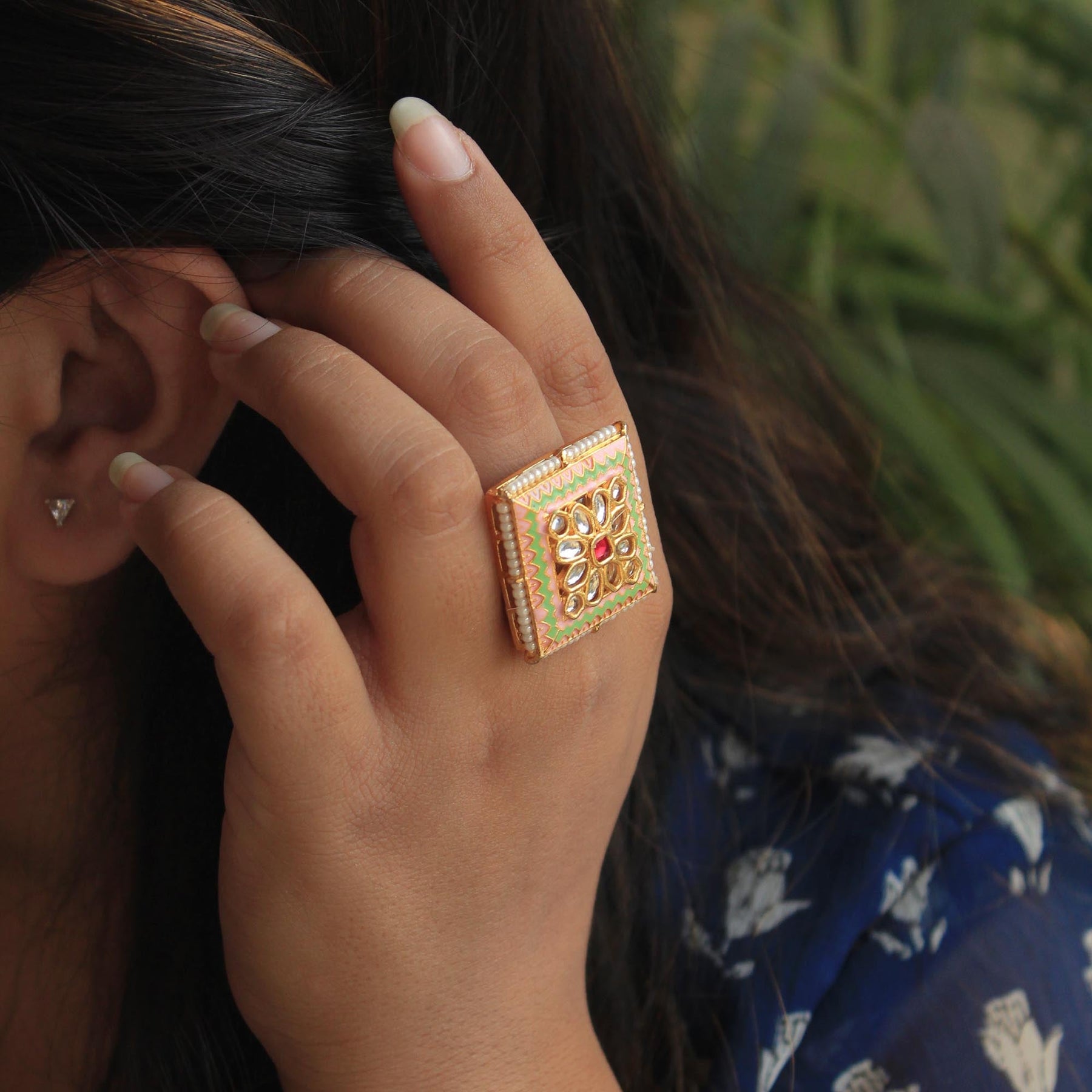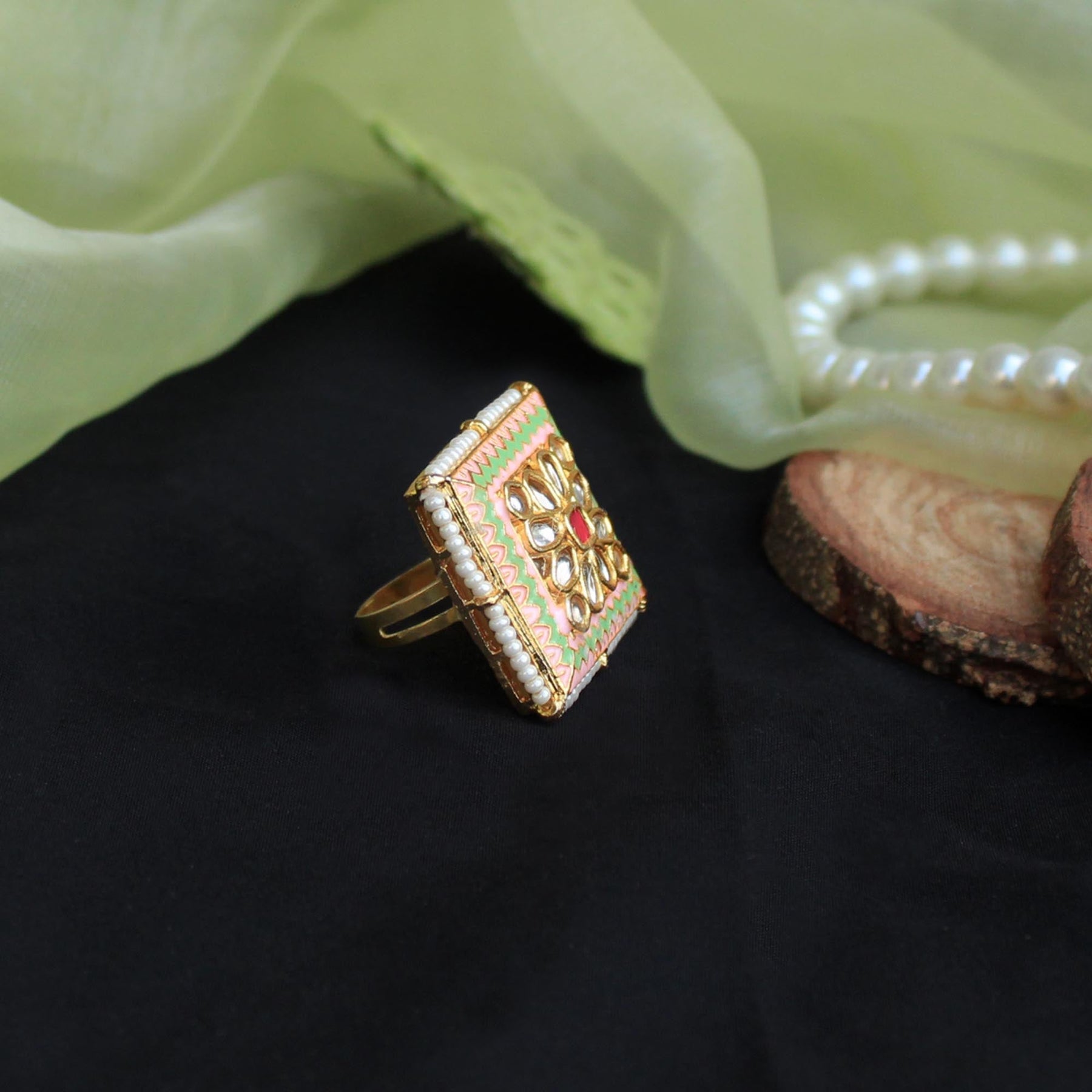 Modern Yet Profoundly Traditional. This Polki Ring Has A Classic And Yet Contemporary Feel To It. With Pastels Kicking In, We Bring To You This Pretty And Wearable Mid-Sized Ring. Enamelled In Pretty Pink And Mint Green Color, Adds Beauty To Its Overall Ensemble.