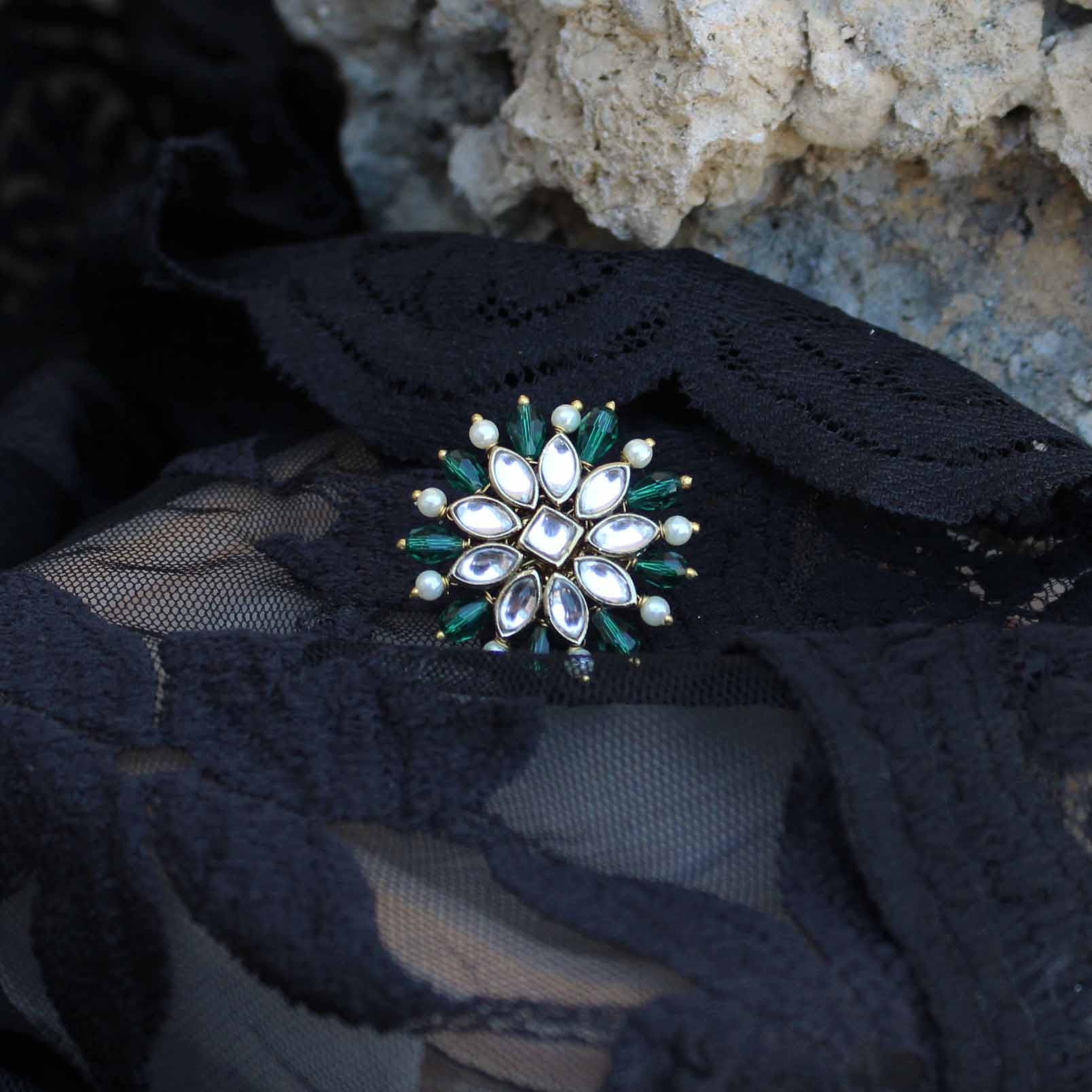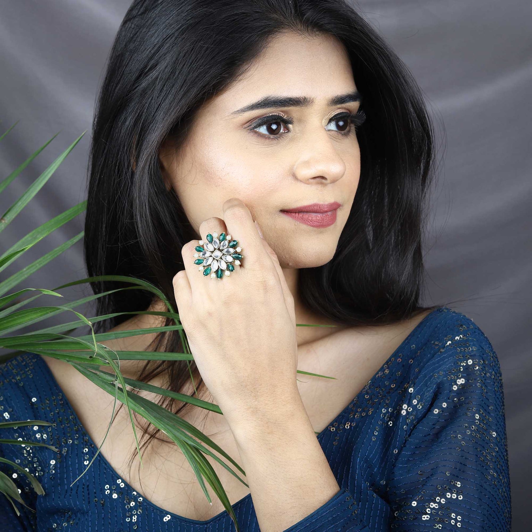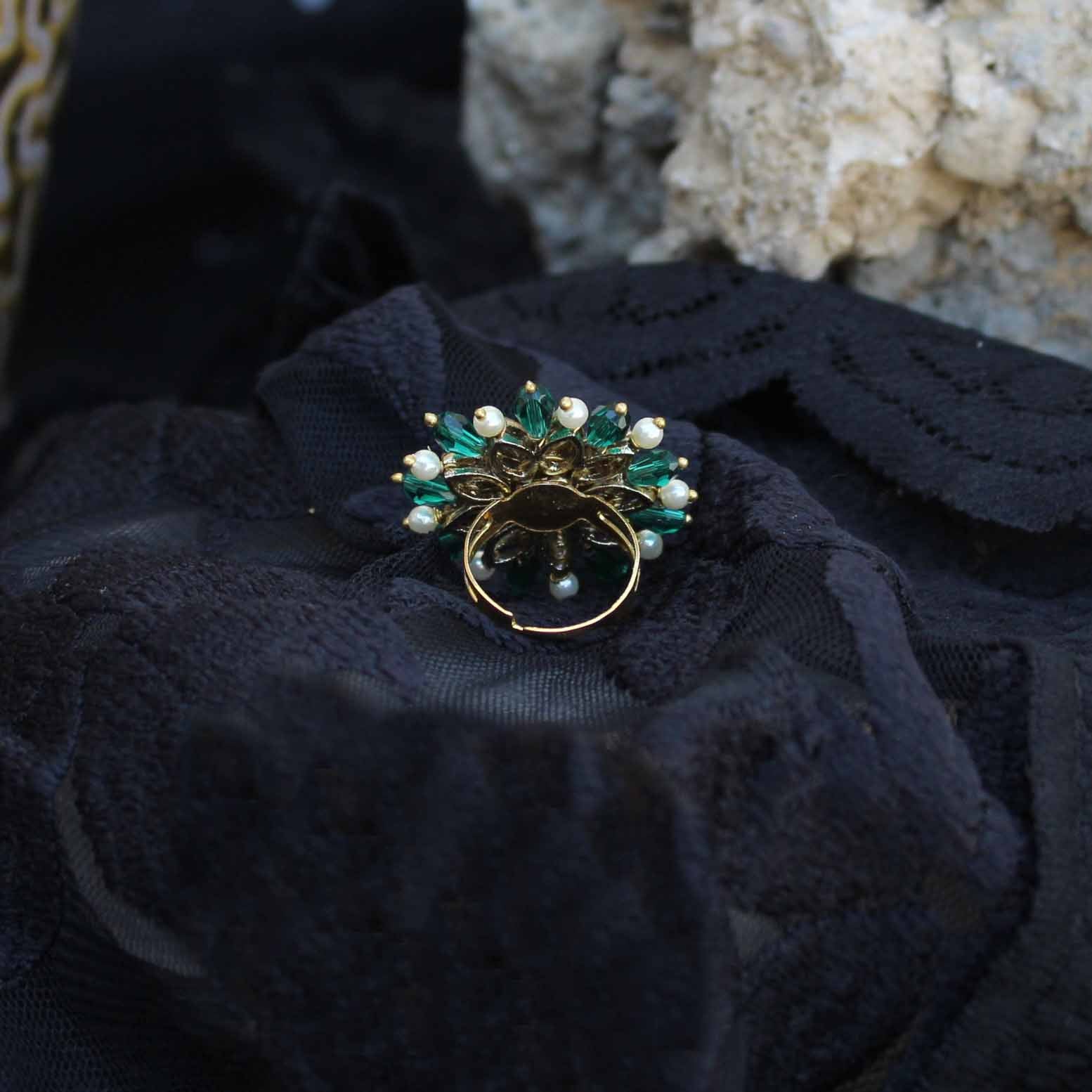 Classic Ring Never Goes Out Of Style, And This Handcrafted Masterpiece Is A Testament To That. The Timeless Beauty Ofpine Green Colored Precious Stones And Intricate Purple Kundan Work, Combined With A Delicate Floral Motif, Makes This Piece Both Elegant And Durable. Whether You'Re Dressing Up In Traditional Attire Or Contemporary Wear, This Versatile Accessory Is Sure To Elevate Your Look. Invest In The Enduring Charm Of Classic Jewelry And Add This Exquisite Piece To Your Collection Today.