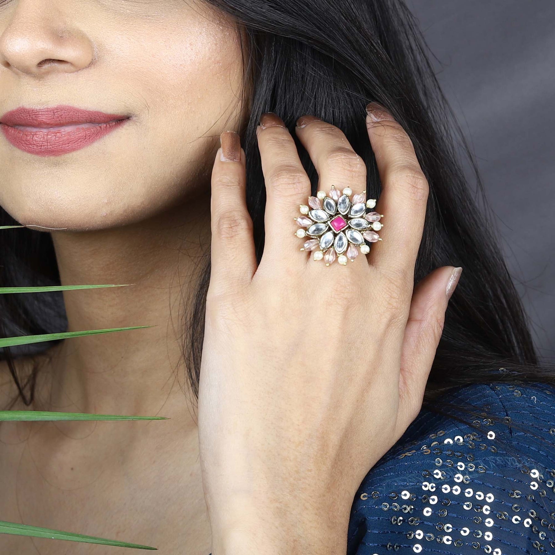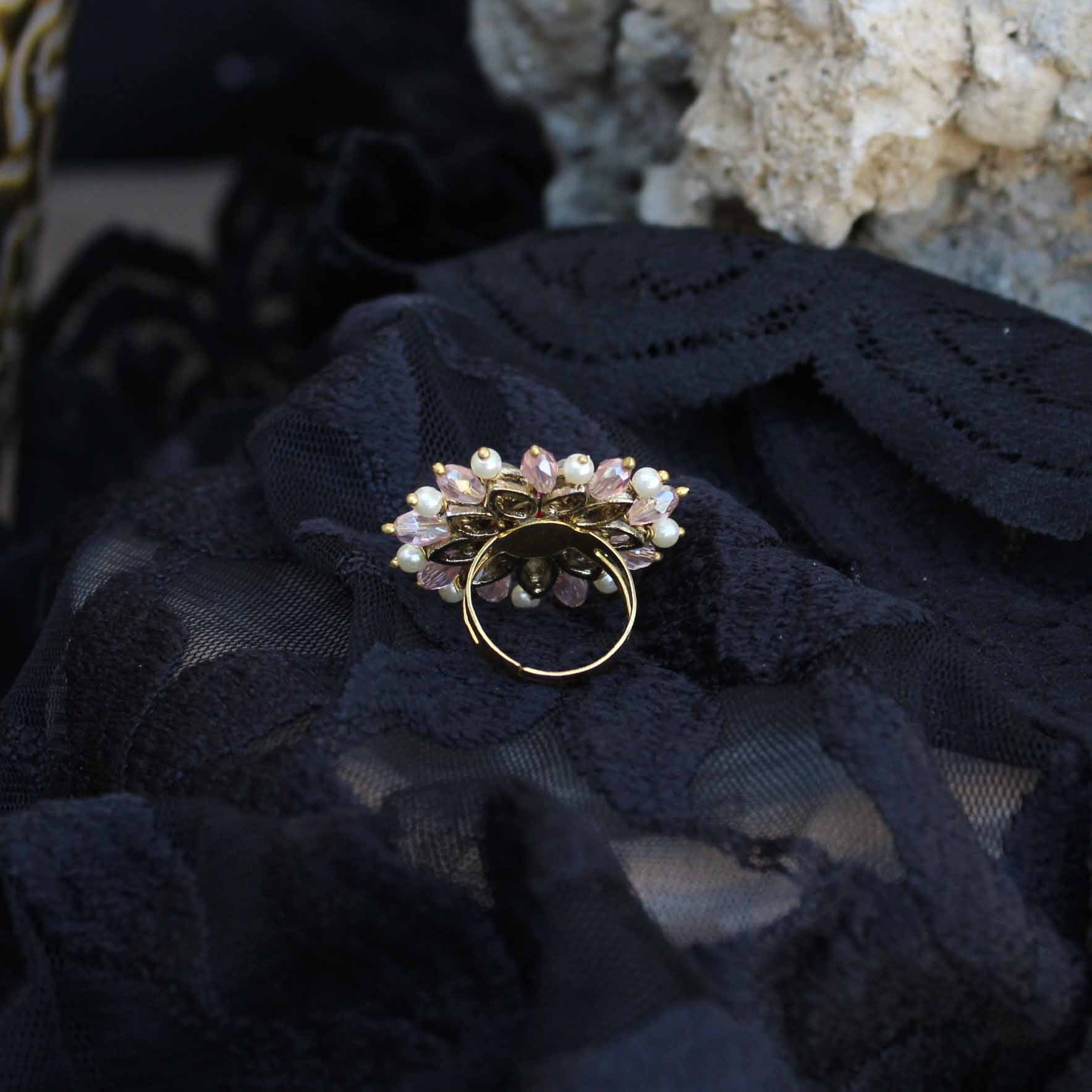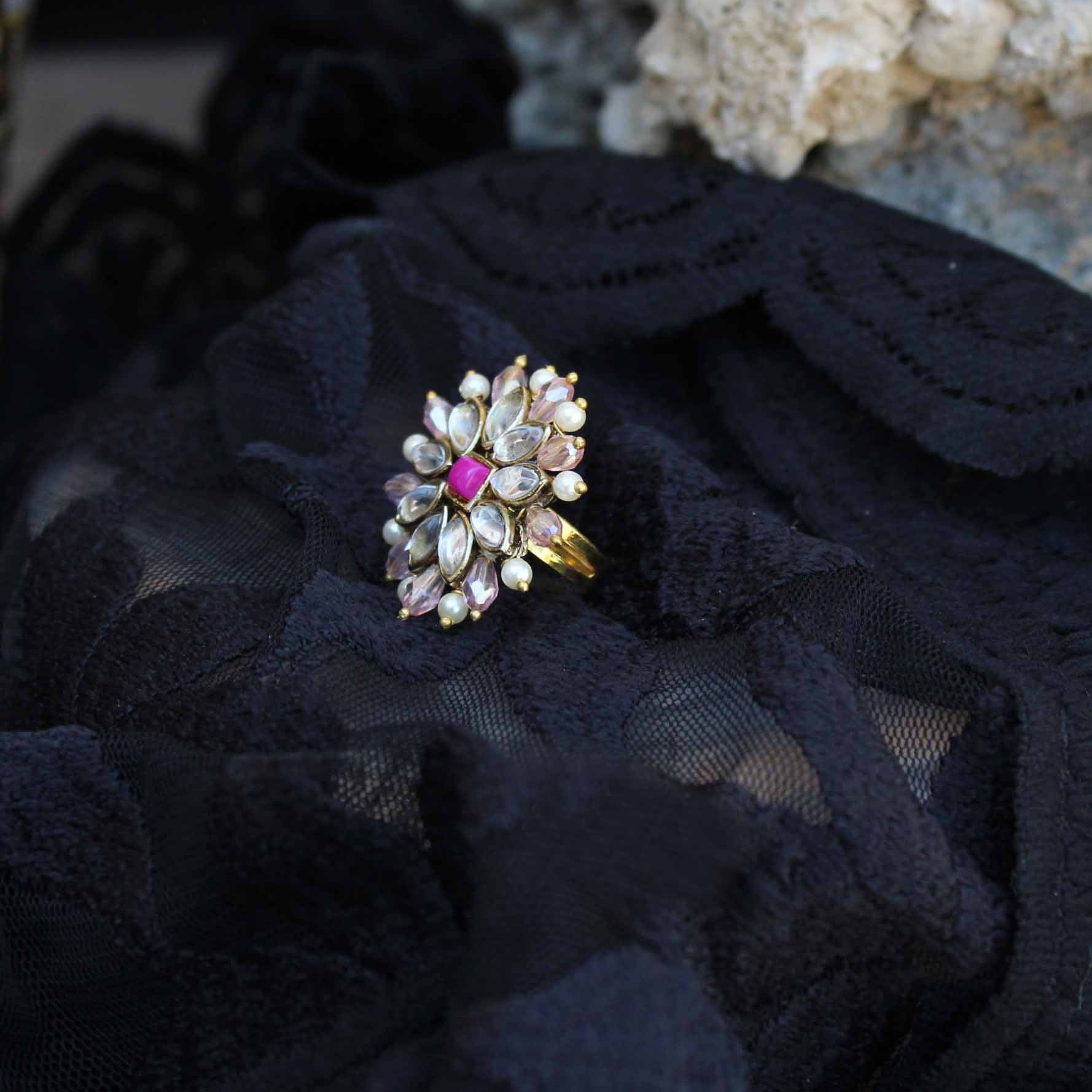 Classic Ring Never Goes Out Of Style, And This Handcrafted Masterpiece Is A Testament To That. The Timeless Beauty Of Light Pink Colored Precious Stones And Intricate Purple Kundan Work, Combined With A Delicate Floral Motif, Makes This Piece Both Elegant And Durable. Whether You'Re Dressing Up In Traditional Attire Or Contemporary Wear, This Versatile Accessory Is Sure To Elevate Your Look. Invest In The Enduring Charm Of Classic Jewelry And Add This Exquisite Piece To Your Collection Today.