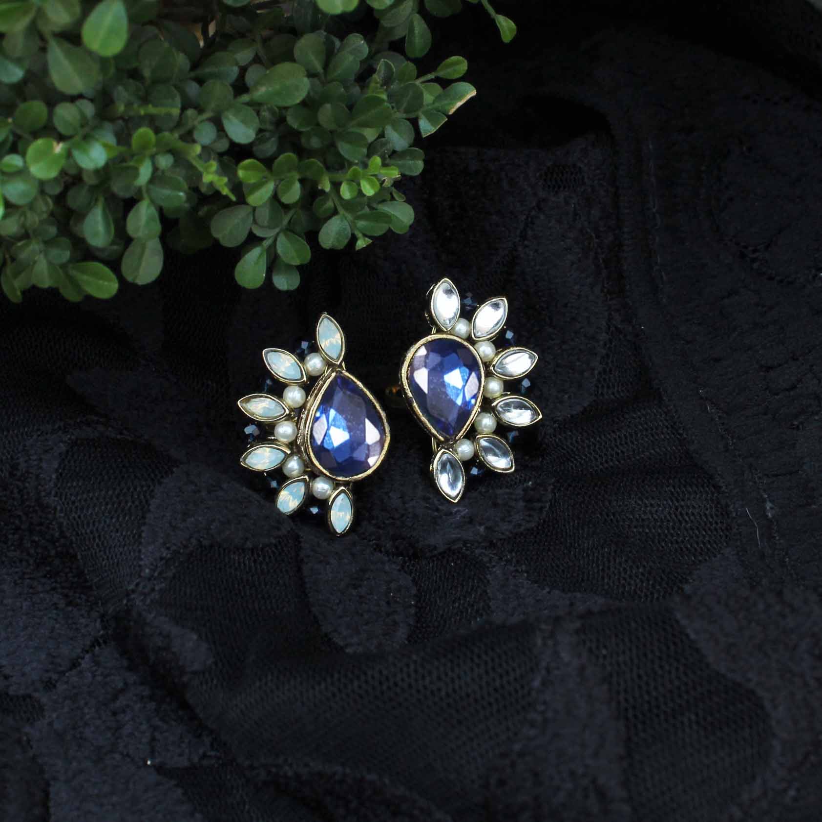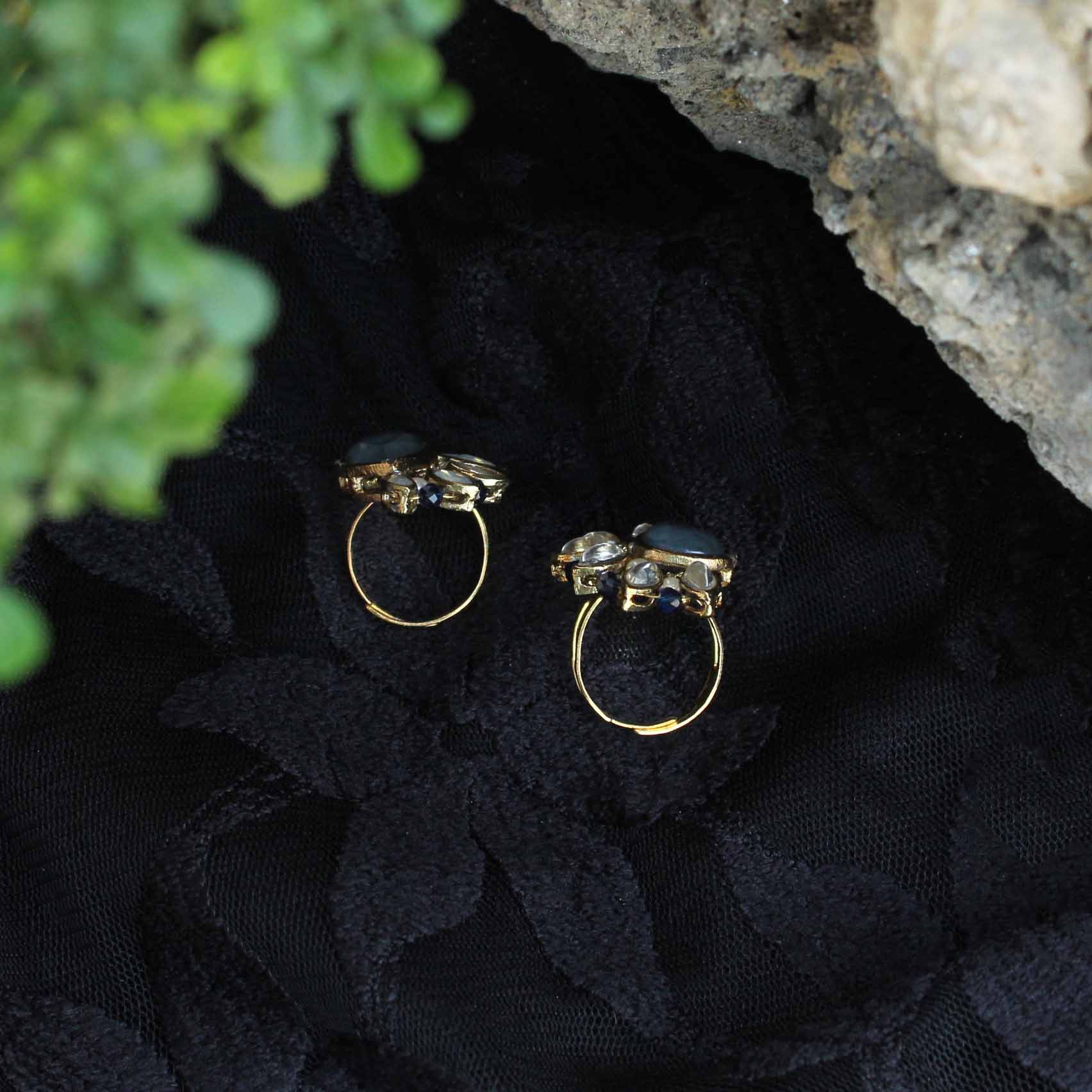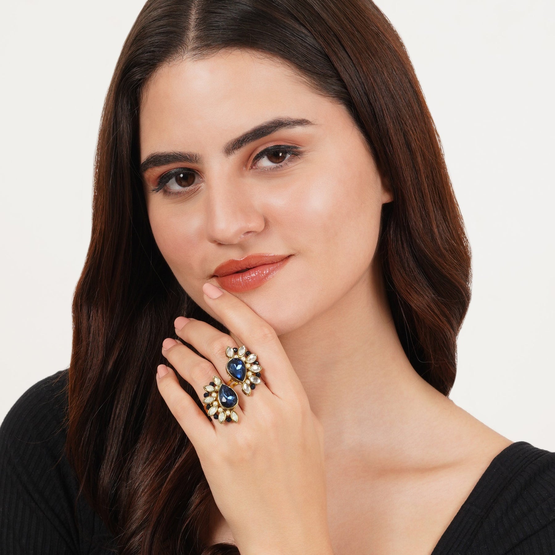 Elevate Your Ethnic Or Evening Look With These Stunning Blue Crescent Two Ring From Our Collection. Handcrafted With Kundan Stone Studs And Beads. They'Re Versatile And Can Be Paired With Any Ethnic Outfit Or Evening Wear To Complete A Dazzling Look. Add A Touch Of Elegance To Your Wardrobe With These Gorgeous Handcrafted Chandelier Earrings.