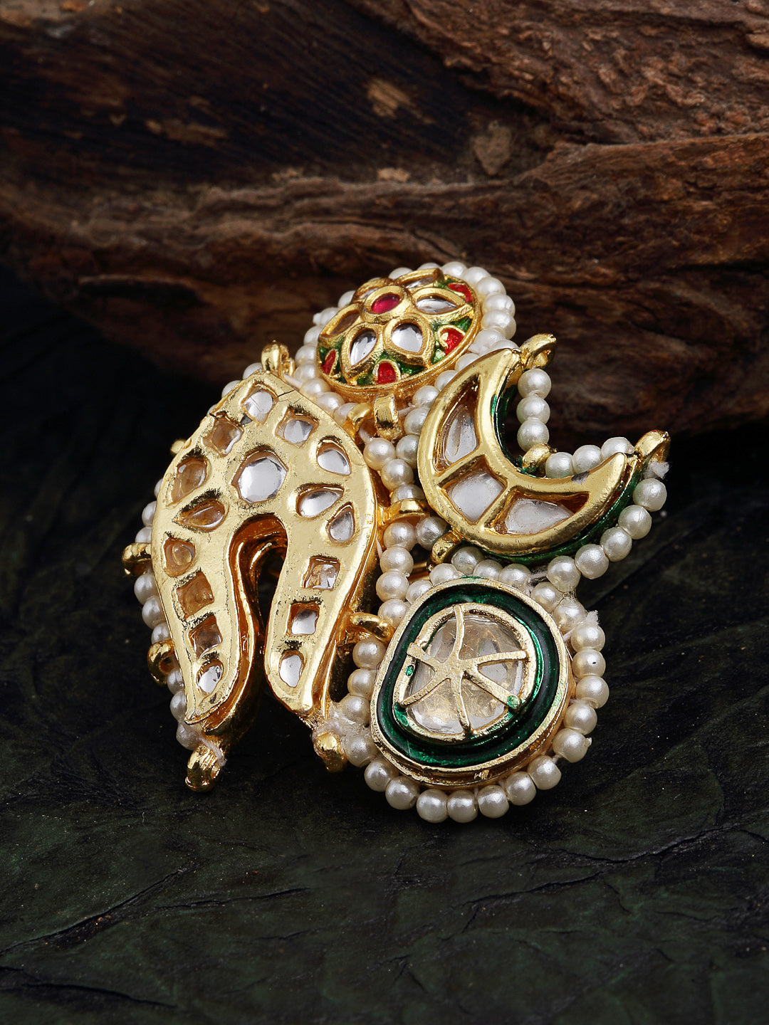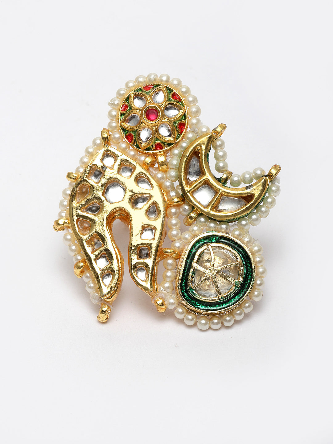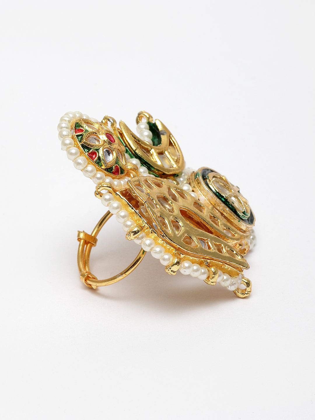 Amalgamation Of Various Colors For This Season Flaunt Best Version Of Urself In You; Category Of Jewellery Is Hand Jewellery; Sub Category Is Ring; Ideal For Women; Color Is Red, Green, Gold, White; Gemstones Used - Kundan, Pearls, Natural Stones; Plating Is Gold-Plated; Base Metal Is Alloy; Other Material Used - None; Size Is Freesize; Adjustable - Yes; Weight Is 15 Gms; Mesaurements - Length Of Ring= 4.6 Cm; Width Of Ring =3.7 Cm; Adjustable - Yes; Content 1 Ring