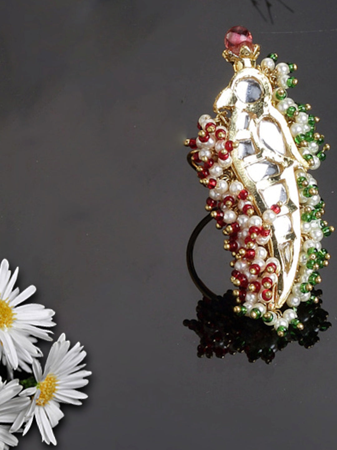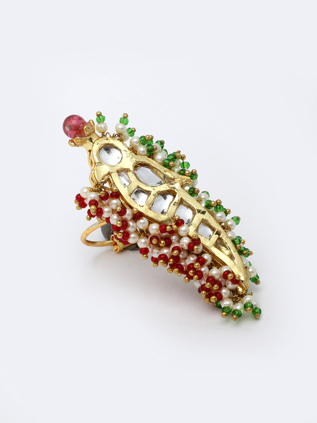 Handcrafted Parrot Ring Highlighted With Red And Green Looped Attention Around And Toped With Pink Sapphire Head Makes You Flaunt Best Version Of U This Season.; Category Of Jewellery Is Hand Jewellery; Sub Category Is Ring; Ideal For Women; Color Is Red, Green, Gold, White; Gemstones Used - Kundan, Pearls, Natural Stones; Plating Is Gold-Plated; Base Metal Is Alloy; Other Material Used - None; Size Is Freesize; Adjustable - Yes; Weight Is 13 Gms; Mesaurements - Length Of Ring =6 Cm; Width Of Ring = 3 Cm; Diameter Of Ring =2 Cm; Circumference Of Ring = 6.8 Cm; Adjustable - Yes; Content 1 Ring