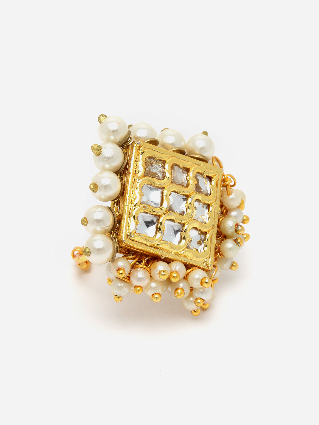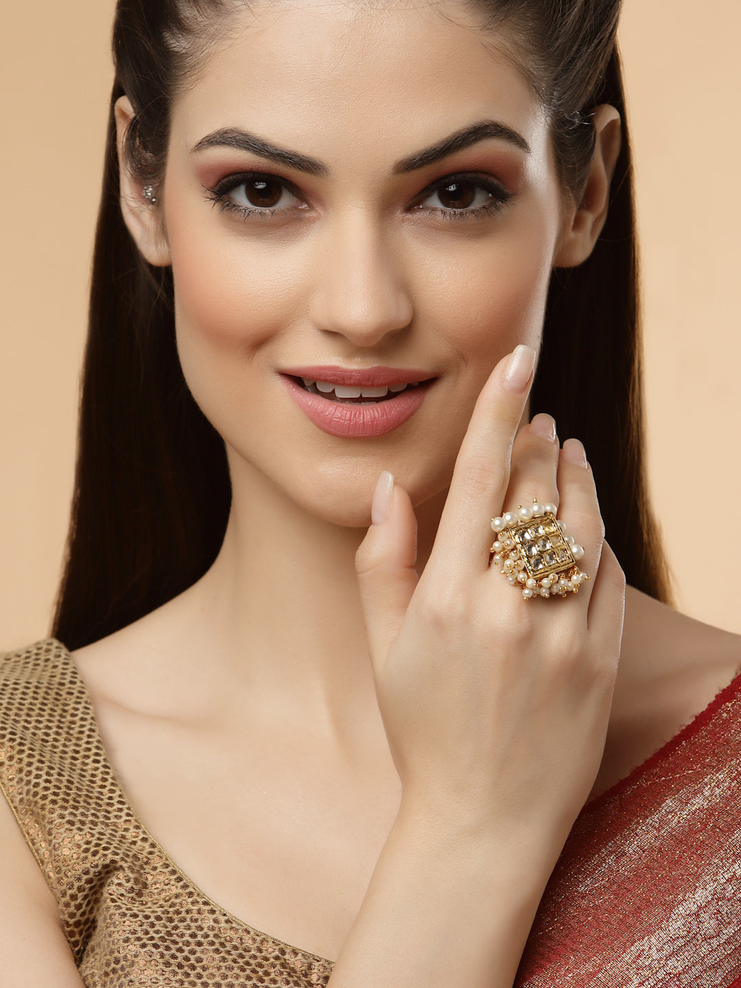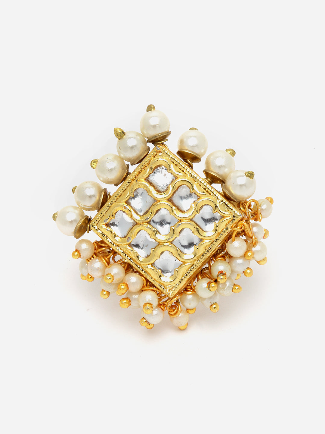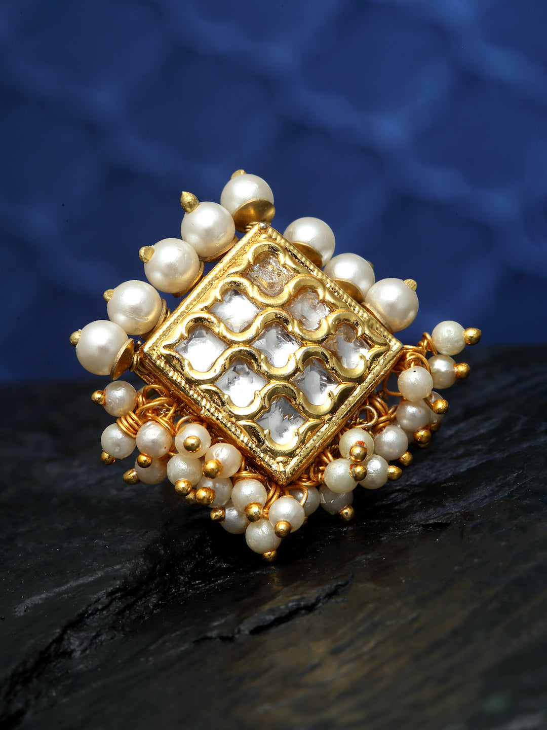 Handcarfted Kundan Pc Highlighted With Pearls Is Super Light. Flaunt Ur Best Version Of Hands This Festive Season.; Category Of Jewellery Is Hand Jewellery; Sub Category Is Ring; Ideal For Women; Color Is Gold, White; Gemstones Used - Kundan, Pearls, Natural Stones; Plating Is Gold-Plated; Base Metal Is Alloy; Other Material Used - None; Size Is Freesize; Adjustable - Yes; Weight Is 11 Gms; Mesaurements - Length Of Ring= 3.5 Cm; Width Of Ring =3.5 Cm; Adjustable - Yes; Content 1 Ring