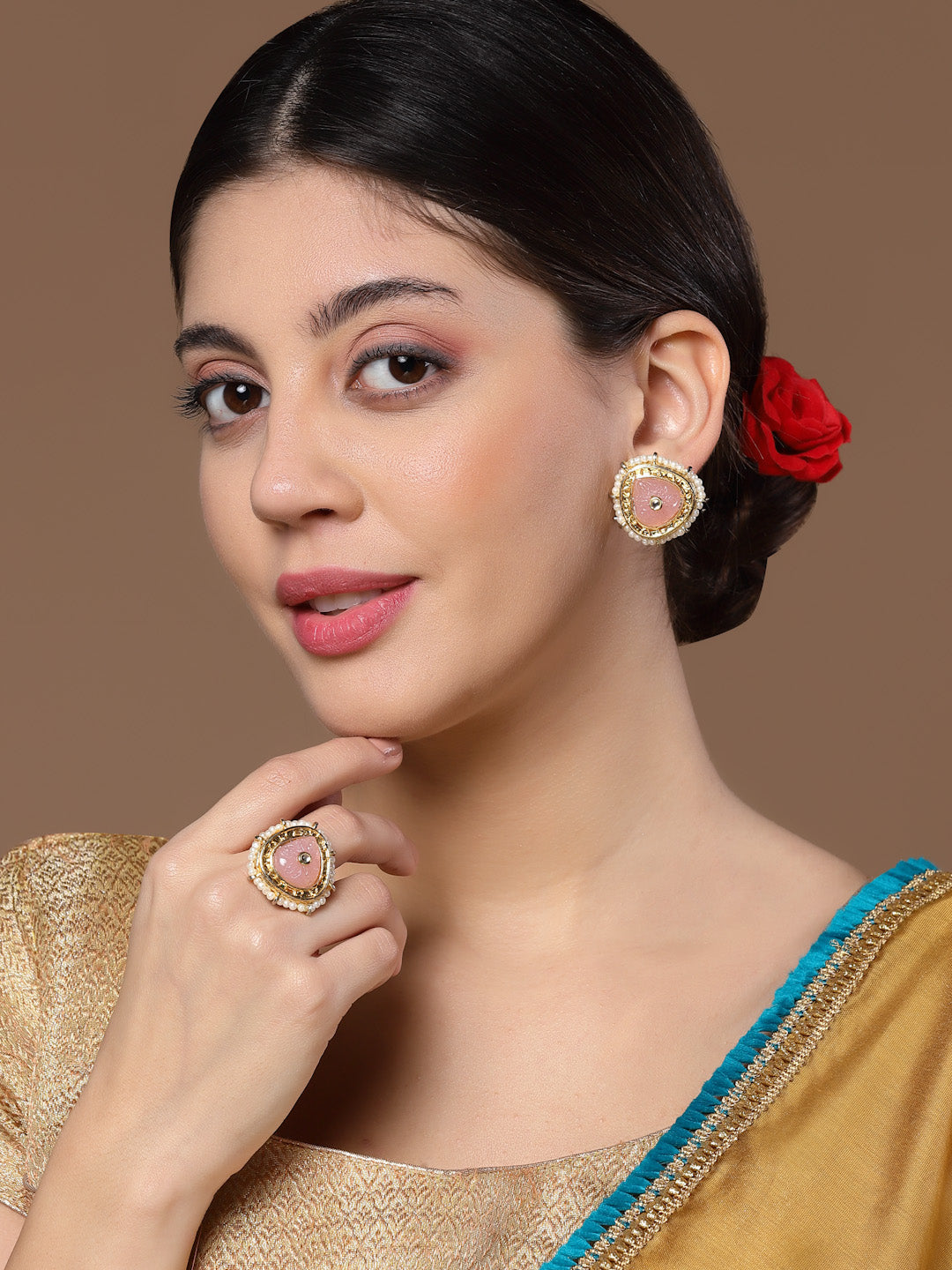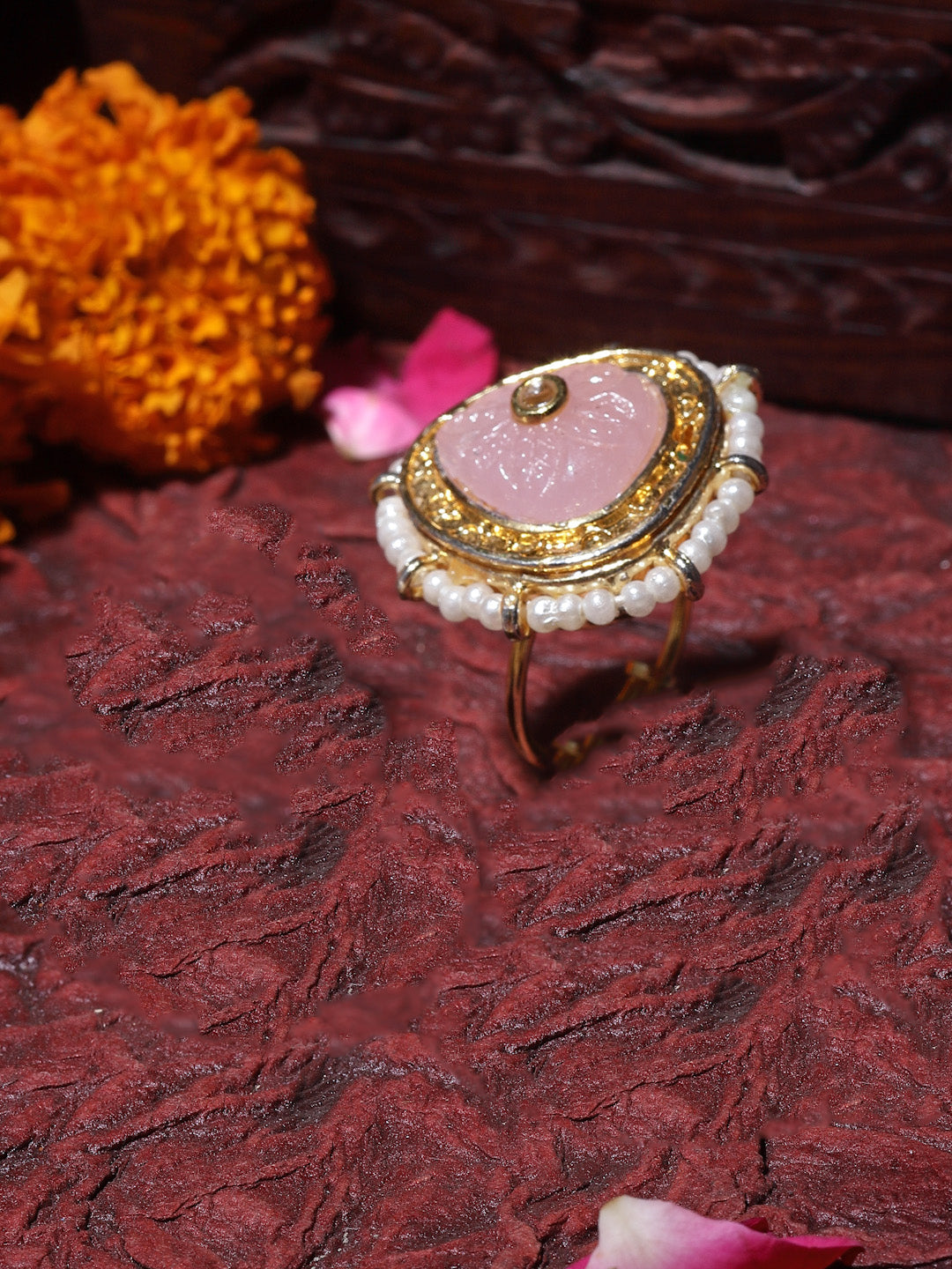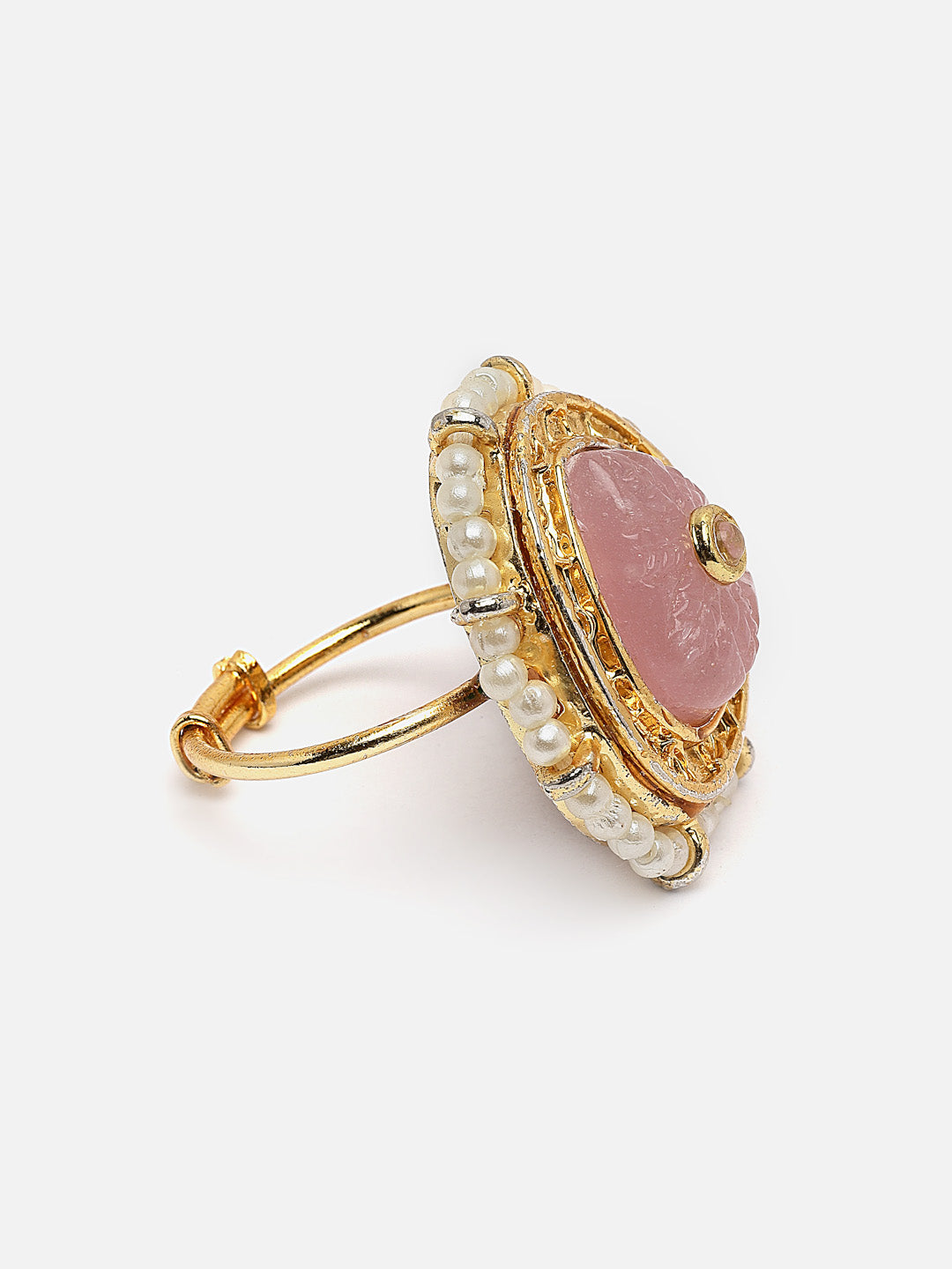 Pink Carving Ring; Category Of Jewellery Is Hand Jewellery; Sub Category Is Ring; Ideal For Women; Color Is Pink, Cream, Gold ; Gemstones Used - Kundan, Pearls, Natural Stones; Plating Is Gold-Plated; Base Metal Is Alloy; Other Material Used - Adjustable Ring; Size Is Freesize; Adjustable - Yes ; Weight Is 10 Gms; Mesaurements - Length Of Ring =3 Cm; Width Of Ring = 4 Cm; Diameter Of Ring =1.65 Cm; Circumference Of Ring = 5.18 Cm; Adjustable - Yes ; Content 1 Ring