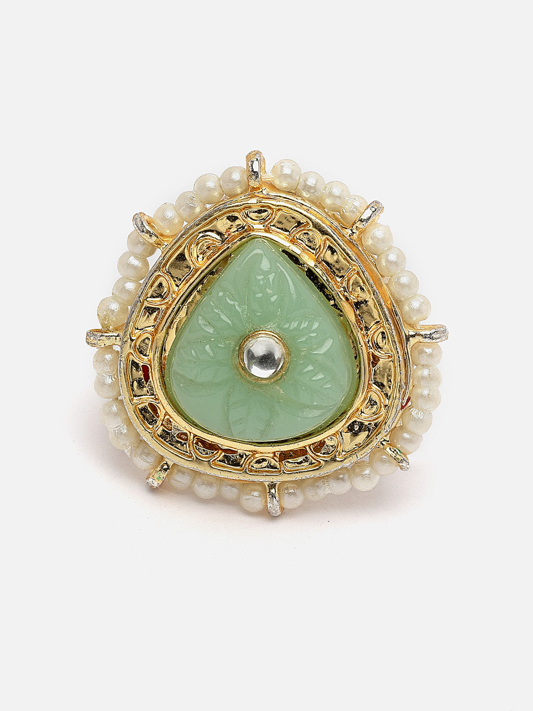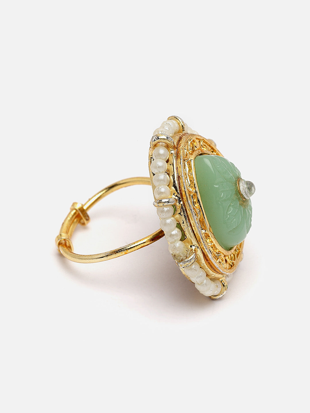 Mint Green Carving Ring; Category Of Jewellery Is Hand Jewellery; Sub Category Is Ring; Ideal For Women; Color Is Green, Cream, Gold ; Gemstones Used - Kundan, Pearls, Natural Stones; Plating Is Gold-Plated; Base Metal Is Alloy; Other Material Used - Adjustable Ring; Size Is Freesize; Adjustable - Yes ; Weight Is 10 Gms; Mesaurements - Length Of Ring =3 Cm; Width Of Ring = 4 Cm; Diameter Of Ring =1.65 Cm; Circumference Of Ring = 5.18 Cm; Adjustable - Yes ; Content 1 Ring