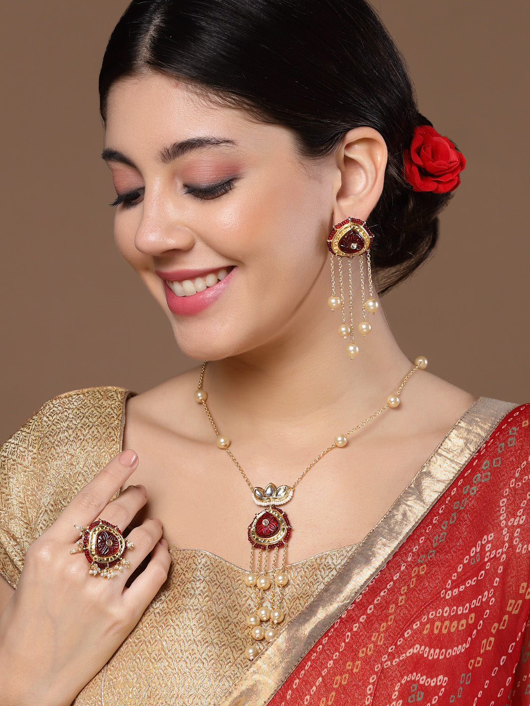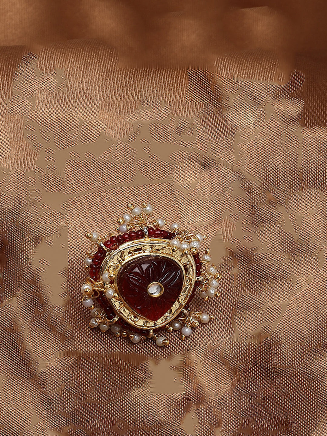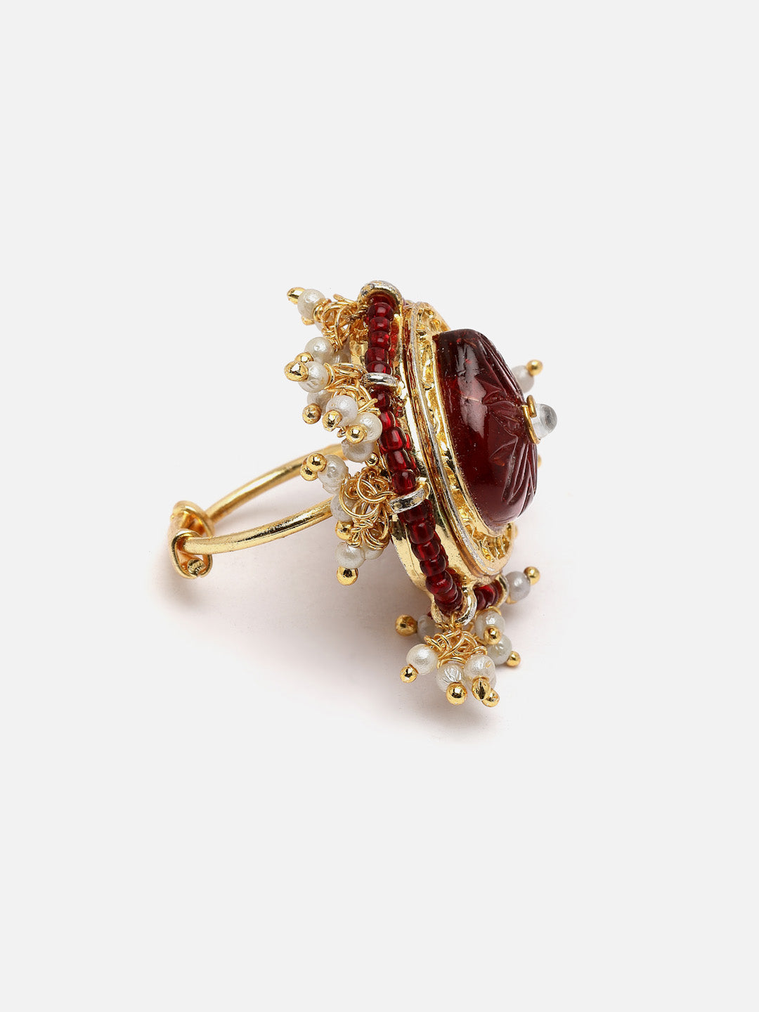 Red Kundan Carving Ring; Category Of Jewellery Is Hand Jewellery; Sub Category Is Ring; Ideal For Women; Color Is Maroon, Cream, Gold; Gemstones Used - Kundan, Pearls, Natural Stones; Plating Is Gold-Plated; Base Metal Is Alloy; Other Material Used - Adjustable Ring; Size Is Freesize; Adjustable - Yes ; Weight Is 12 Gms; Mesaurements - Length Of Ring =3 Cm; Width Of Ring = 4 Cm; Diameter Of Ring =1.65 Cm; Circumference Of Ring = 5.18 Cm; Adjustable - Yes ; Content 1 Ring