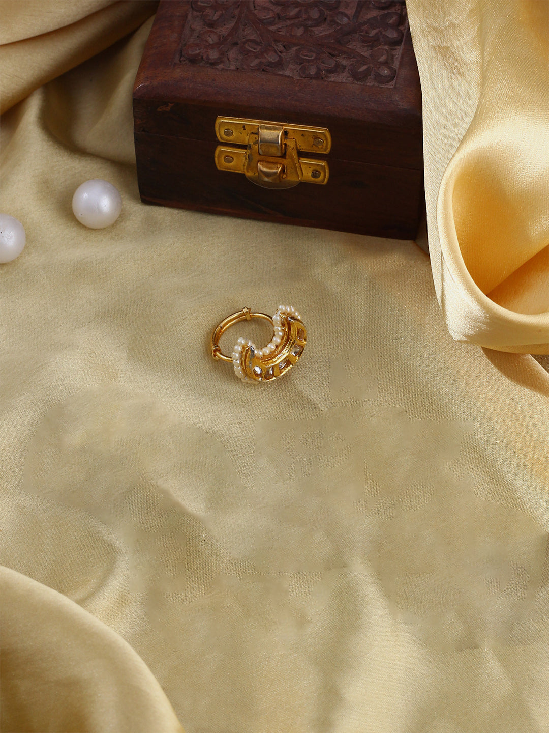 White And Gold Chand Ring; Category Of Jewellery Is Hand Jewellery; Sub Category Is Ring; Ideal For Women; Color Is Cream, Gold, White; Gemstones Used - Kundan, Pearls, Natural Stones; Plating Is Gold-Plated; Base Metal Is Alloy; Other Material Used - Adjustable Ring; Size Is Freesize; Adjustable - Yes ; Weight Is 10 Gms; Mesaurements - Length Of Ring =4 Cm; Width Of Ring = 4 Cm; Diameter Of Ring =1.65 Cm; Circumference Of Ring = 5.18 Cm; Adjustable - Yes ; Content 1 Ring