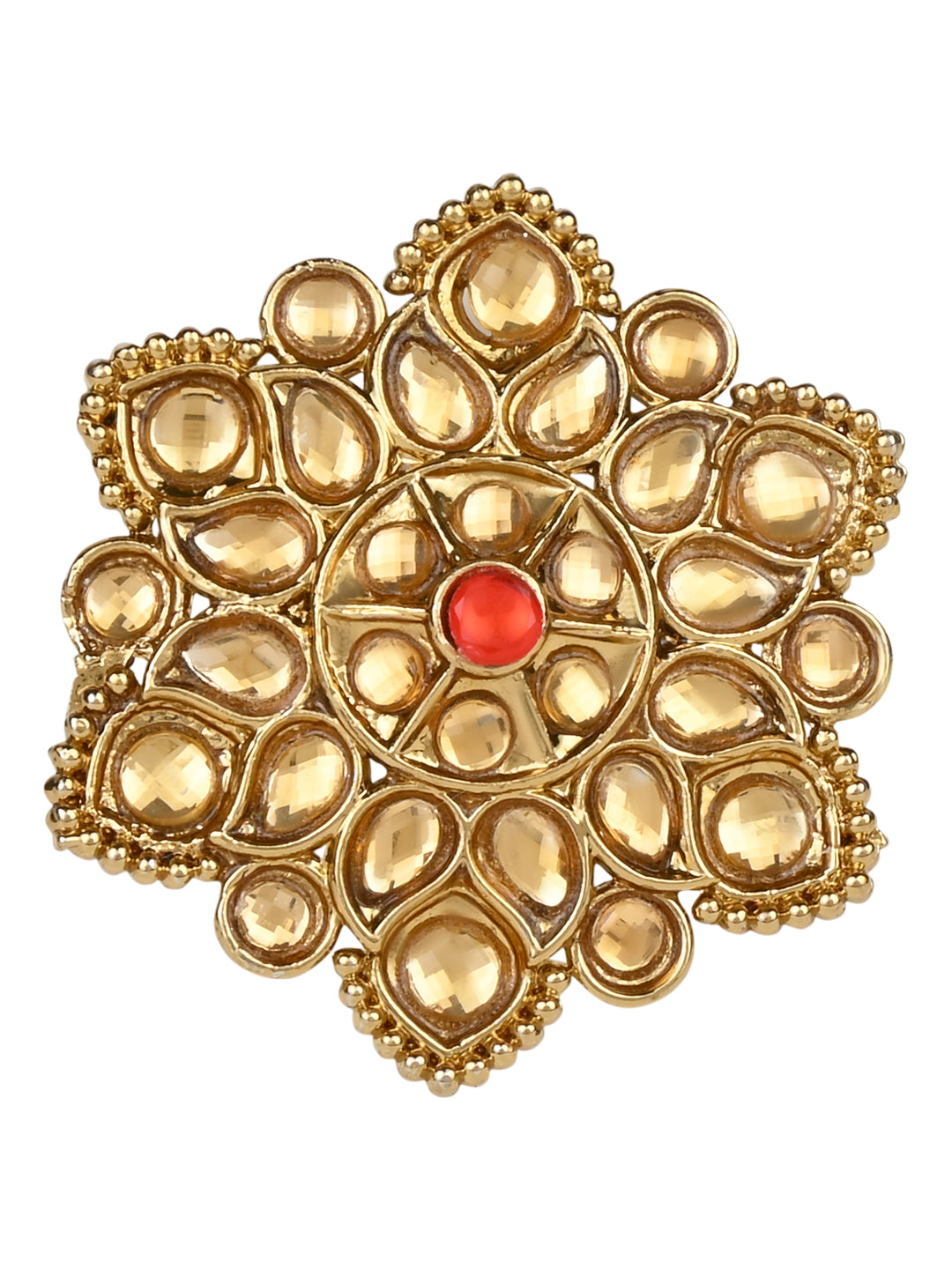 This Adjustable Ring Is Intricately Crafted In 18K Gold Plating & Based On Brass. It Is Glided With Uncut Polki Kundans And Beads. Style This Set With Your Ethnic Attire To Complete The Look.