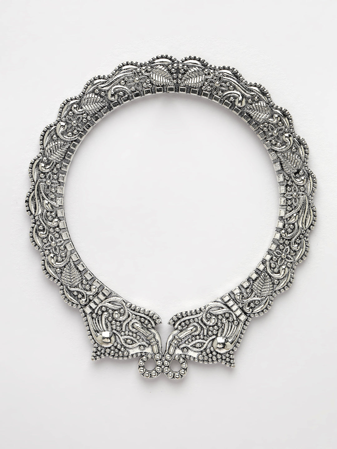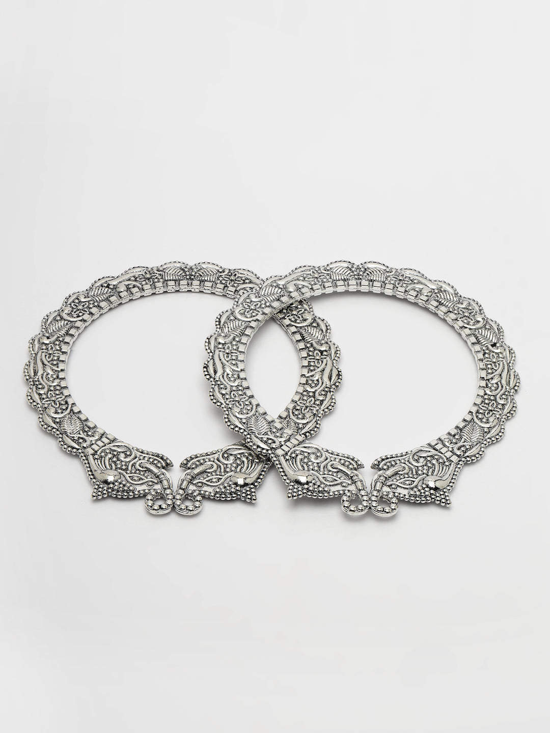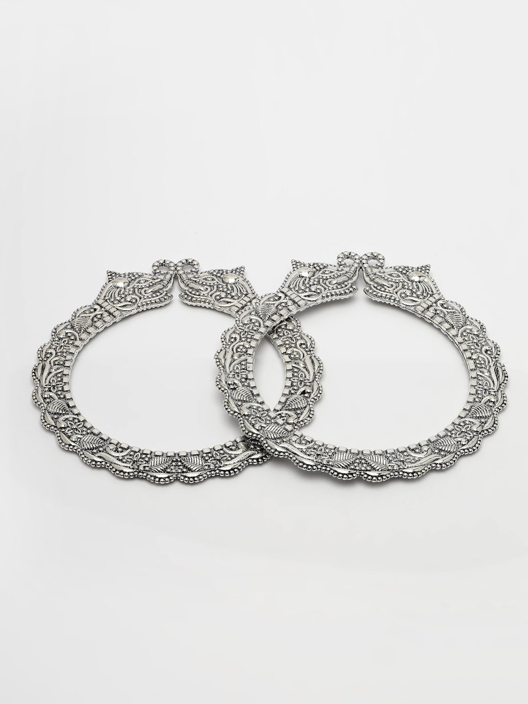 Style Note: Embrace the majestic allure of the elephant with the NVR Women Set of 2 Silver-Toned German Silver Oxidised Elephant Design Handcrafted Bangles. These exquisite bangles are a celebration of intricate craftsmanship and cultural symbolism, featuring delicately handcrafted elephant motifs intricately oxidized to perfection. The silver-toned finish adds a touch of elegance, making these bangles the perfect accessory for both casual and formal occasions. Whether you're attending a cultural festival or simply adding a touch of exotic charm to your everyday ensemble, these handcrafted bangles are sure to make a statement. Embrace the grace and strength of the elephant and let your style shine with these stunning pieces adorning your wrists.