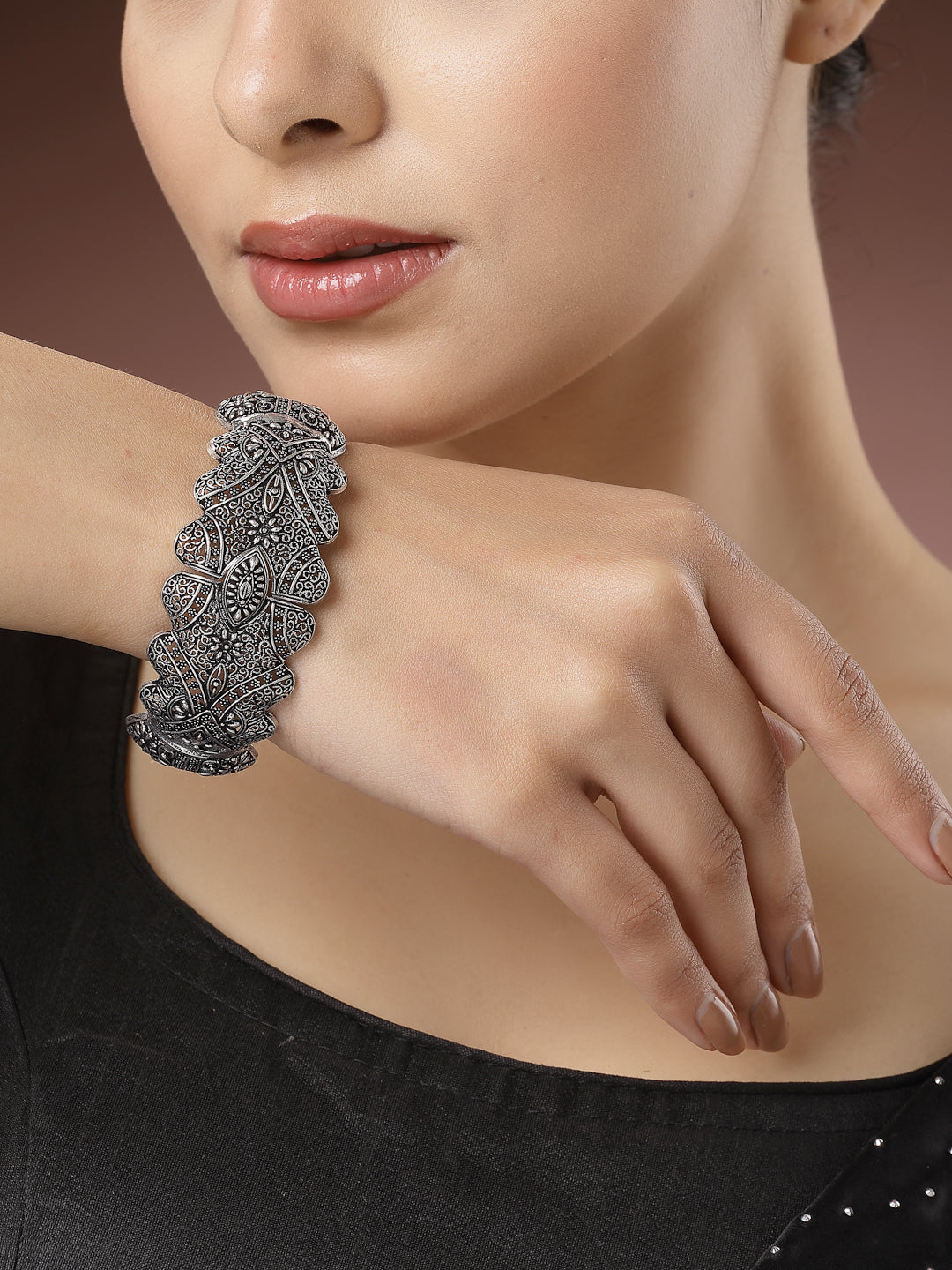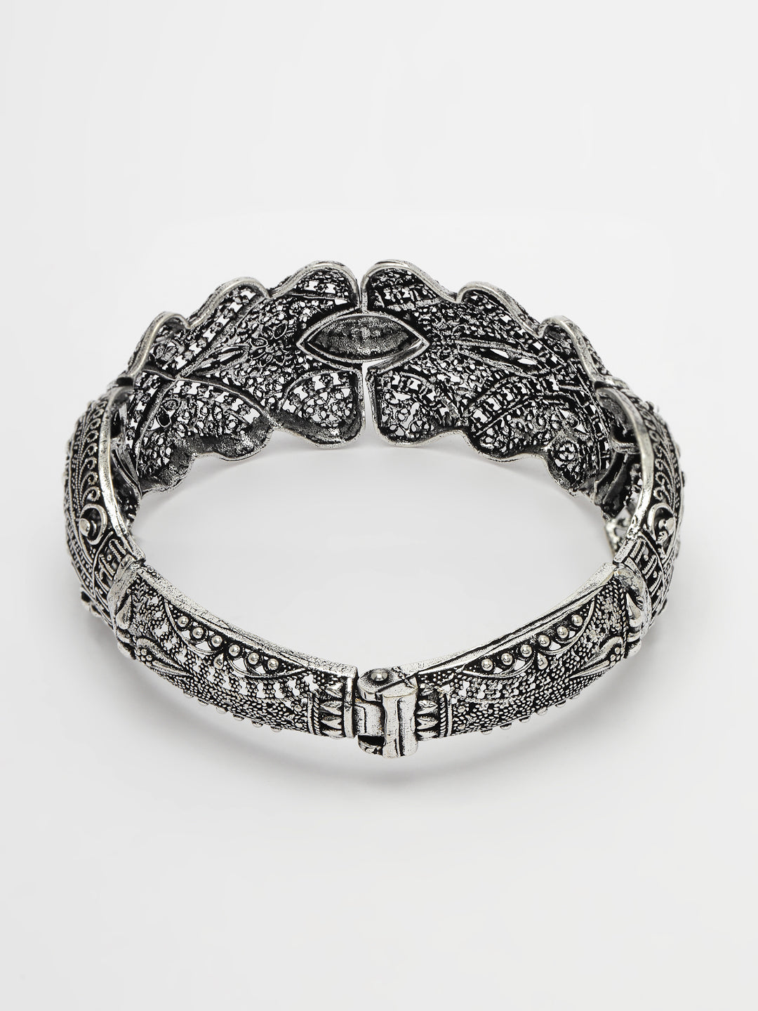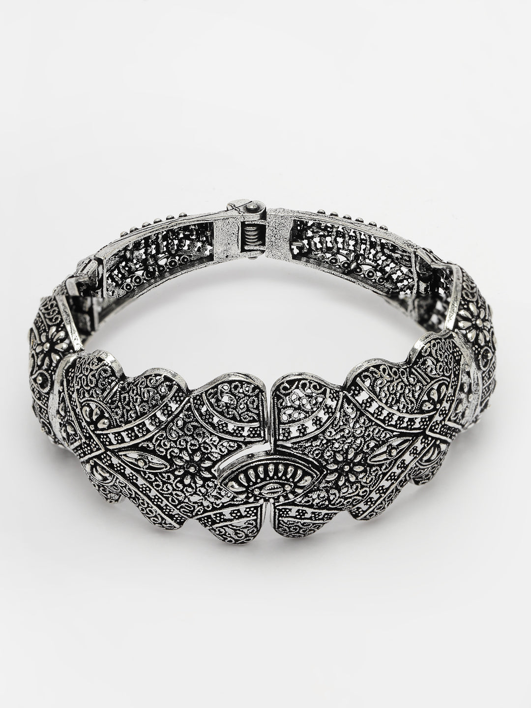 Style Note: Add a touch of sophistication to your ensemble with the NVR Women Silver-Toned German Silver Oxidised Cuff Bangle. Crafted with meticulous attention to detail, this bangle features intricate oxidised detailing that exudes elegance and charm. The silver-toned hue adds versatility, allowing this cuff bangle to effortlessly complement a wide range of outfits. Whether you're dressing up for a special occasion or adding a subtle accent to your everyday look, this oxidised cuff bangle is sure to elevate your style with its understated beauty. Embrace its timeless appeal and let it become a cherished piece in your accessory collection, enhancing every outfit with its graceful allure.