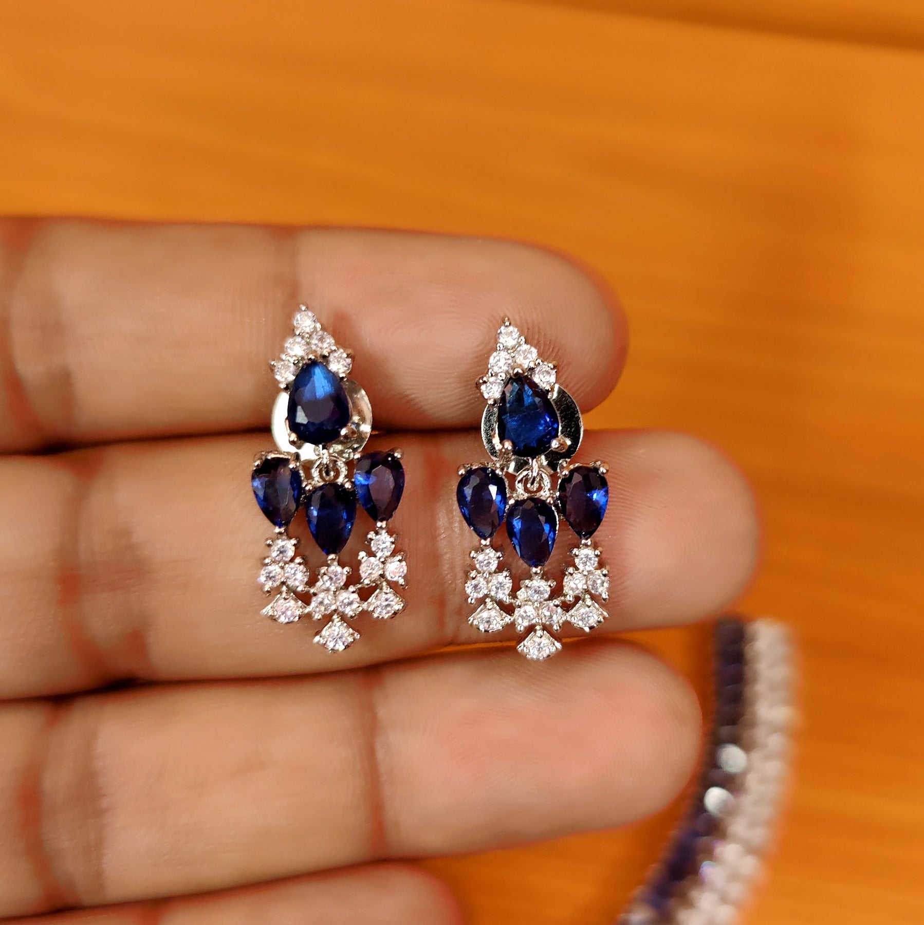 Blue Sapphire Diamond Look Cz Necklace Set This Blue Sapphire & Cz Necklace Set Is Handcrafted In Silver & Brass Alloy With Imitation Blue Colour Stones And American Diamond Stones Of Very Fine Quality. This Gorgeous Necklace Set Is Plated With Fine Nickle Free 18 Kt White Gold Rhodium To Avoid Any Allergies To The Skin And The Matching Earrings Are Very Light In Weight. All Our Jewellery Is Packed With Bubble Wrap Inside Corrugated Boxes To Prevent Any Damage To The Jewellery And Every Jewellery Piece Goes Through A Strict Quality Check Before Sending Out To The Customers.Color :Blue Base_Material :Brass Plating :White Gold Gemstones :Sapphire  Package Details :1 Necklace : 1 Pair Of Earrings Occasion :Wedding height_in_mm :29 width_in_mm :13 width_in_cms :1.5 Care Instruction :Store in a separate box. Keep away from fragrance and water.