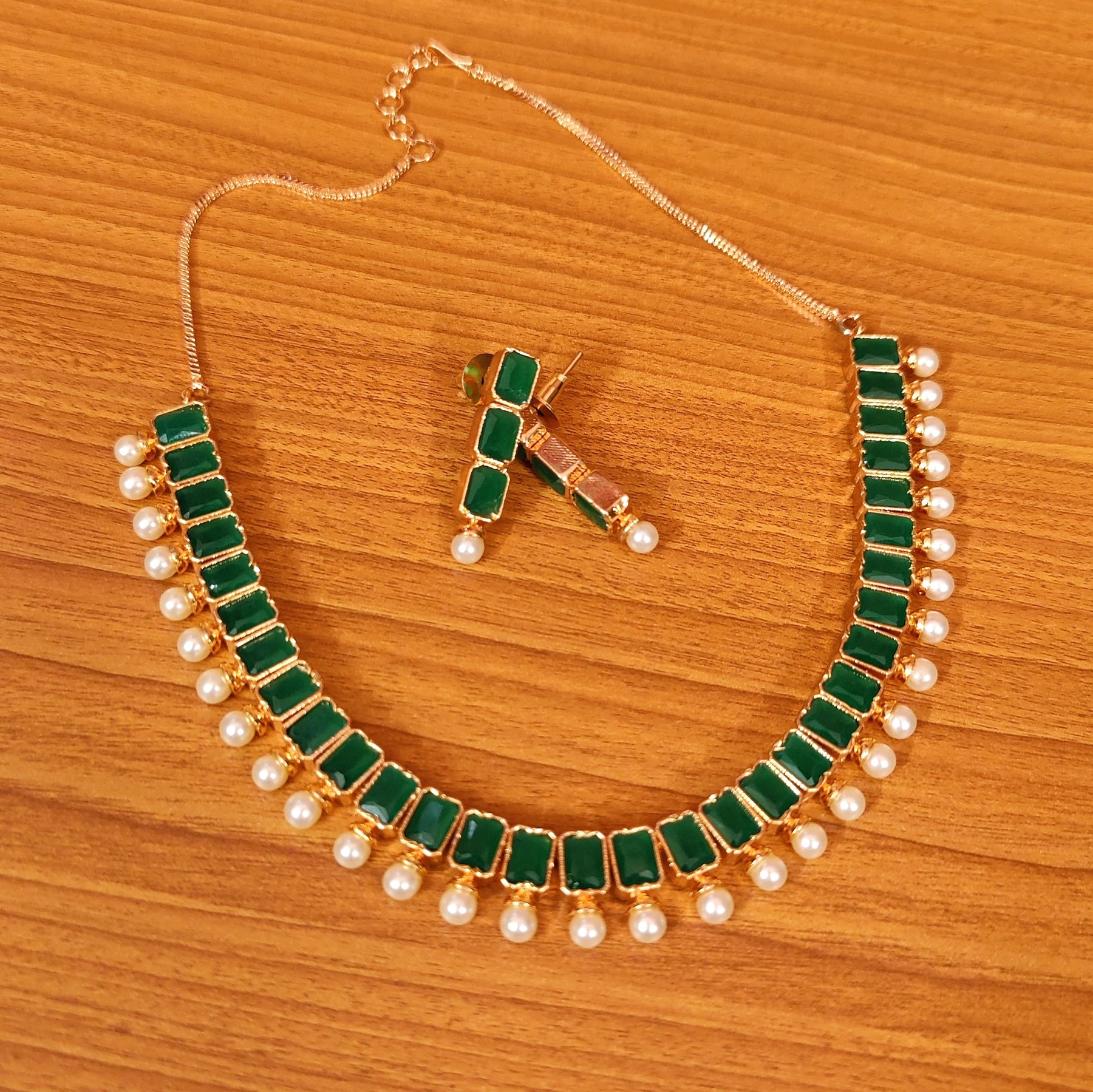 Emerald & Pearl Gold Plated Cz Necklace Set This Emerald Colour Necklace Set Is Handcrafted In Silver & Brass Alloy With Imitation Emerald Colour Stones And Pearl Stones Of Very Fine Quality. This Gorgeous Necklace Set Is Plated With Fine Nickle Free 18 Kt Gold Rhodium To Avoid Any Allergies To The Skin And The Matching Earrings Are Very Light In Weight. All Our Jewellery Is Packed With Bubble Wrap Inside Corrugated Boxes To Prevent Any Damage To The Jewellery And Every Jewellery Piece Goes Through A Strict Quality Check Before Sending Out To The Customers.Color :Green Base_Material :Brass Plating :Yellow Gold Gemstones :Emerald  Package Details :1 Necklace : 1 Pair Of Earrings Occasion :Wedding height_in_mm :33 width_in_mm :7 width_in_cms :1.5 Care Instruction :Store in a separate box. Keep away from fragrance and water.