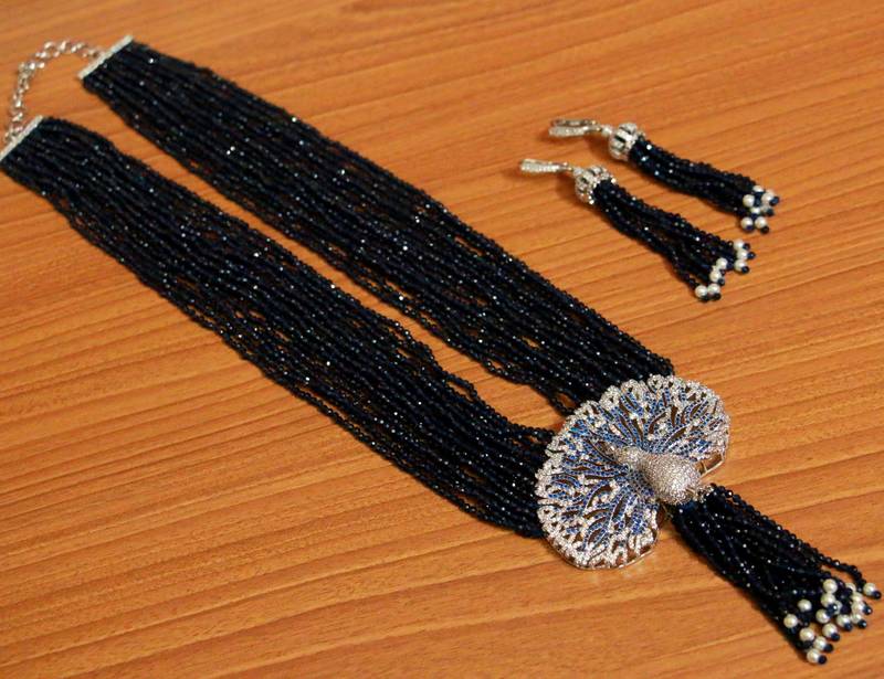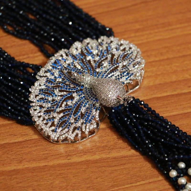 This Diamond Look Peacock Pendant Necklace Set Is Handcrafted In Silver Alloy With Imitation Blue Crystal Beads Of Vey Fine Quality .The Necklace Set Is Crafted In The Same Finishing As Seen In Real Diamond Jewellery And Plated With 18Kt White Gold.