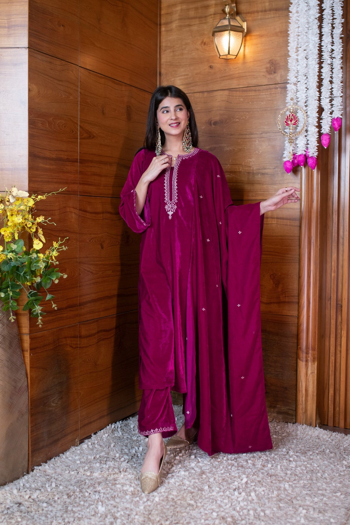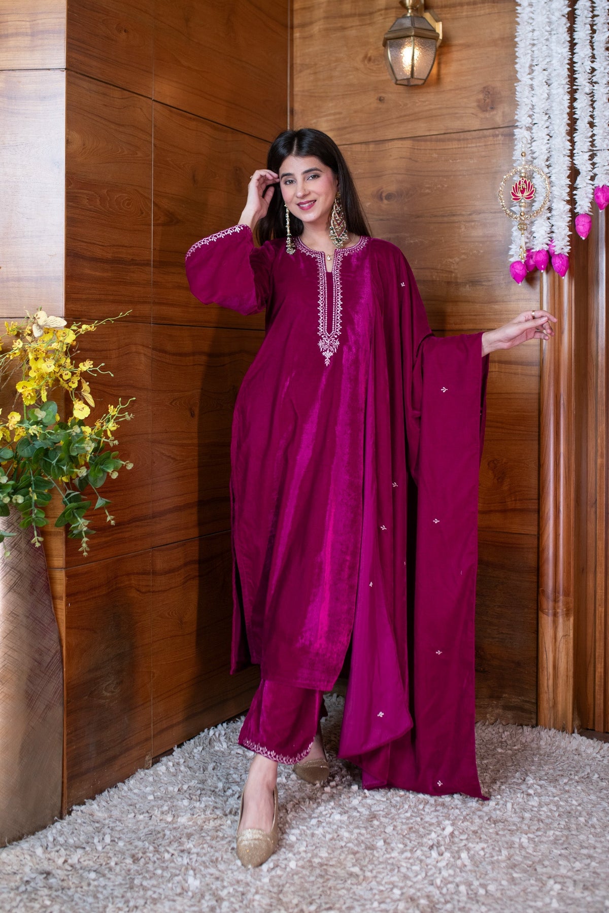 Women's Velvet Magenta Pink Embroidered Kurta Set