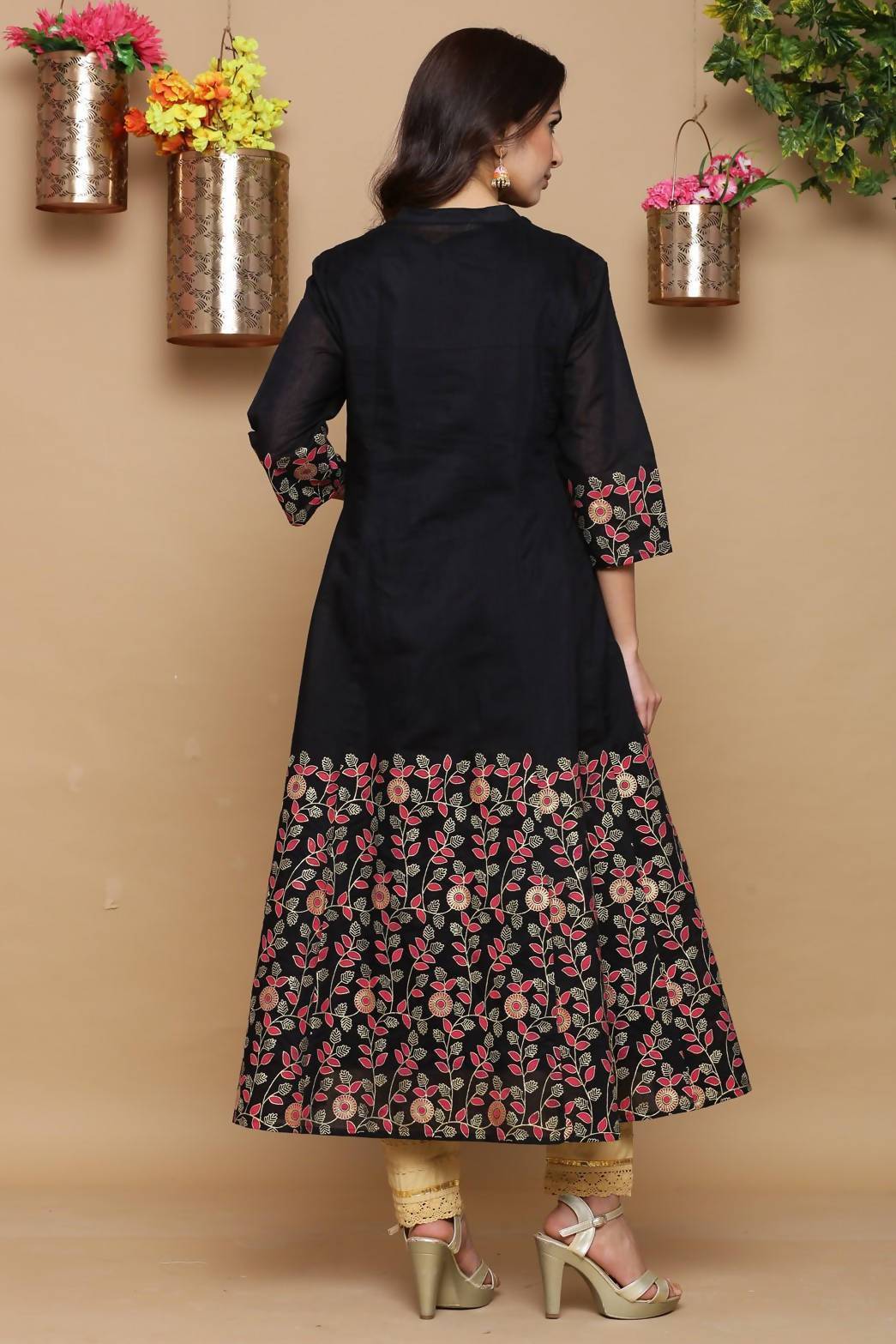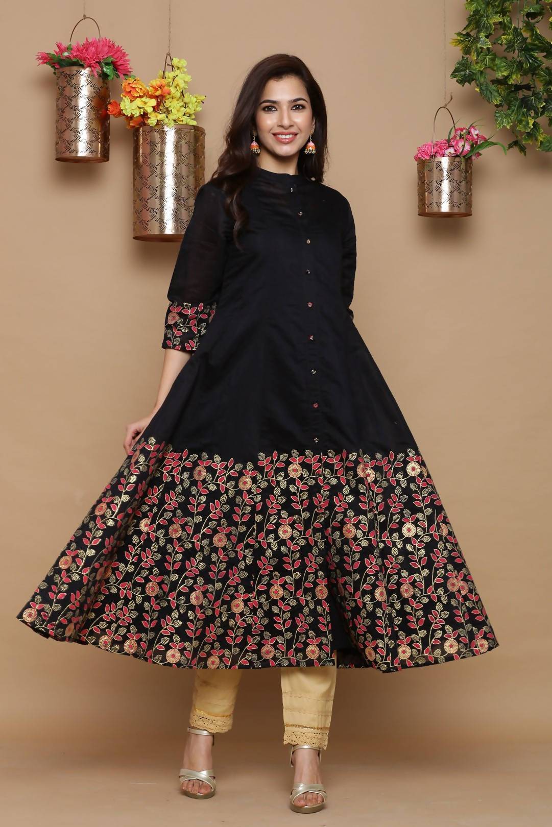Description :Juniper Black Chanderi Flared 2 Piece KurtaColor :BLACKFabric :Chanderi SilkPrint :PrintedPrint & Pattern Type :FloralHemline :FlaredSleeve Length (Inches) :16Sleeve :Three-Quarter SleevesSleeve Styling :Regular SleevesLength type :Calf LengthLength (Inches) :48Neck :Mandarin CollarShape :AnarkaliOrnamentation :Floral Emboss Prin tSurface styling :naClosure :ButtonsMaterial Transperency :OpaqueOccasion :FestiveWash care :Hand Wash